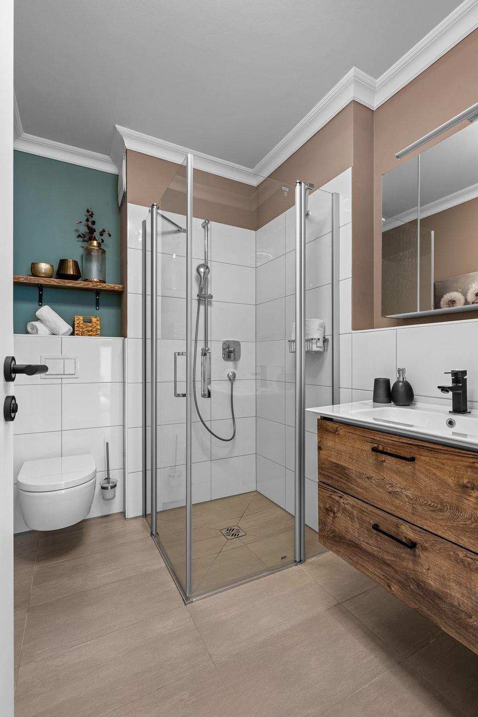 Beim Betreten empfängt Sie ein großzügiger Eingangsbereich mit Garderobe, Sitzbank und geräumigem Schrank. Von hier aus gelangen Sie in alle weiteren Räume der Wohnung. Der Wohnbereich überzeugt mit einem offenen Konzept, der einen Einklang von Wohnen, Essen und Entspannung schafft. Die moderne, voll ausgestattete Einbauküche, inklusive Induktionskochfeld und allen wichtigen Dingen wie Kaffeemaschine, Wasserkocher und Geschirrspüler, lädt Hobbyköche zum gemeinsamen Kochen ein.