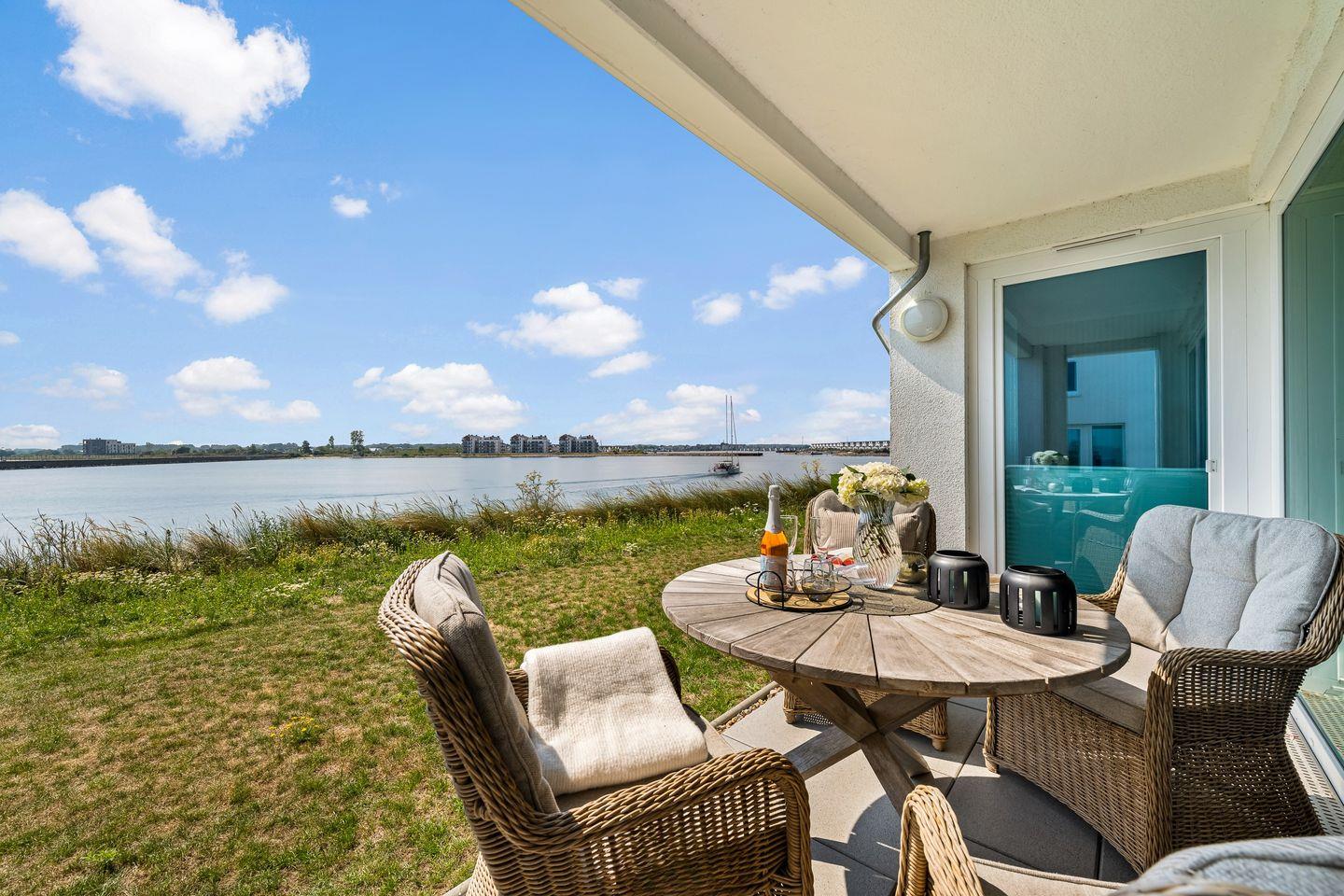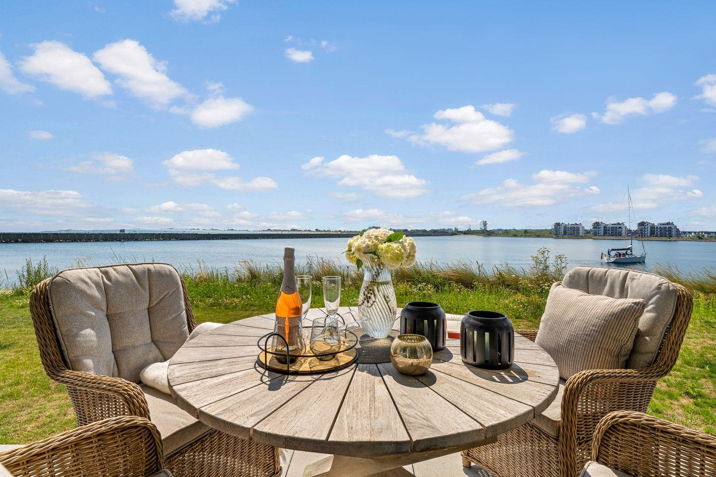 Die überdachte Terrasse ist gemütlich mit stylischen Loungemöbeln eingerichtet und bietet einen ungestörten Weitblick auf die Ostsee, den Hafen und bei guter Sicht bis zum Weidefelder Strand. Beobachten Sie Segelboote, Wildvögel, die wundervolle Natur und lassen Sie den Tag entspannt bei einem Sonnenuntergang ausklingen.