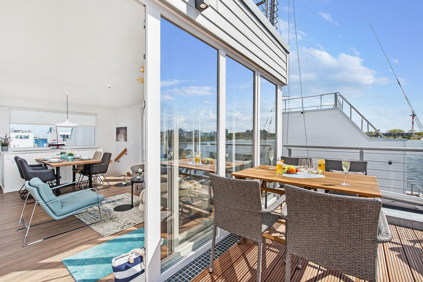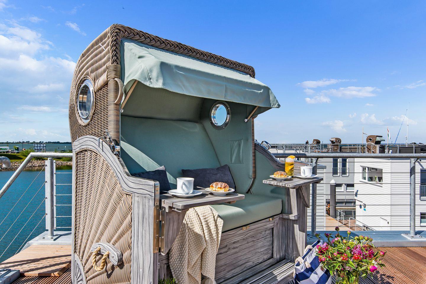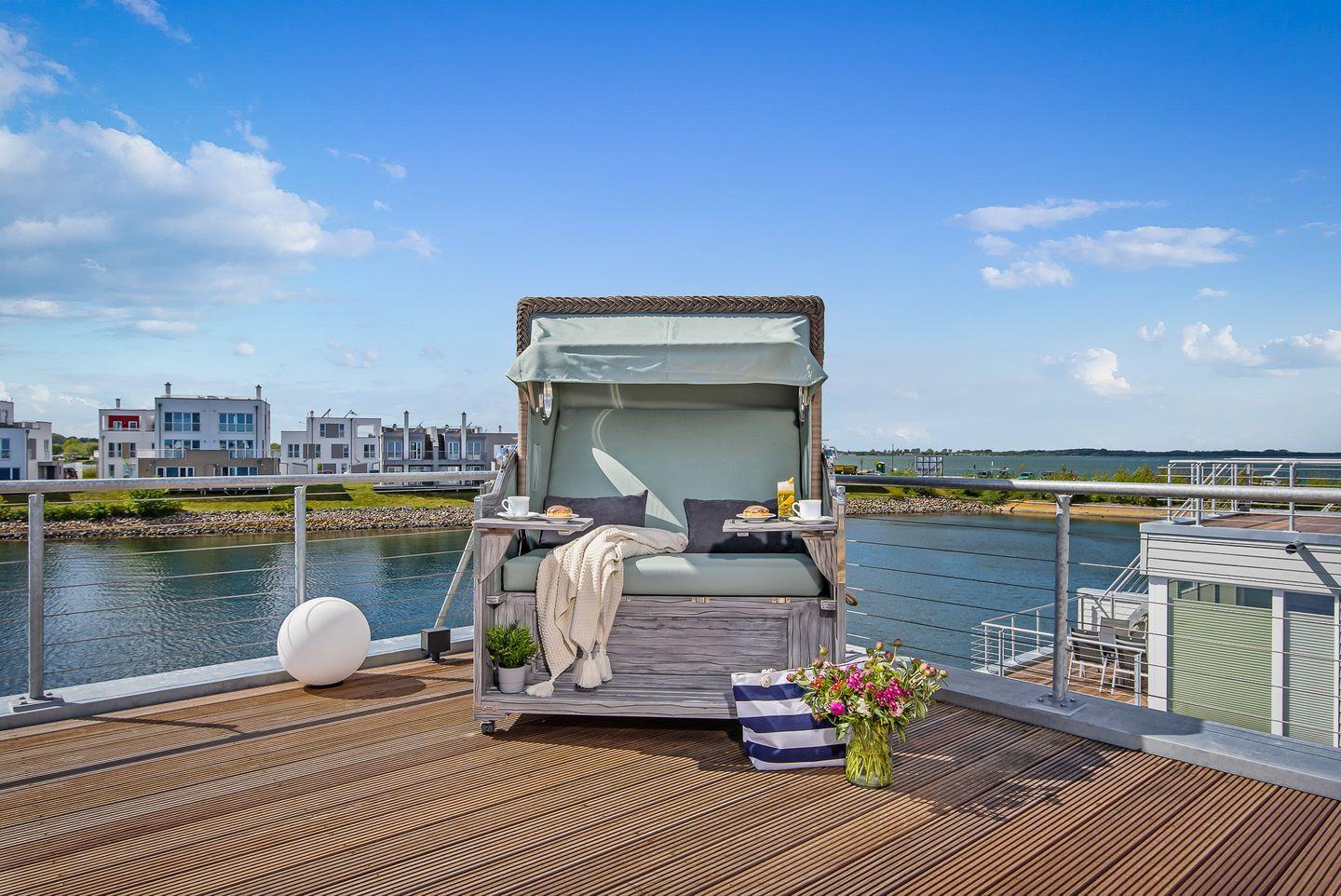 Modernes schwimmendes Ferienhaus, mit großer Dachterrasse, Strandkorb, finnischer Sauna, komfortabler Ausstattung, privatem Bootsanleger und freiem Blick auf das Hafenbecken, die Ostsee und Schleimünde
