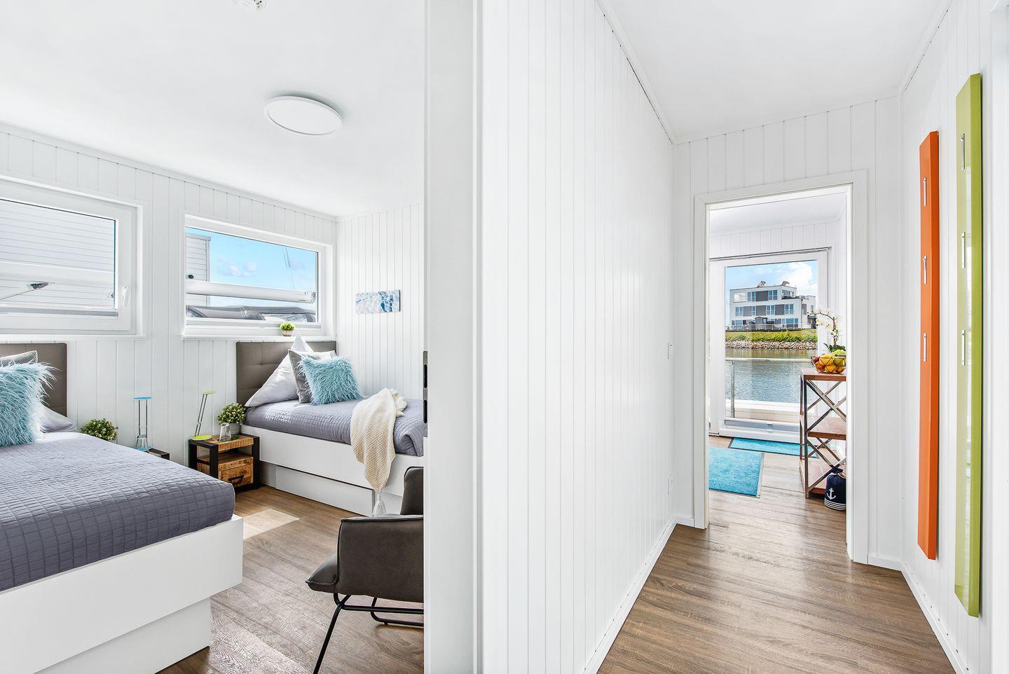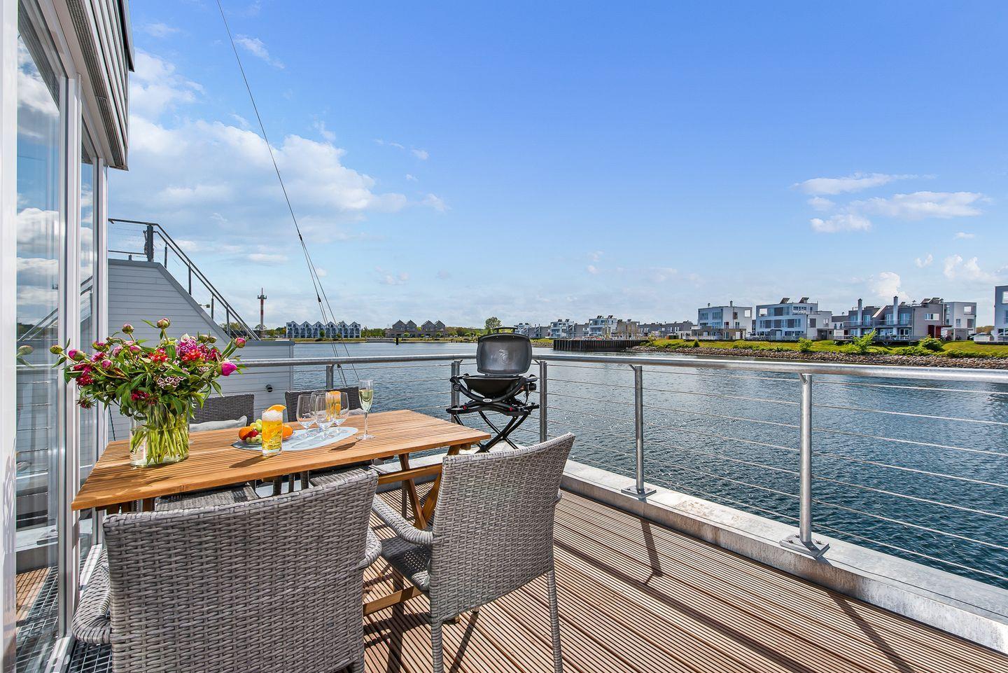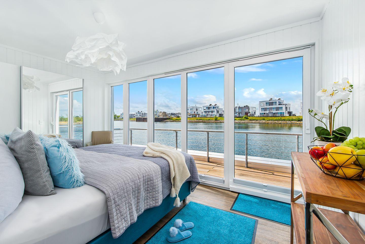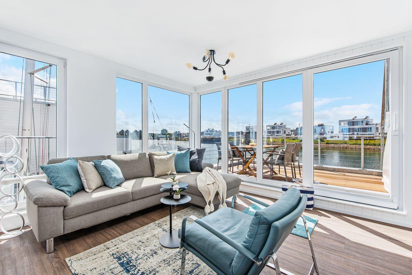 Modernes schwimmendes Ferienhaus, mit großer Dachterrasse, Strandkorb, finnischer Sauna, komfortabler Ausstattung, privatem Bootsanleger und freiem Blick auf das Hafenbecken, die Ostsee und Schleimünde