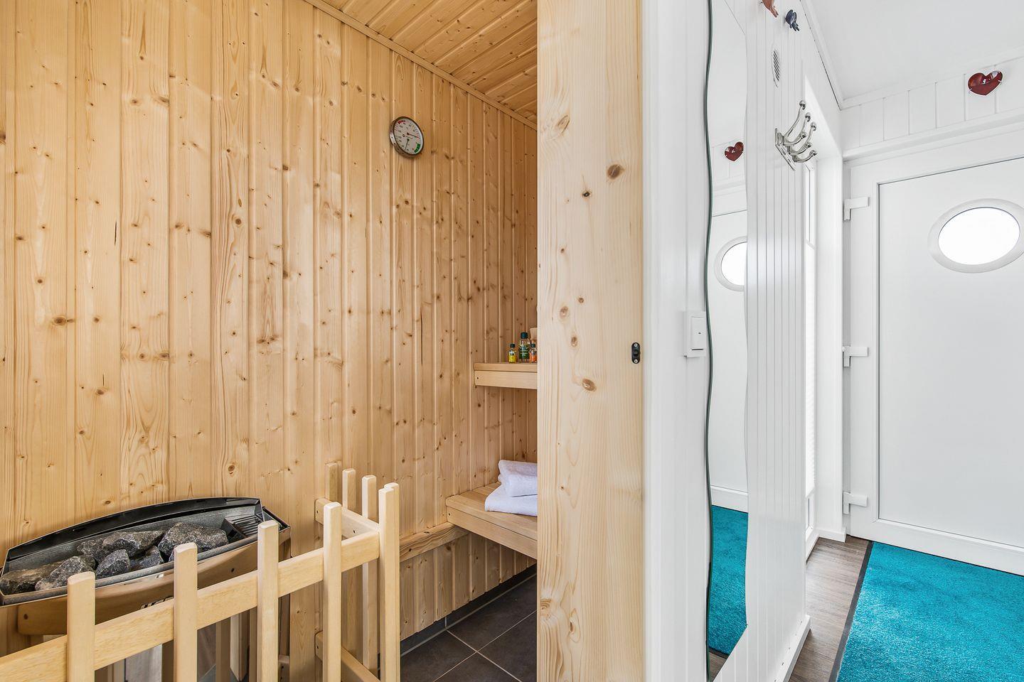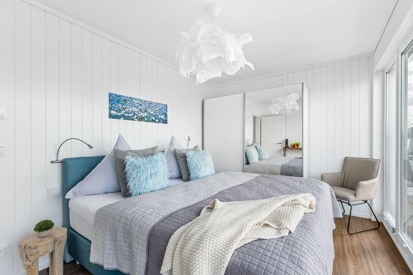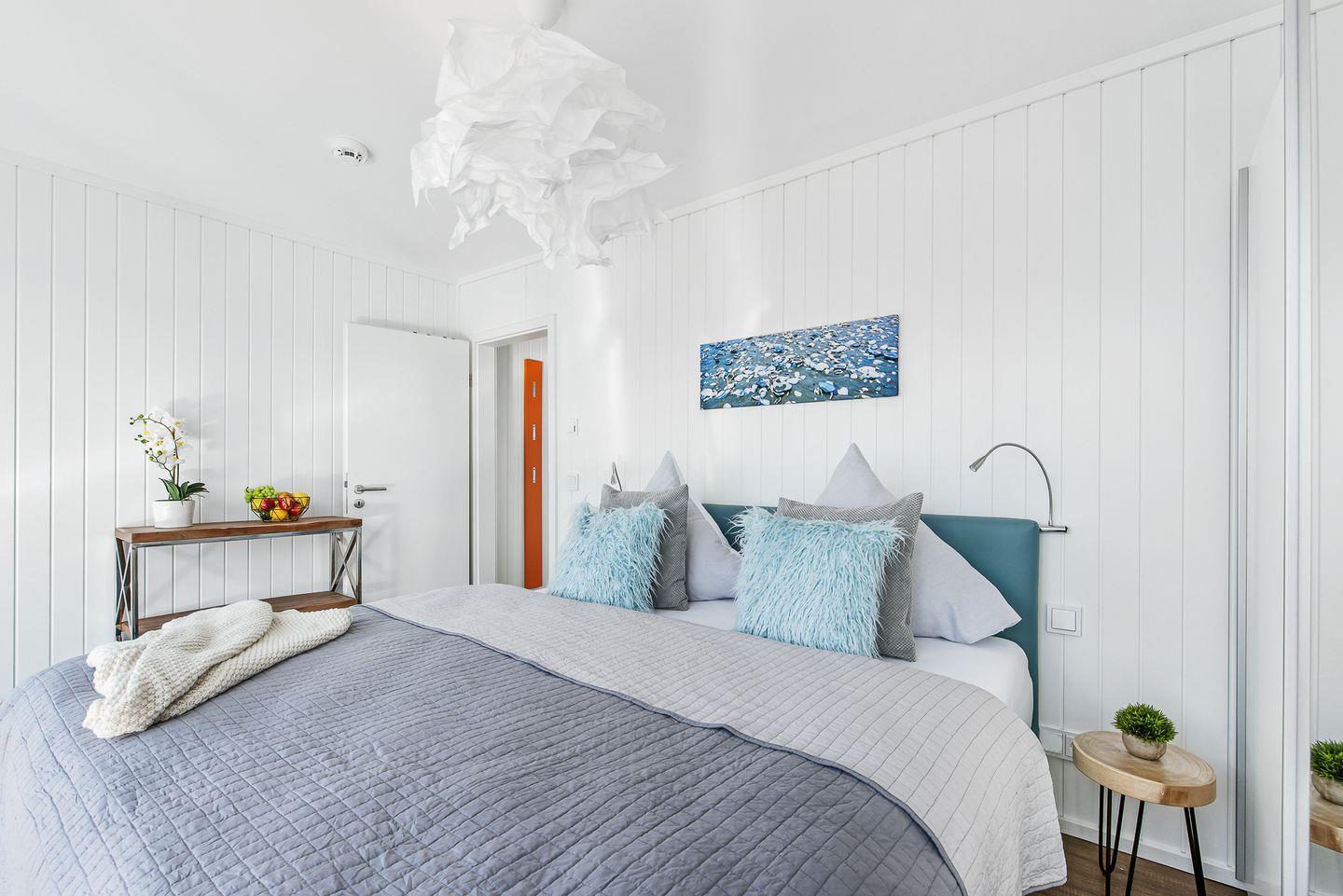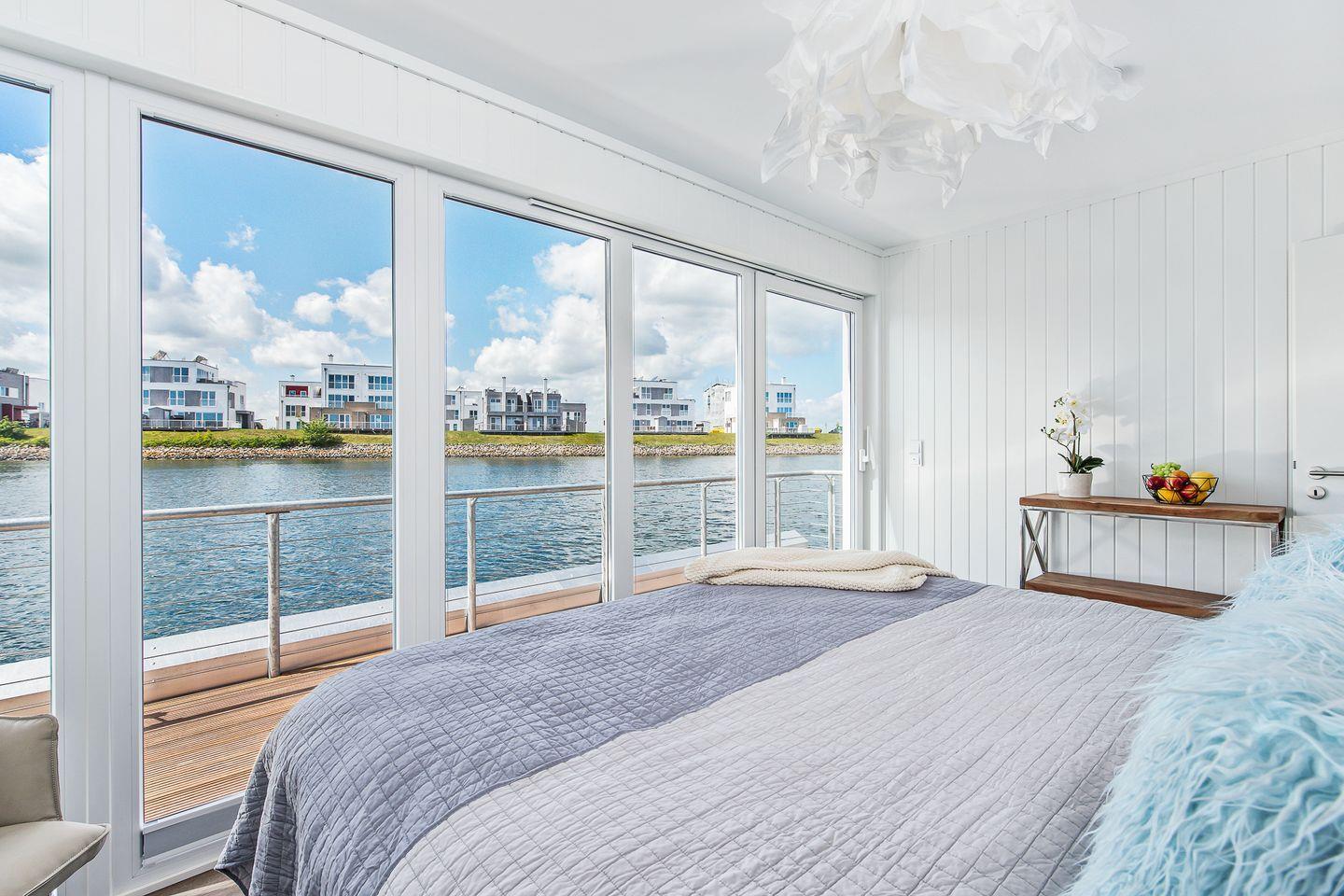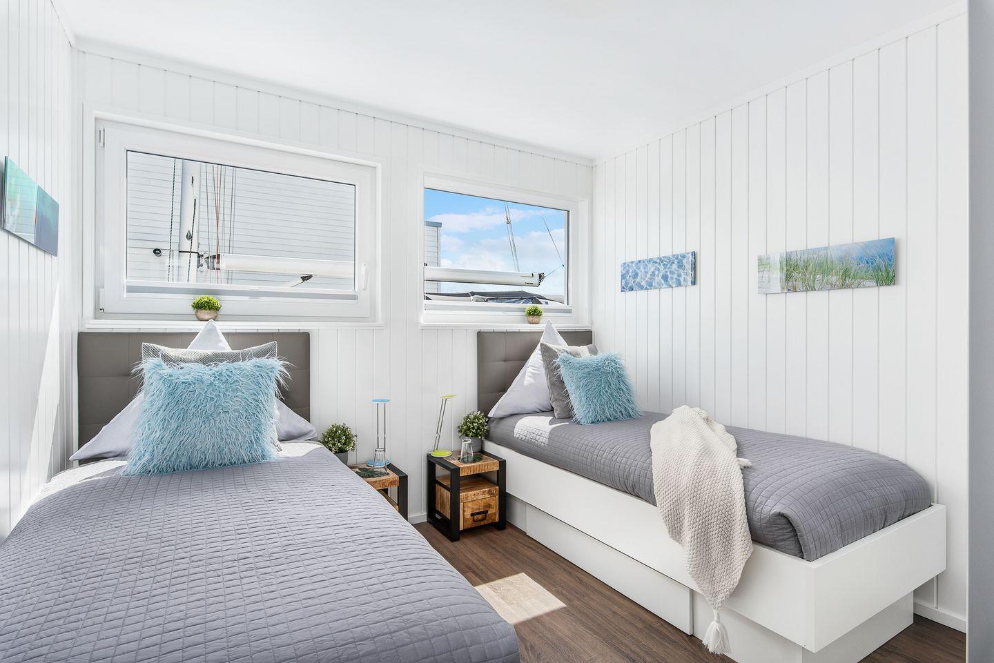Im Obergeschoss befindet sich der lichtdurchflutete Wohnbereich mit gemütlicher Couch, moderner Küche und angrenzender Terrasse. Eine Etage höher erreichen Sie die spektakuläre Dachterrasse mit Loungemöbeln und Weber-Grill. Unten im Erdgeschoss liegen die Schlafzimmer. Das große Boxspringbett im Hauptschlafzimmer steht mit Blick aufs Wasser für traumhafte Nächte mit Wellenrauschen. Das zweite Schlafzimmer ist flexibel mit zwei Einzelbetten ausgestattet. Auch hier: überall Wasserblick. Selbst aus der Sauna.