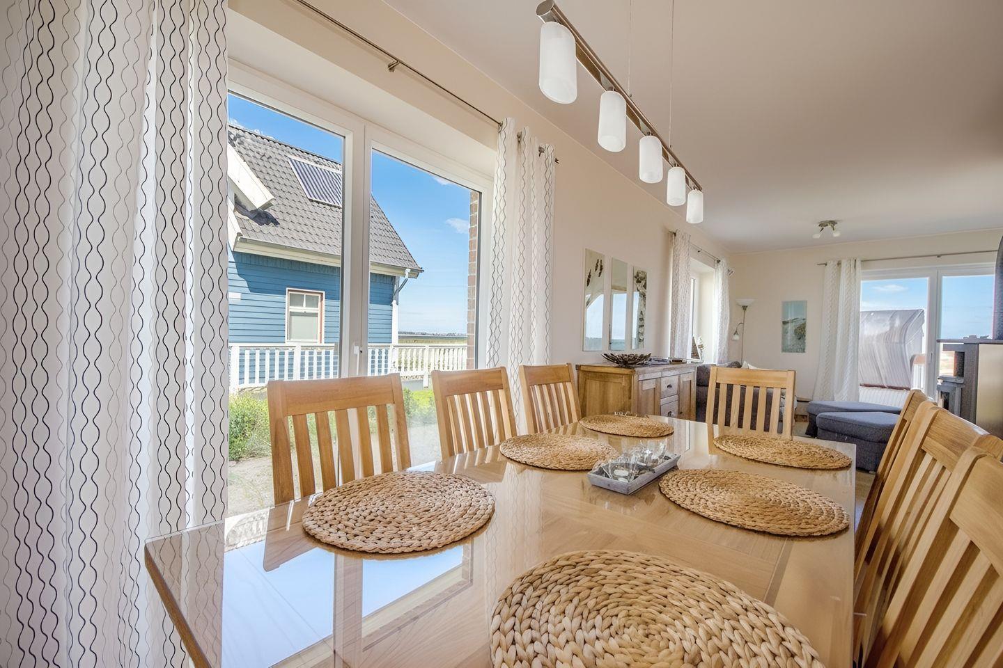 Im offenen Wohnbereich erwartet Sie ein gemütliches Wohnzimmer mit Kaminofen, der zusätzliche Behaglichkeit auch an kühleren Tagen garantiert. Für Unterhaltung sorgen ein moderner Smart-TV, eine HiFi-Anlage sowie ein Blu-ray-Player. Die offene Küche ist hochwertig ausgestattet und verfügt unter anderem über Backofen, Herd, Kühlschrank mit Gefrierfach, Spülmaschine, Mikrowelle, Toaster, Kaffeemaschine, Wasserkocher und umfassende Küchenutensilien. Im angrenzenden Essbereich finden alle Gäste bequem Platz am Esstisch.