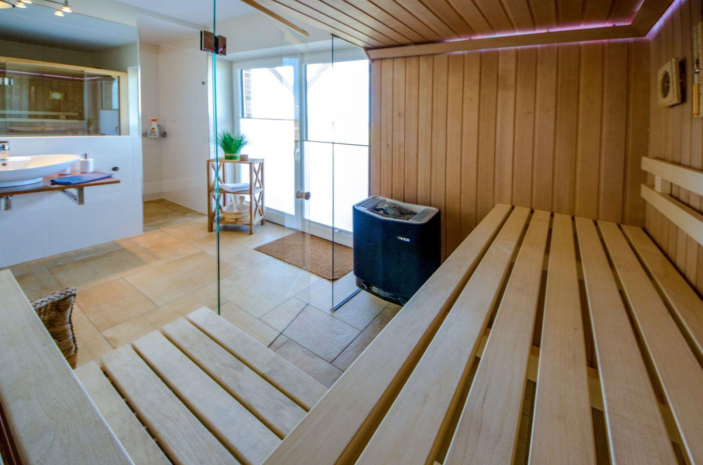 Das Wellnessangebot des Hauses umfasst eine hauseigene Sauna zur exklusiven Eigennutzung – ein Highlight für erholsame Stunden nach einem Strandtag oder sportlicher Betätigung. Im Außenbereich laden eine große Terrasse, ein möblierter Garten, Grill, Gartenhaus sowie zwei Strandkörbe zum Verweilen ein. Der Balkon bietet einen weiteren Rückzugsort mit Blick auf das Meer.
