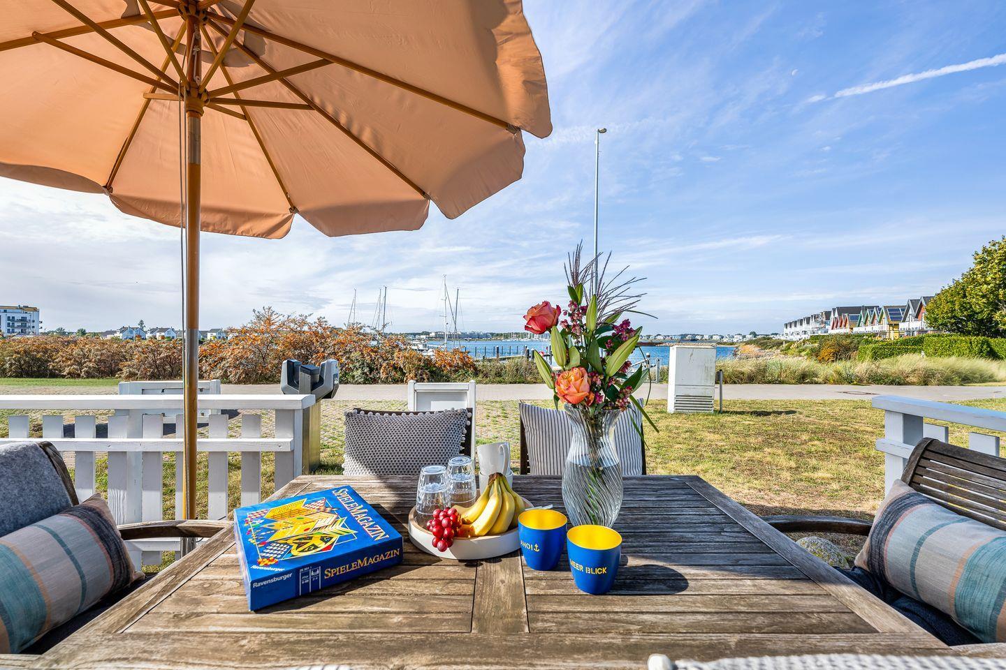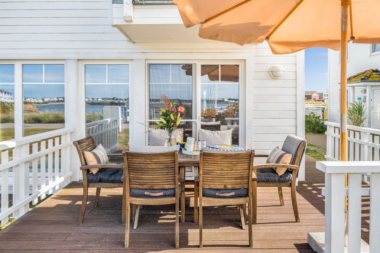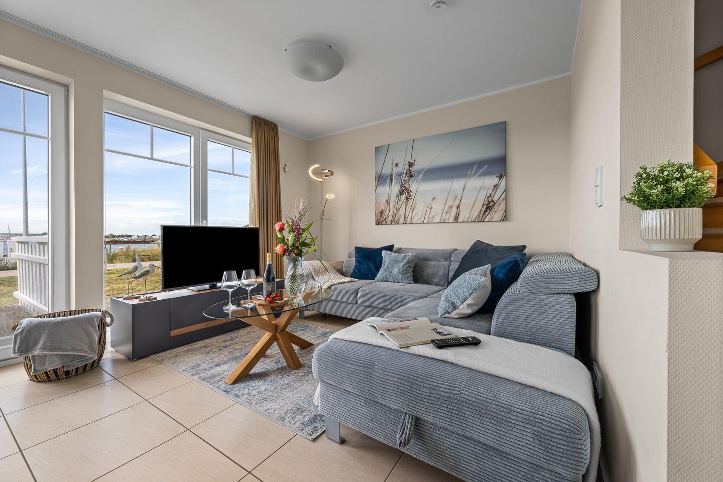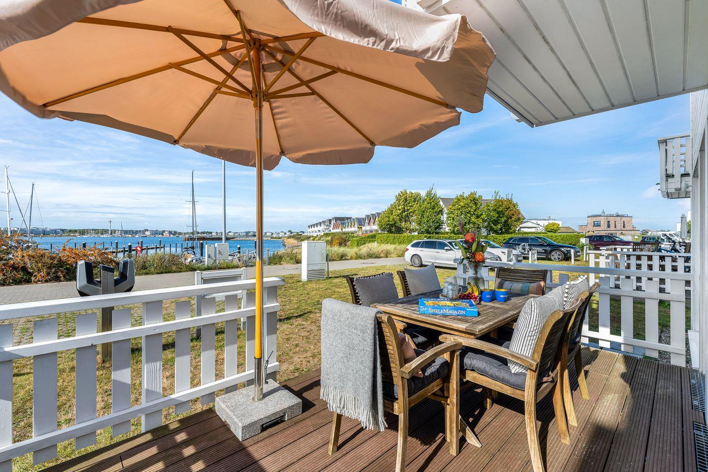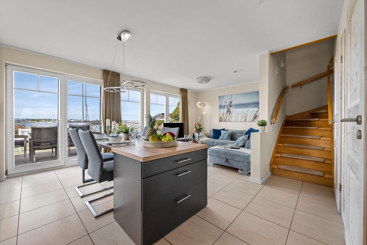 Das Herzstück von Marina Sands ist der helle Wohn- und Essbereich im Erdgeschoss. Durch bodentiefe Fenster fällt der Blick ungehindert auf das türkisblaue Wasser der Marina. Das gemütliche Sofa lädt zu entspannten Stunden ein. Ob mit einem guten Buch, bei einem Film oder einfach beim Beobachten der vorbeiziehenden Segelboote. Von hier aus treten Sie direkt auf die Terrasse, die mit ihrem maritimem Fair für ausgiebige Genussmomente sorgt. Ein Frühstück mit Sand unter den Füßen oder ein Glas Wein beim Abendlicht. Beides ist hier nur ein paar Schritte entfernt.