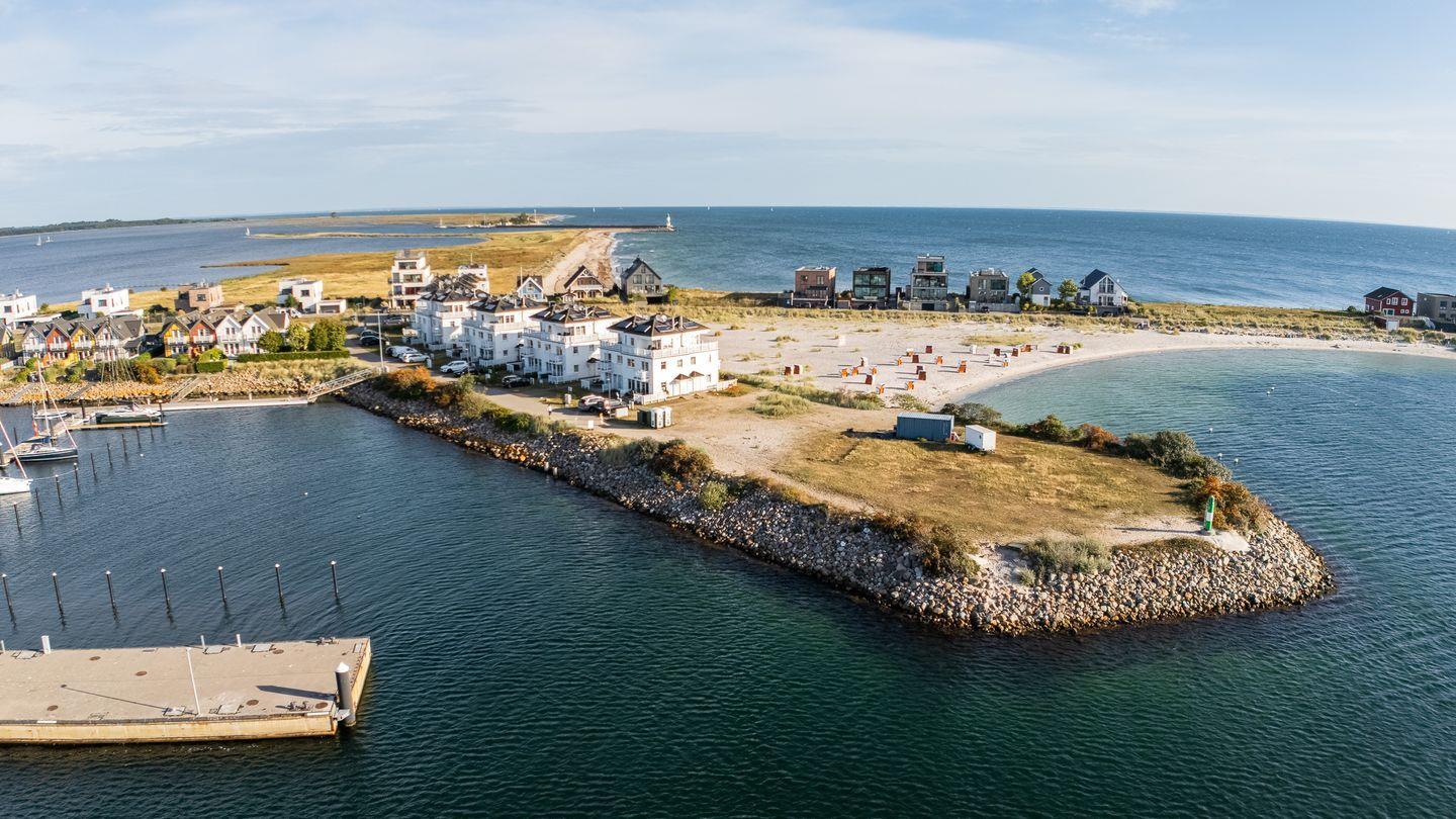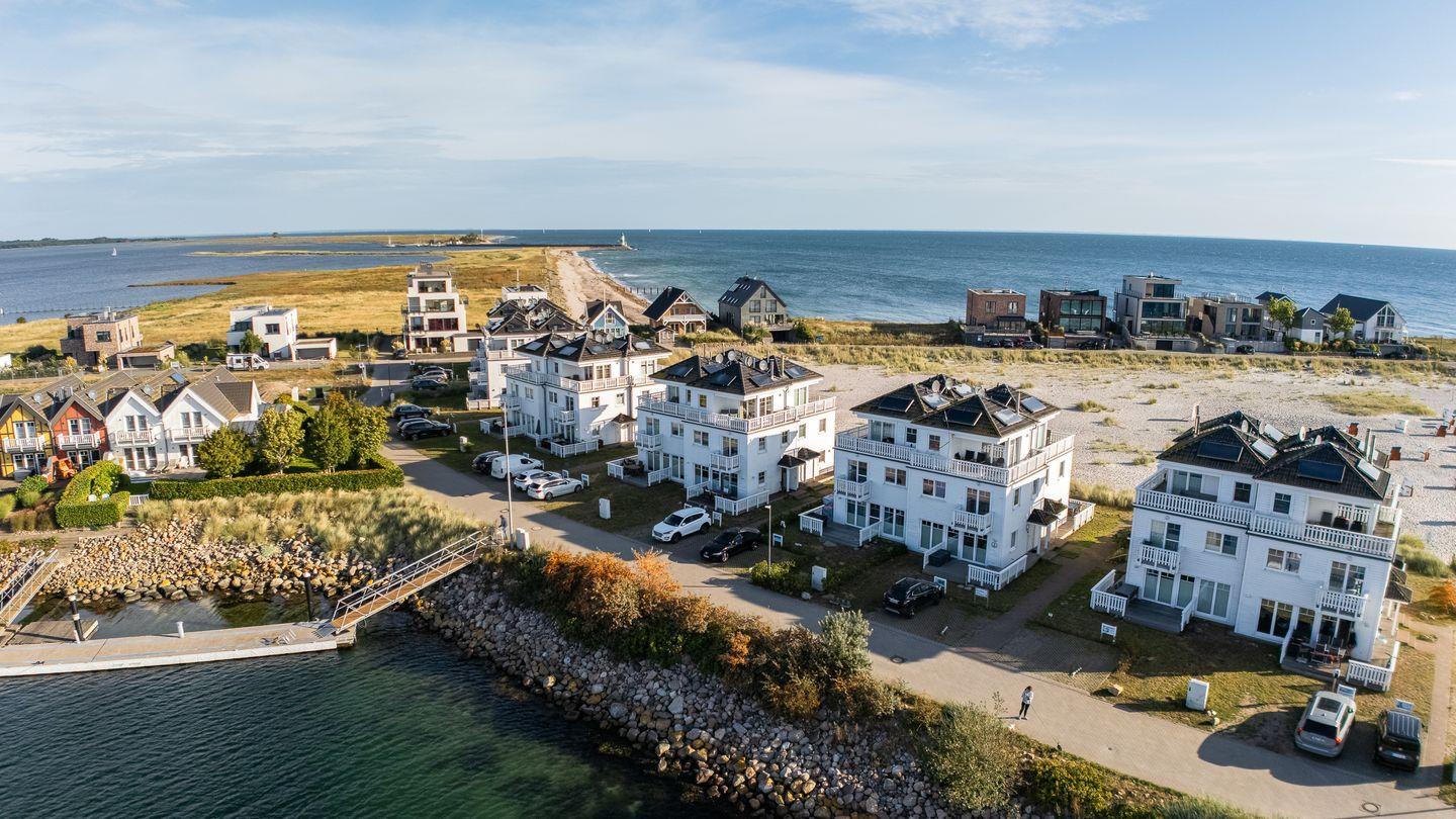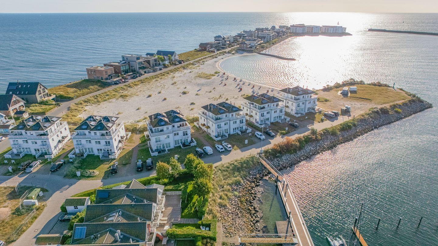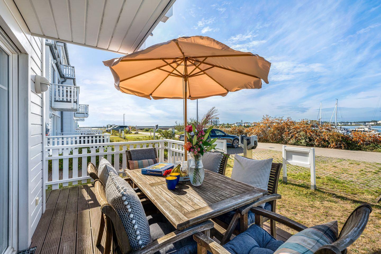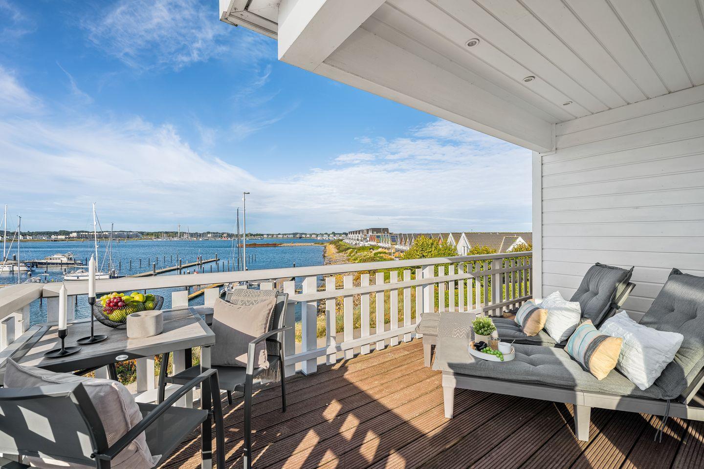 Das Herzstück von Marina Sands ist der helle Wohn- und Essbereich im Erdgeschoss. Durch bodentiefe Fenster fällt der Blick ungehindert auf das türkisblaue Wasser der Marina. Das gemütliche Sofa lädt zu entspannten Stunden ein. Ob mit einem guten Buch, bei einem Film oder einfach beim Beobachten der vorbeiziehenden Segelboote. Von hier aus treten Sie direkt auf die Terrasse, die mit ihrem maritimem Fair für ausgiebige Genussmomente sorgt. Ein Frühstück mit Sand unter den Füßen oder ein Glas Wein beim Abendlicht. Beides ist hier nur ein paar Schritte entfernt.