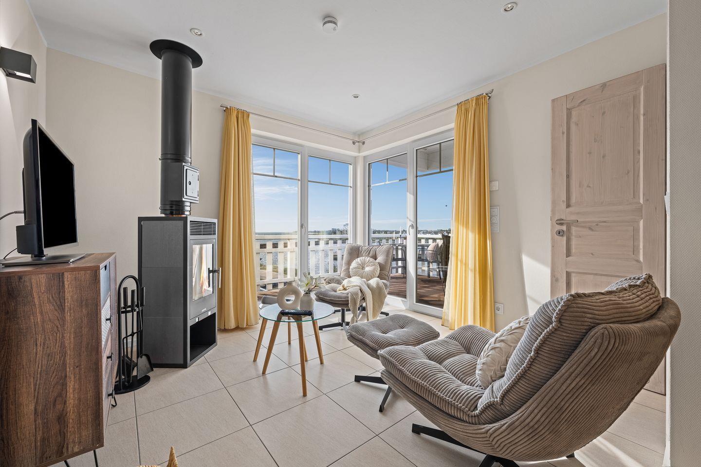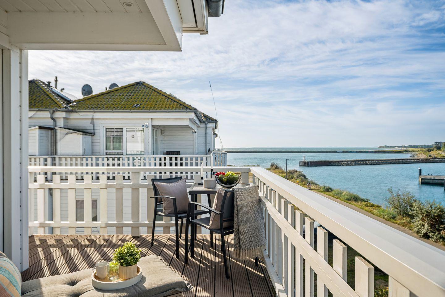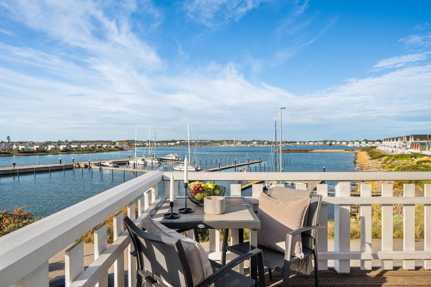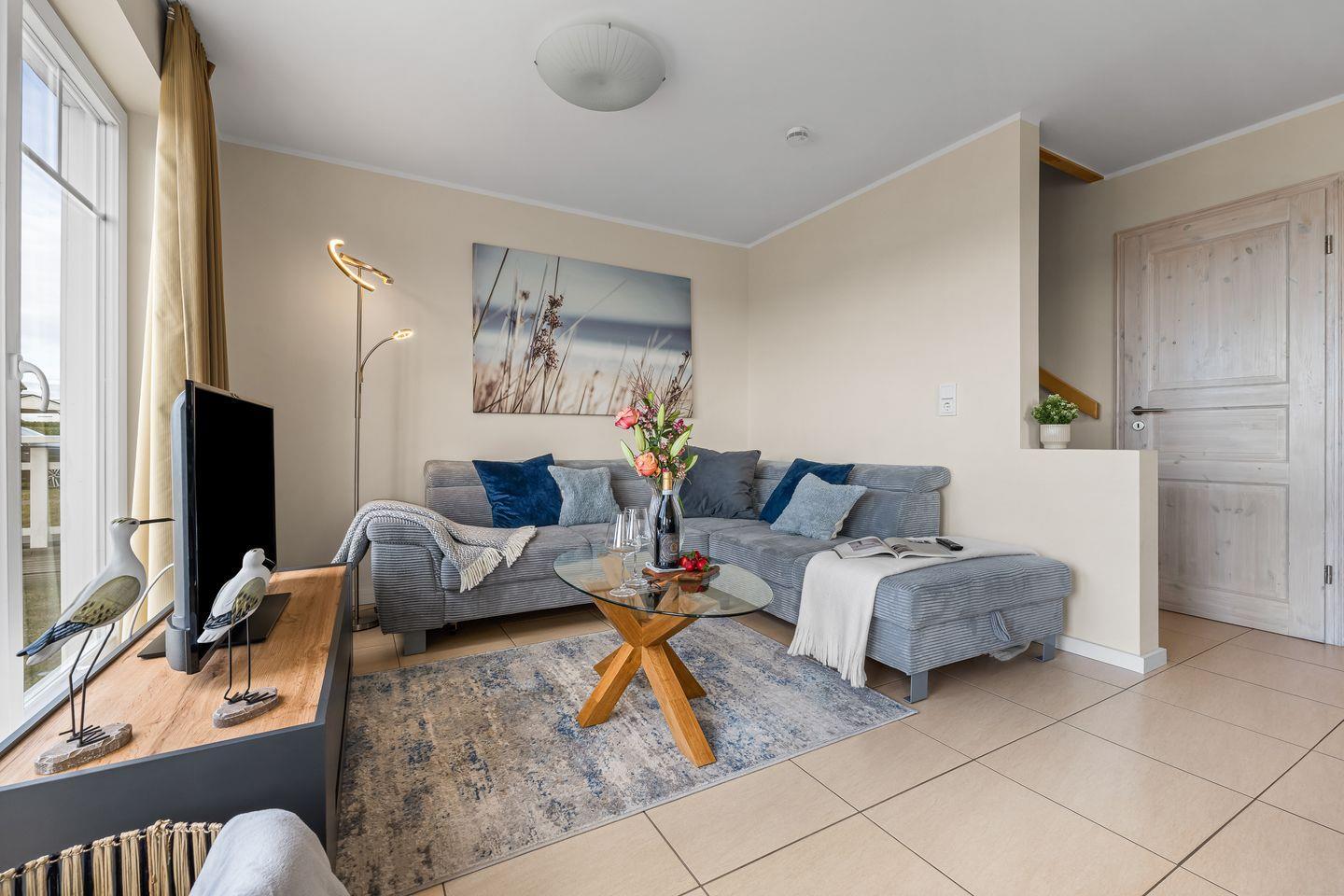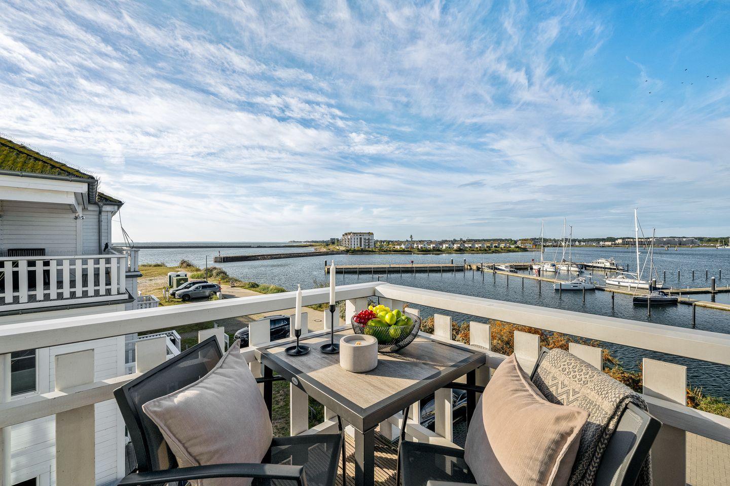 Das Herzstück von Marina Sands ist der helle Wohn- und Essbereich im Erdgeschoss. Durch bodentiefe Fenster fällt der Blick ungehindert auf das türkisblaue Wasser der Marina. Das gemütliche Sofa lädt zu entspannten Stunden ein. Ob mit einem guten Buch, bei einem Film oder einfach beim Beobachten der vorbeiziehenden Segelboote. Von hier aus treten Sie direkt auf die Terrasse, die mit ihrem maritimem Fair für ausgiebige Genussmomente sorgt. Ein Frühstück mit Sand unter den Füßen oder ein Glas Wein beim Abendlicht. Beides ist hier nur ein paar Schritte entfernt.