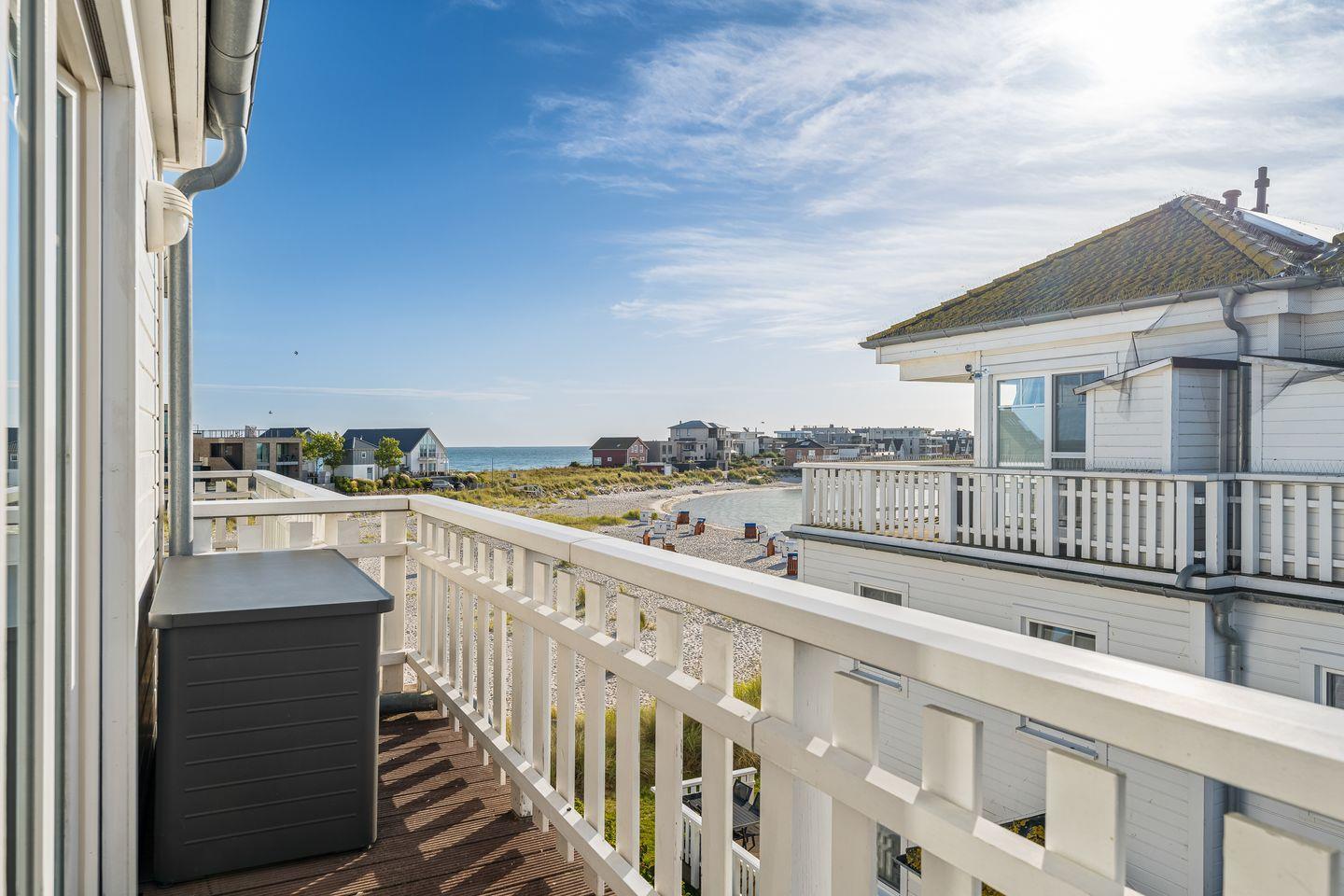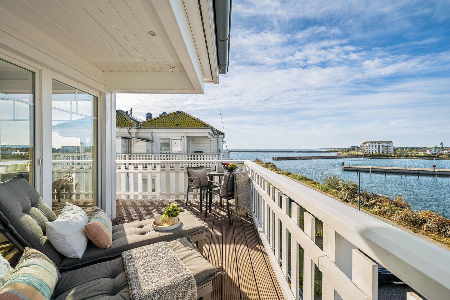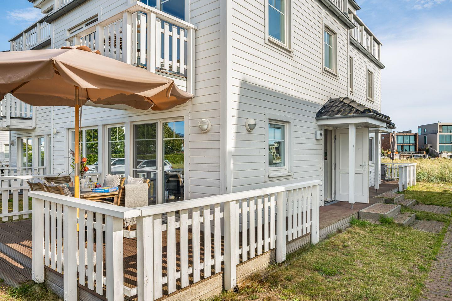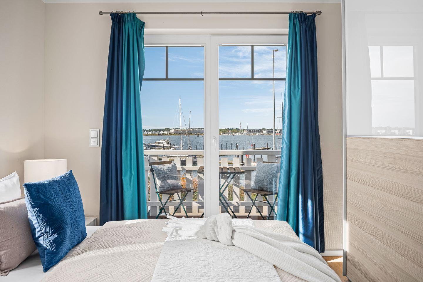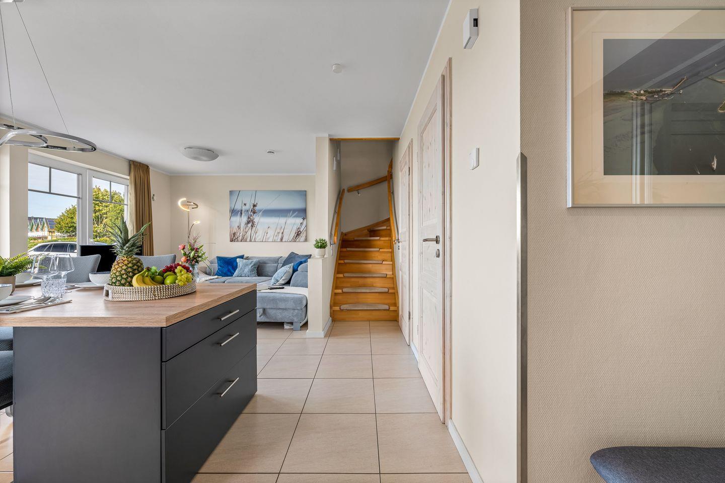 Das Herzstück von Marina Sands ist der helle Wohn- und Essbereich im Erdgeschoss. Durch bodentiefe Fenster fällt der Blick ungehindert auf das türkisblaue Wasser der Marina. Das gemütliche Sofa lädt zu entspannten Stunden ein. Ob mit einem guten Buch, bei einem Film oder einfach beim Beobachten der vorbeiziehenden Segelboote. Von hier aus treten Sie direkt auf die Terrasse, die mit ihrem maritimem Fair für ausgiebige Genussmomente sorgt. Ein Frühstück mit Sand unter den Füßen oder ein Glas Wein beim Abendlicht. Beides ist hier nur ein paar Schritte entfernt.