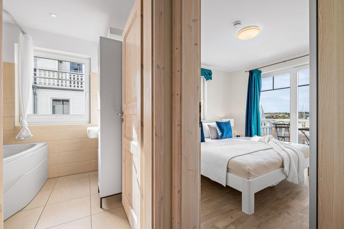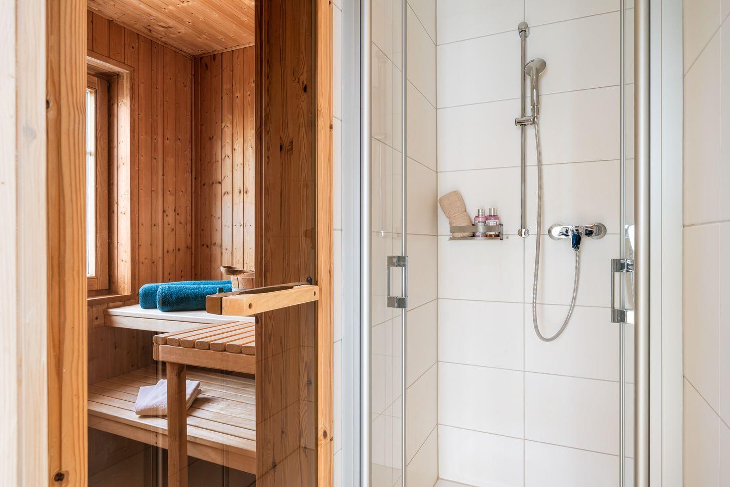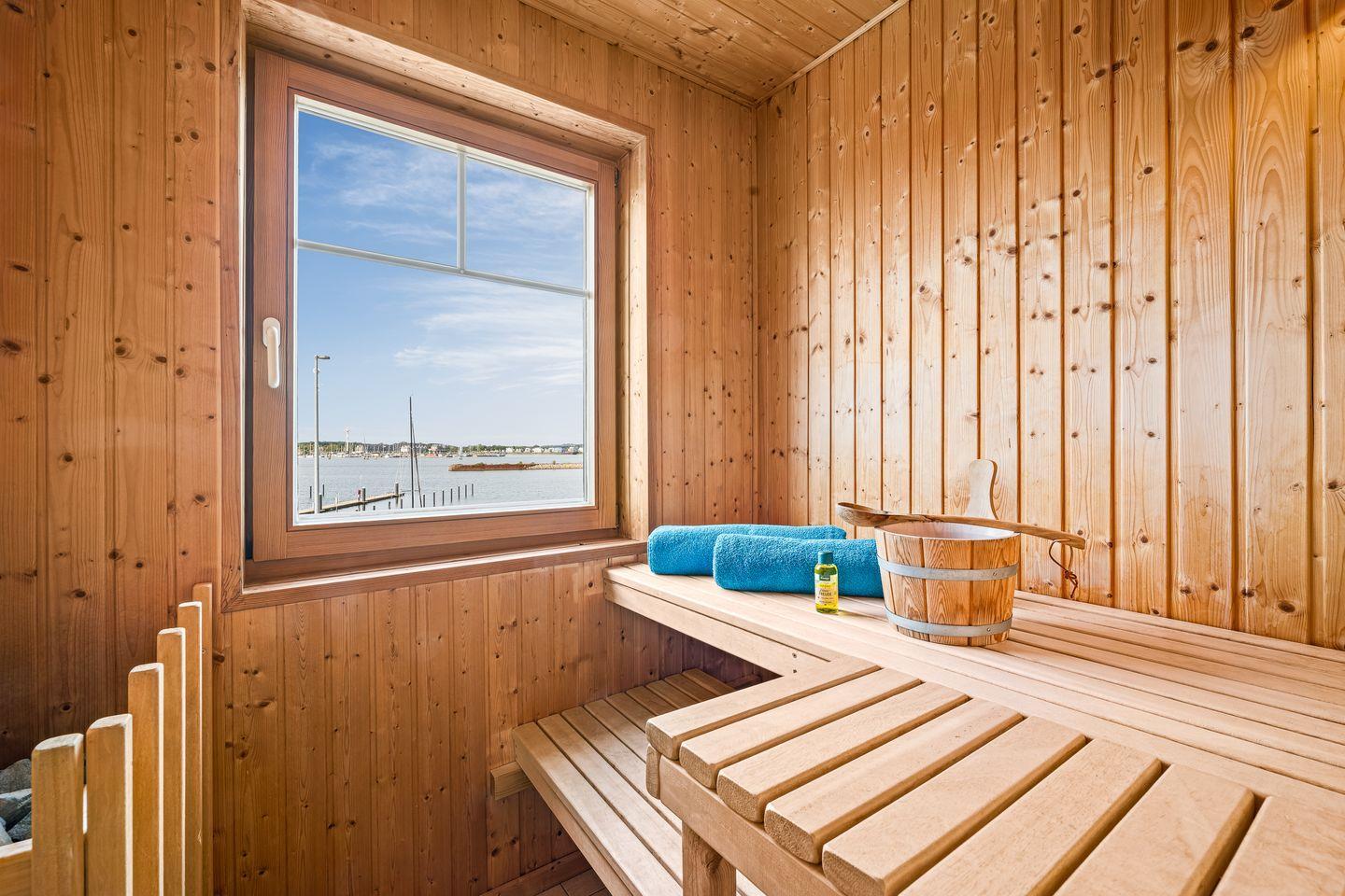 Nach einem Tag am Strand beginnt die Erholung direkt zuhause: Im Badezimmer lädt die große Badewanne mit Whirlfunktion zu entspannten Stunden ein. Das Highlight zu jeder Jahreszeit liegt jedoch ganz oben im Dachgeschoss: eine private Sauna mit Fensterfront, die den Blick über Yachthafen Olpenitz freigibt. Gleich daneben die Dachterrasse: ein Ort für tiefe Atemzüge, Sonnenuntergänge und ungestörte Momente zwischen Himmel und Wasser.