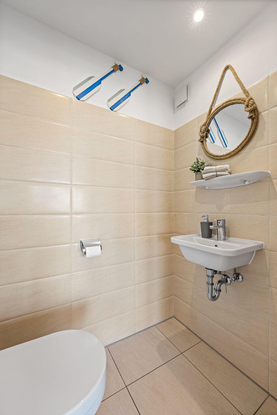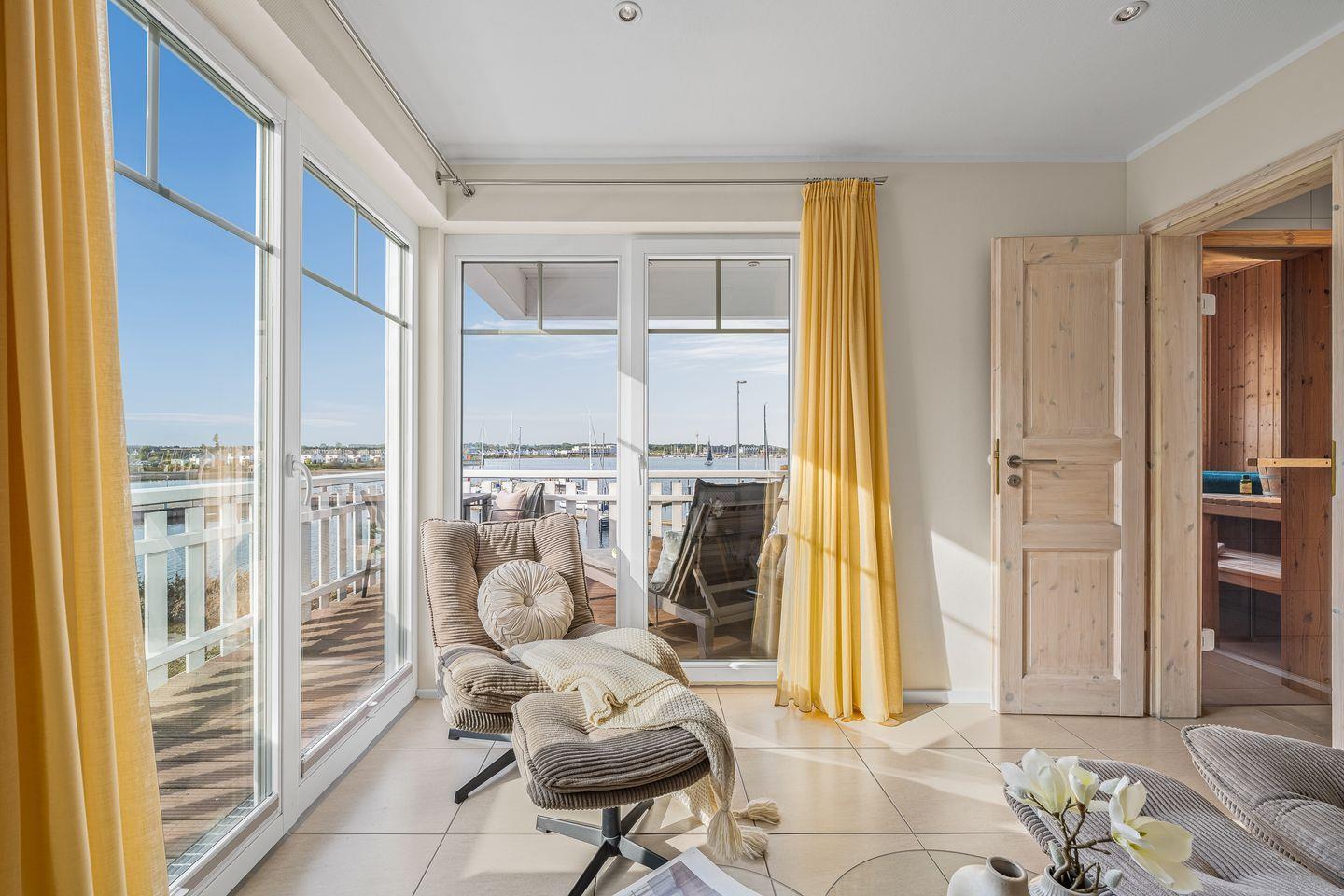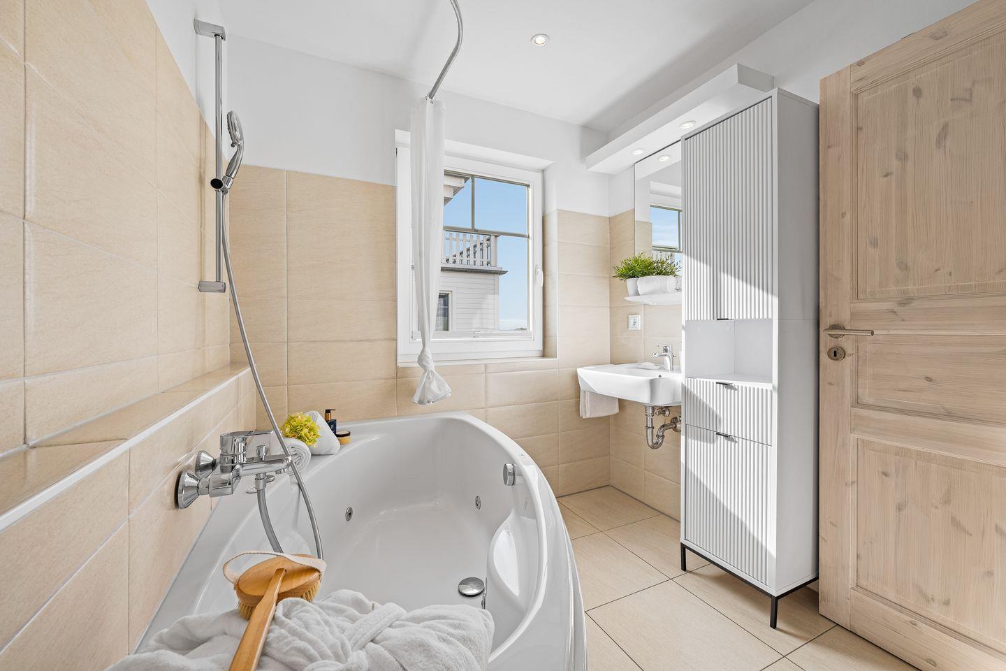 Nach einem Tag am Strand beginnt die Erholung direkt zuhause: Im Badezimmer lädt die große Badewanne mit Whirlfunktion zu entspannten Stunden ein. Das Highlight zu jeder Jahreszeit liegt jedoch ganz oben im Dachgeschoss: eine private Sauna mit Fensterfront, die den Blick über Yachthafen Olpenitz freigibt. Gleich daneben die Dachterrasse: ein Ort für tiefe Atemzüge, Sonnenuntergänge und ungestörte Momente zwischen Himmel und Wasser.