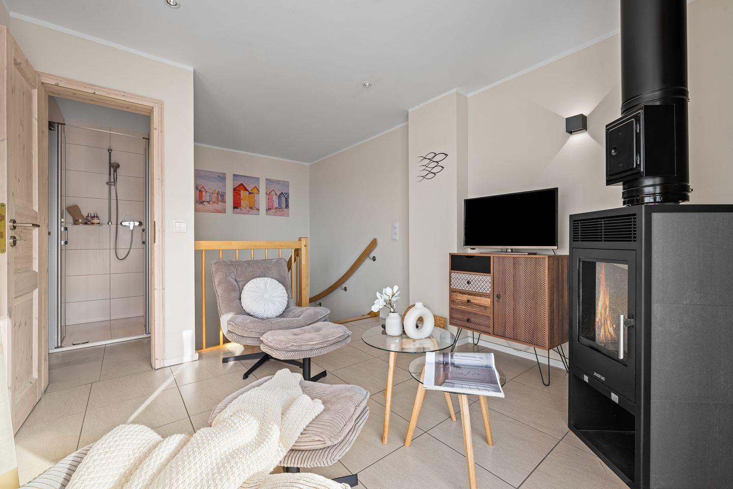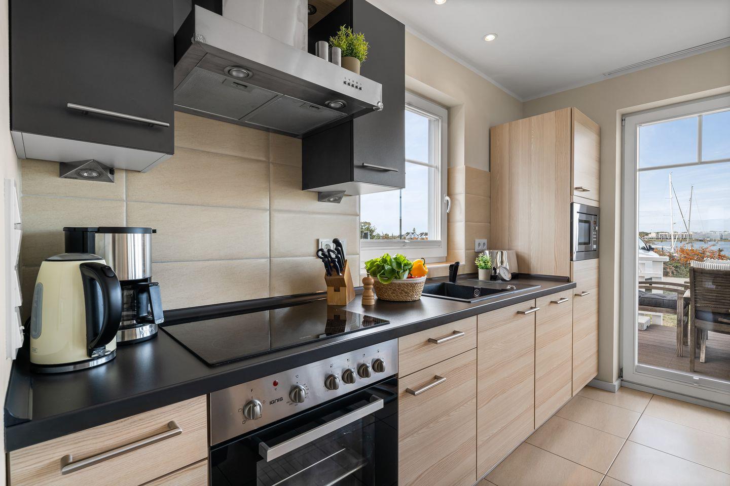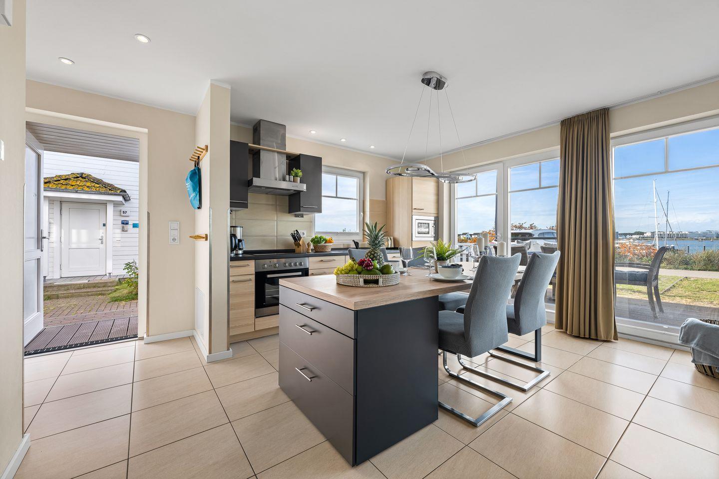 Die moderne Küche ist mit allem ausgestattet, was das Herz begehrt. Vom Kochfeld über Spülmaschine bis hin zum Backofen. Sie grenzt direkt an den Essbereich und die Terrasse, sodass die Übergänge zwischen Kochen, Genießen und Draußensein fließend sind. Für gemütliche Abende sorgt der skandinavische Kaminofen im Dachstudio: knisterndes Feuer, Blick über die Bucht - und die Zeit steht still.