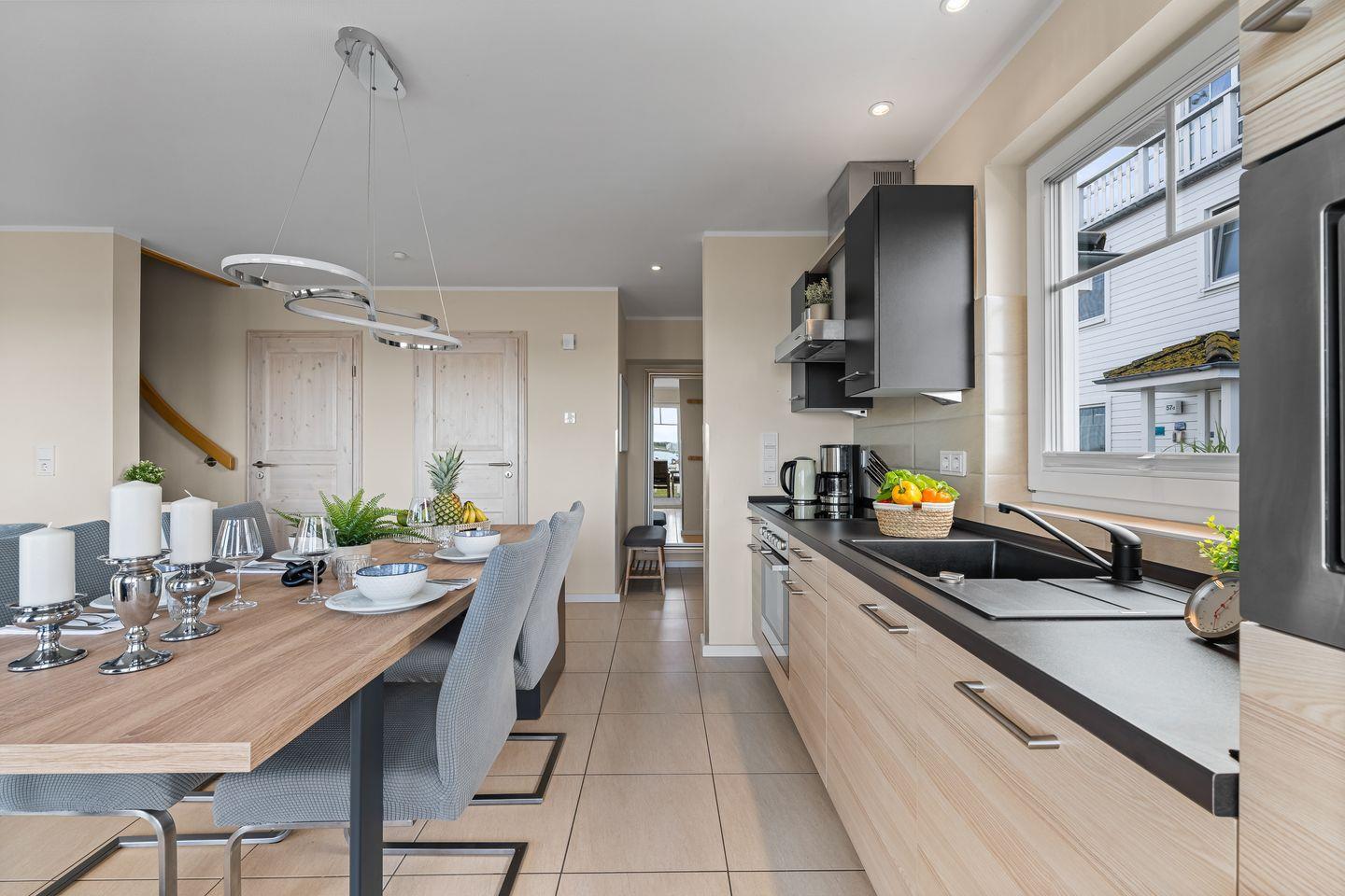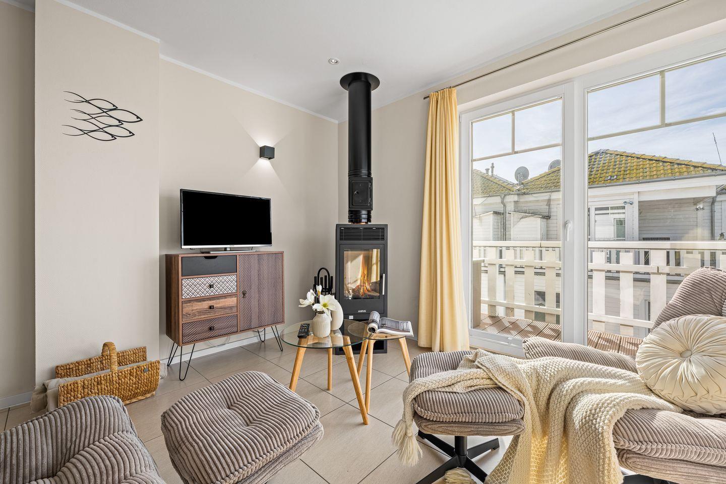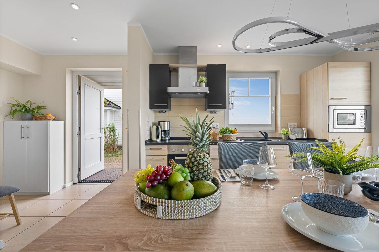 Die moderne Küche ist mit allem ausgestattet, was das Herz begehrt. Vom Kochfeld über Spülmaschine bis hin zum Backofen. Sie grenzt direkt an den Essbereich und die Terrasse, sodass die Übergänge zwischen Kochen, Genießen und Draußensein fließend sind. Für gemütliche Abende sorgt der skandinavische Kaminofen im Dachstudio: knisterndes Feuer, Blick über die Bucht - und die Zeit steht still.