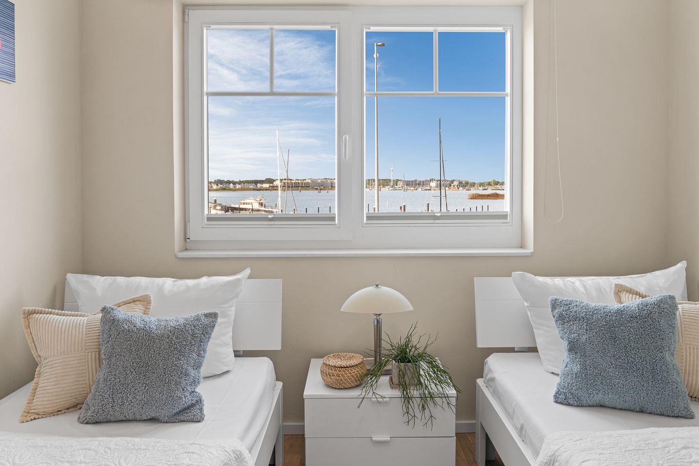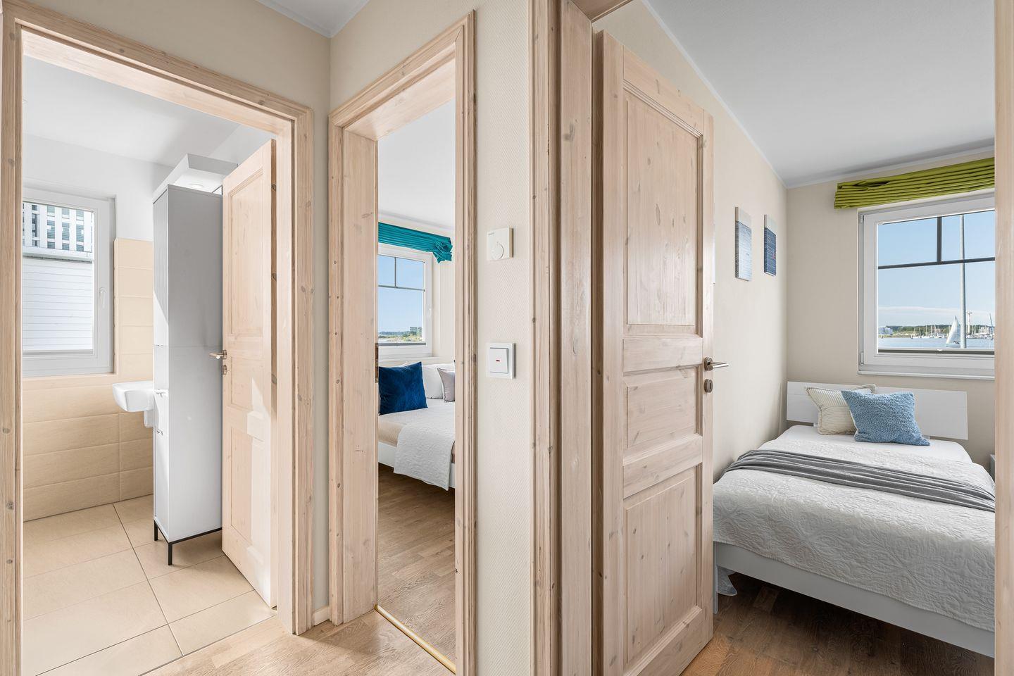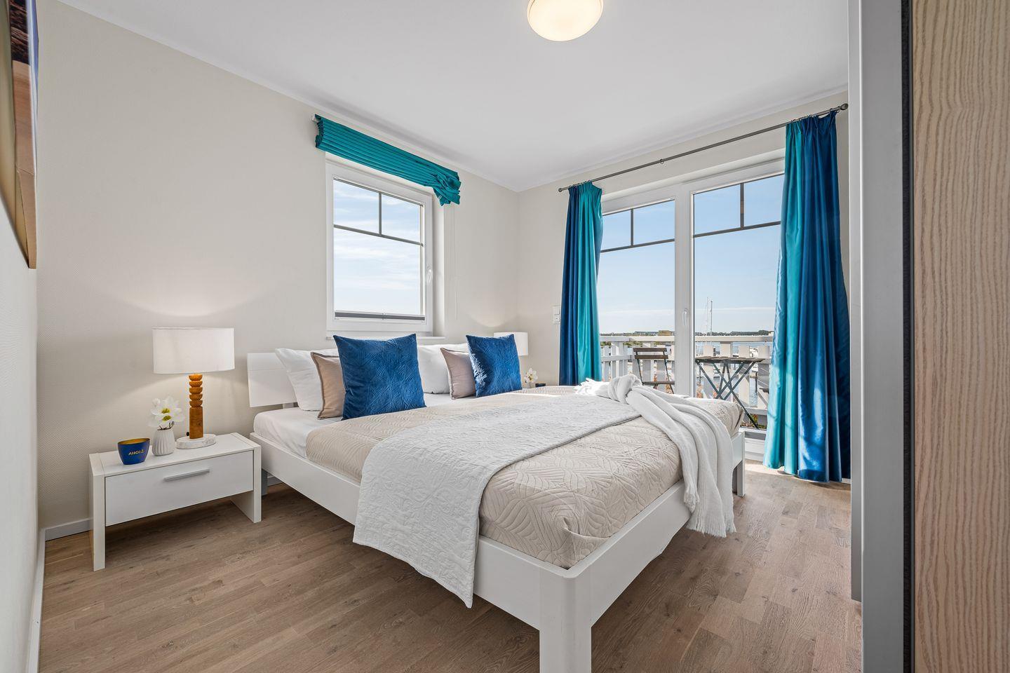 Im Obergeschoss warten zwei gemütliche Schlafzimmer auf Sie. Das Hauptschlafzimmer öffnet sich zum Balkon mit direktem Blick aufs Wasser. Ein Ort, an dem der erste Kaffee am Morgen genauso besonders ist wie der Sonnenuntergang am Abend. Warme Farbtöne, weiche Kissen und viel Licht schaffen eine Atmosphäre, die Geborgenheit schenkt. Das zweite Schlafzimmer mit zwei Einzelbetten ist ideal für Kinder oder Freunde.