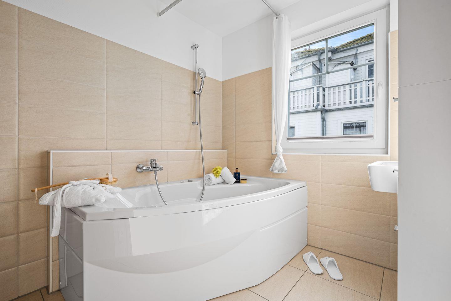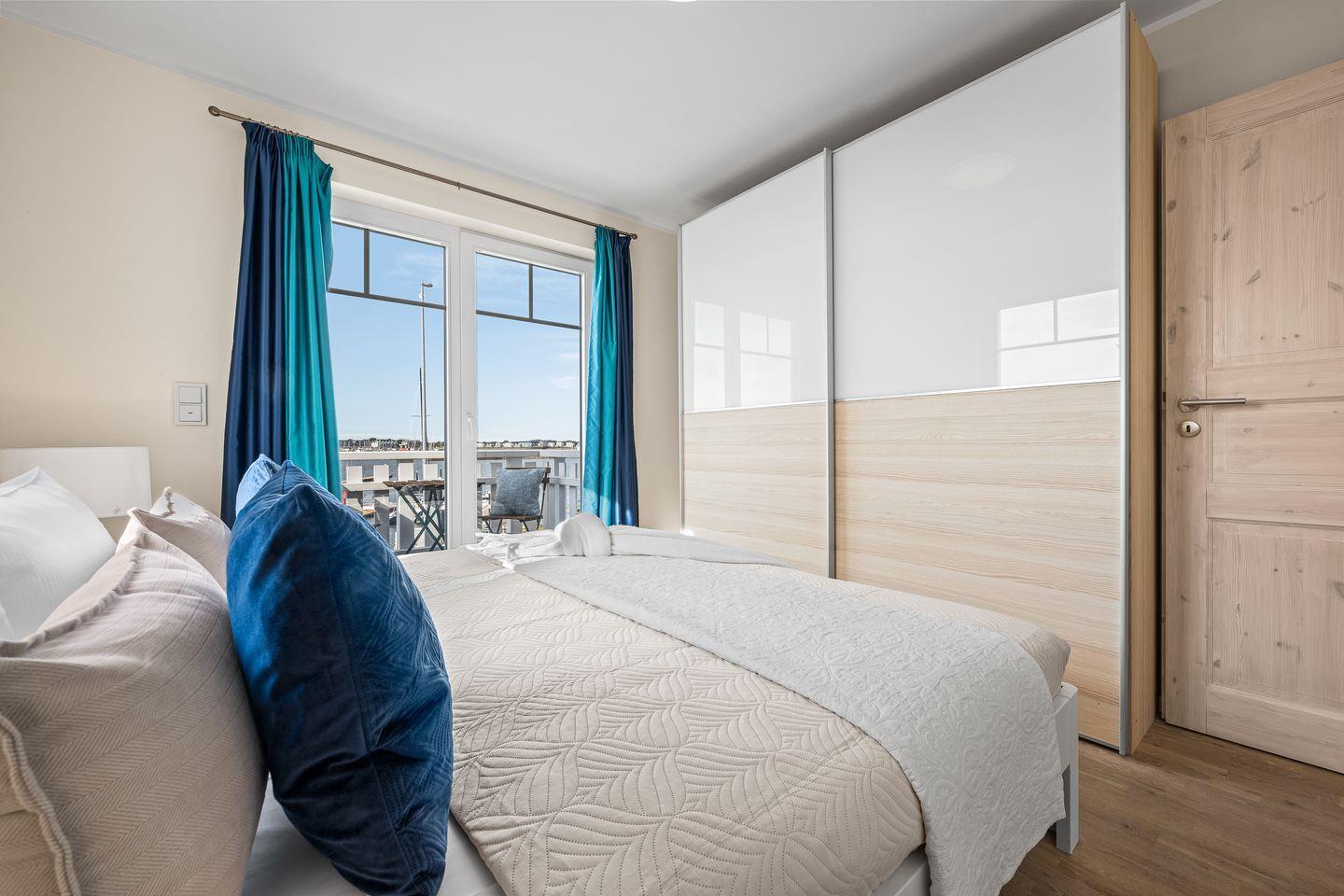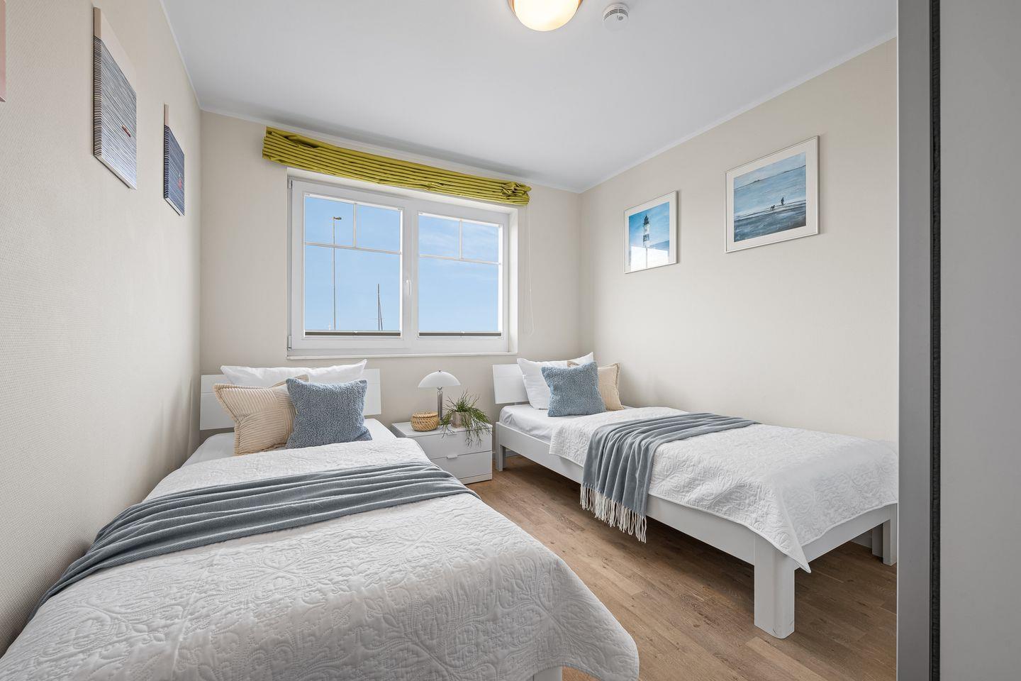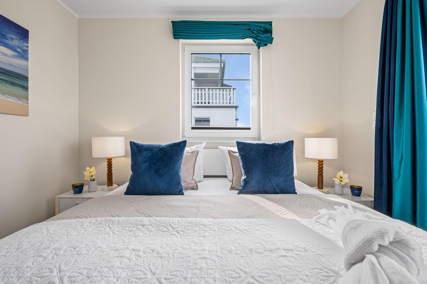 Im Obergeschoss warten zwei gemütliche Schlafzimmer auf Sie. Das Hauptschlafzimmer öffnet sich zum Balkon mit direktem Blick aufs Wasser. Ein Ort, an dem der erste Kaffee am Morgen genauso besonders ist wie der Sonnenuntergang am Abend. Warme Farbtöne, weiche Kissen und viel Licht schaffen eine Atmosphäre, die Geborgenheit schenkt. Das zweite Schlafzimmer mit zwei Einzelbetten ist ideal für Kinder oder Freunde.