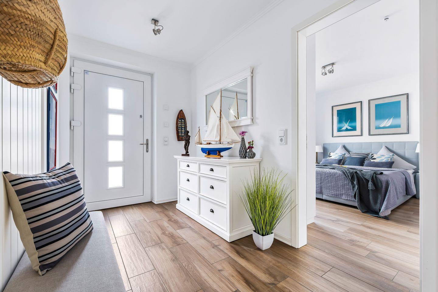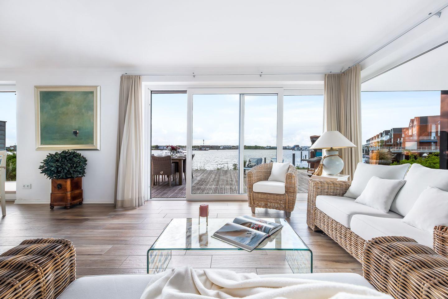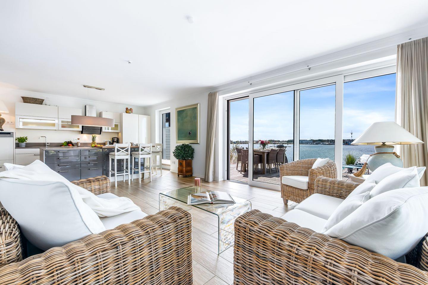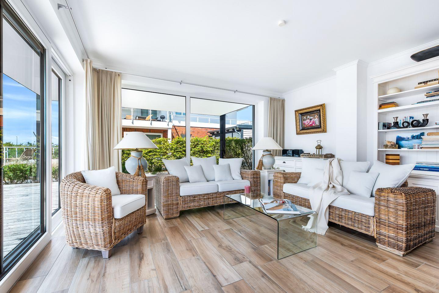 Sie öffnen die Terrassentür, hören die Wellen, riechen das Salz in der Luft. Die Möwen kreisen über dem Hafen, während das Licht durch die großen Fenster ins Wohnzimmer fällt. Maritimer Stil, helle Farben und natürliche Materialien machen aus dem Wohnbereich Ihr neues Lieblingszimmer.