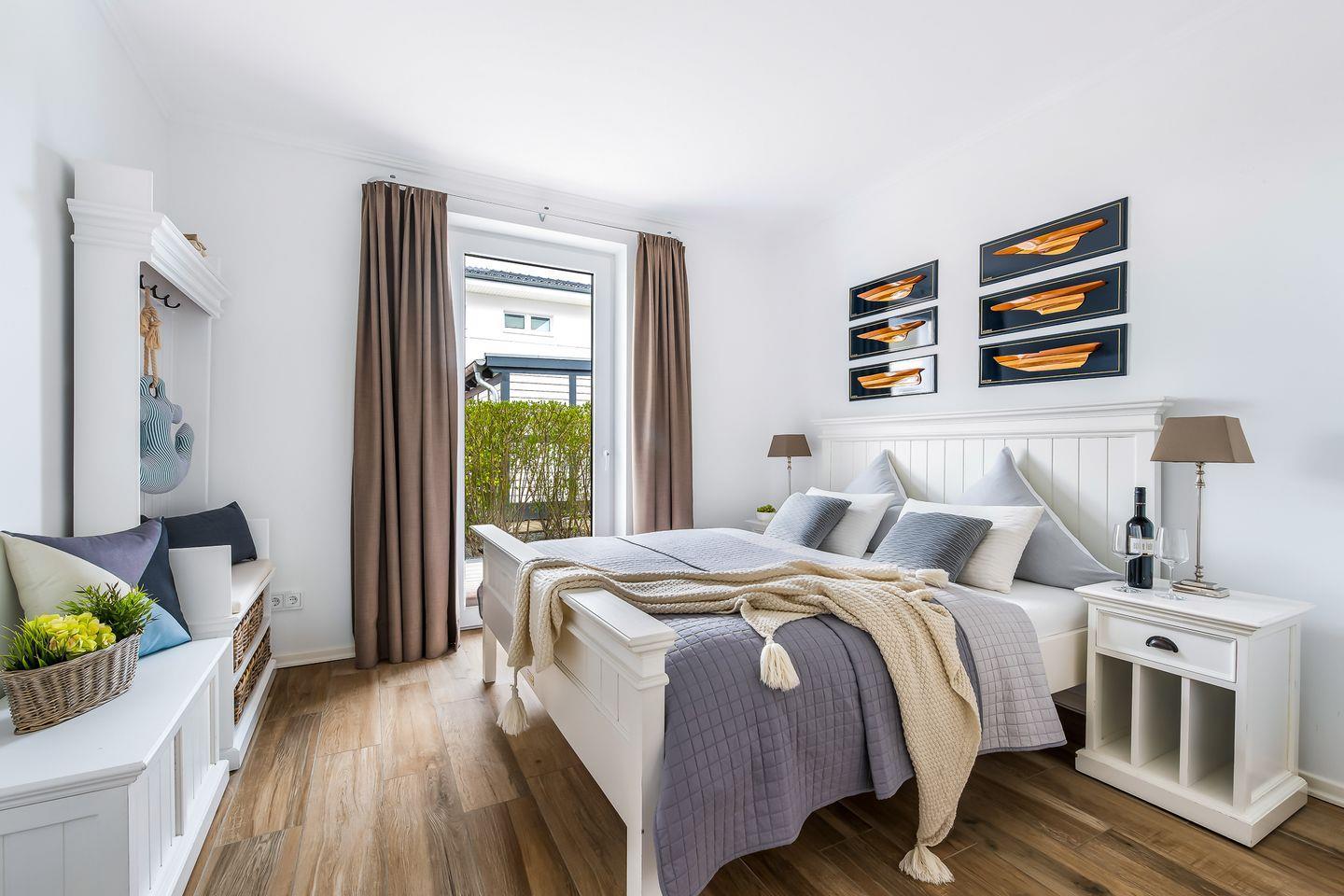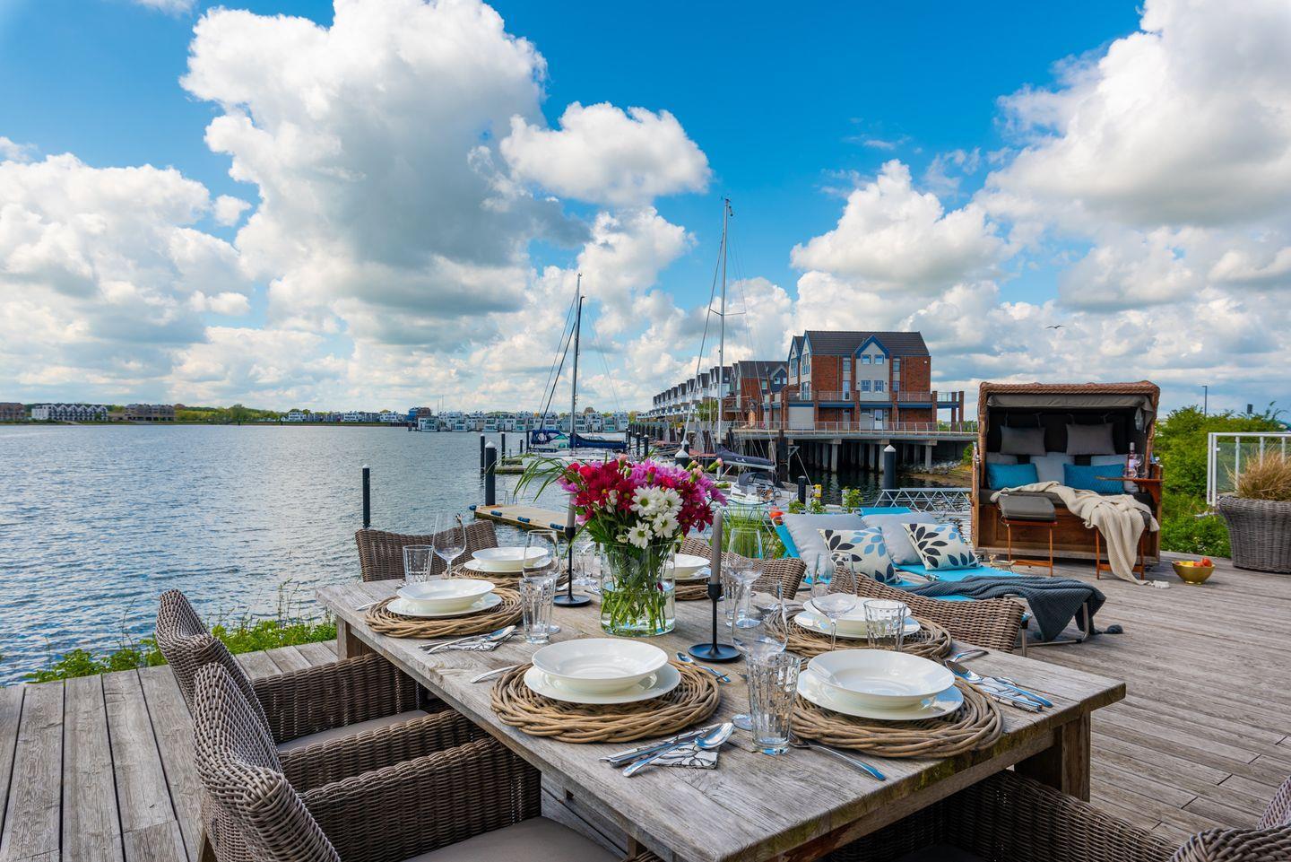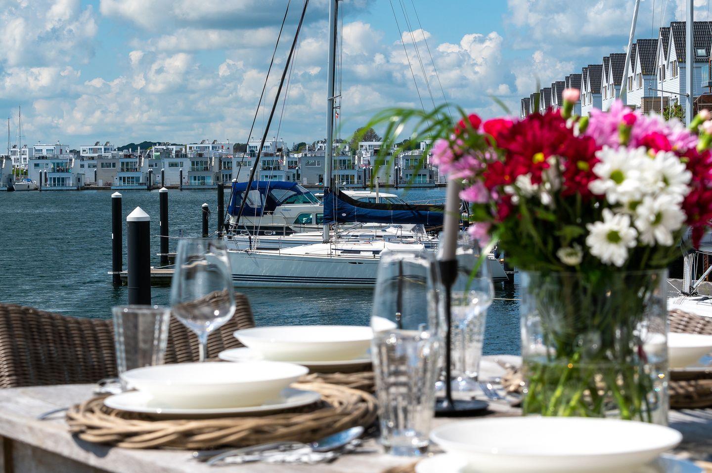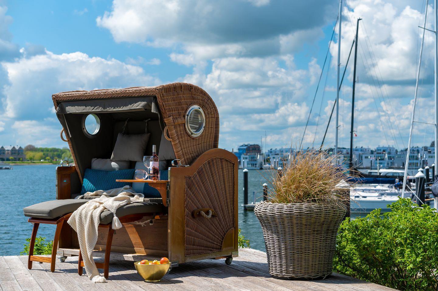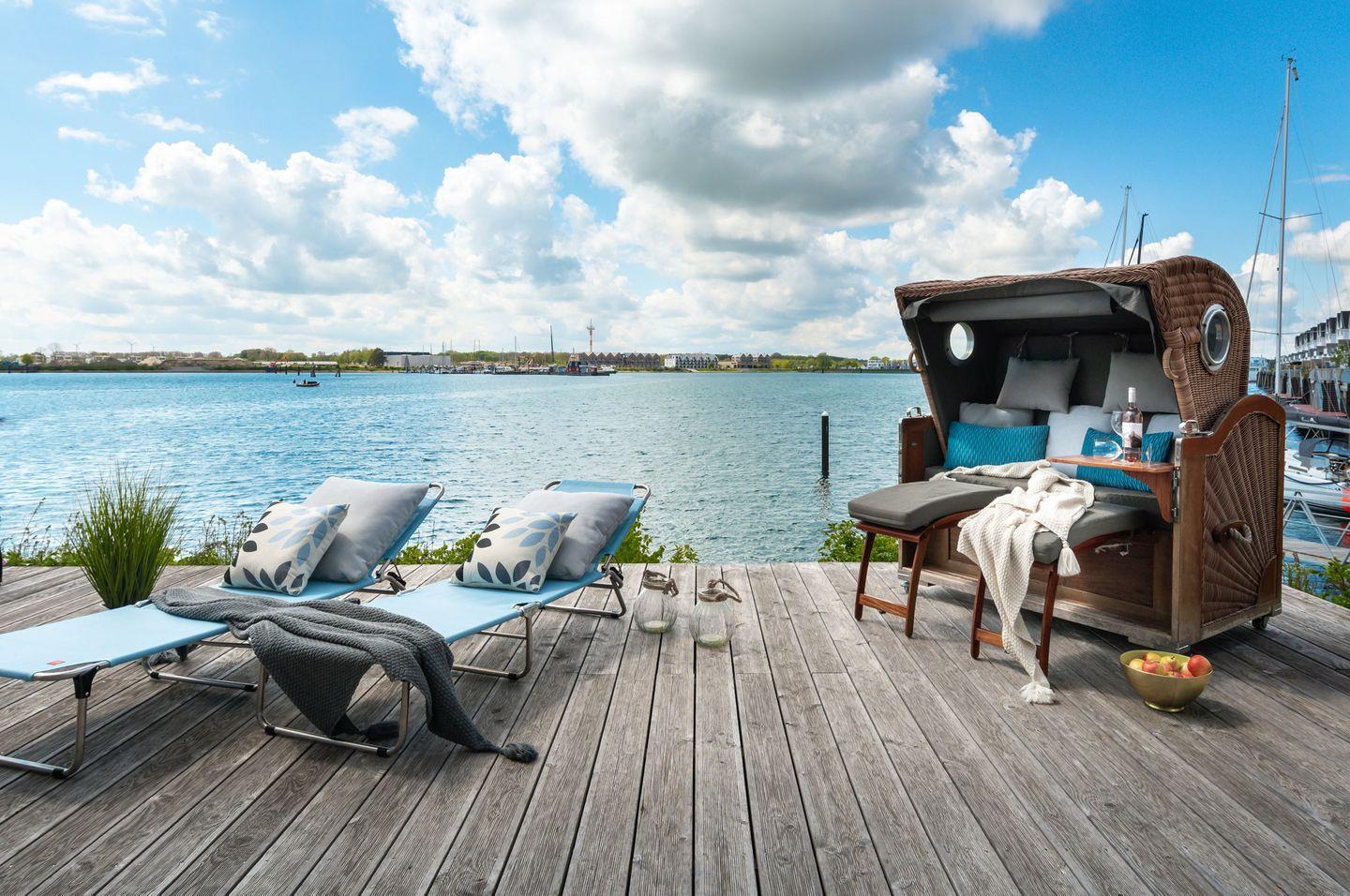 Ihre Terrasse liegt in der Sonne – vom späten Vormittag bis in den Abend. Sie frühstücken mit Blick auf die Marina, lesen im Strandkorb oder lehnen sich zurück, während die Sonne langsam untergeht. Zwei Liegestühle und ein großer Tisch machen den Platz perfekt für ruhige Momente und lange Gespräche.