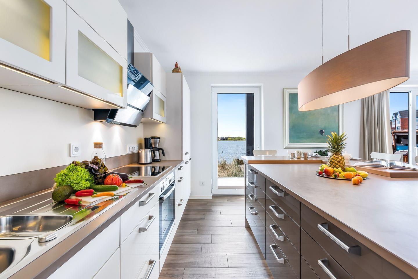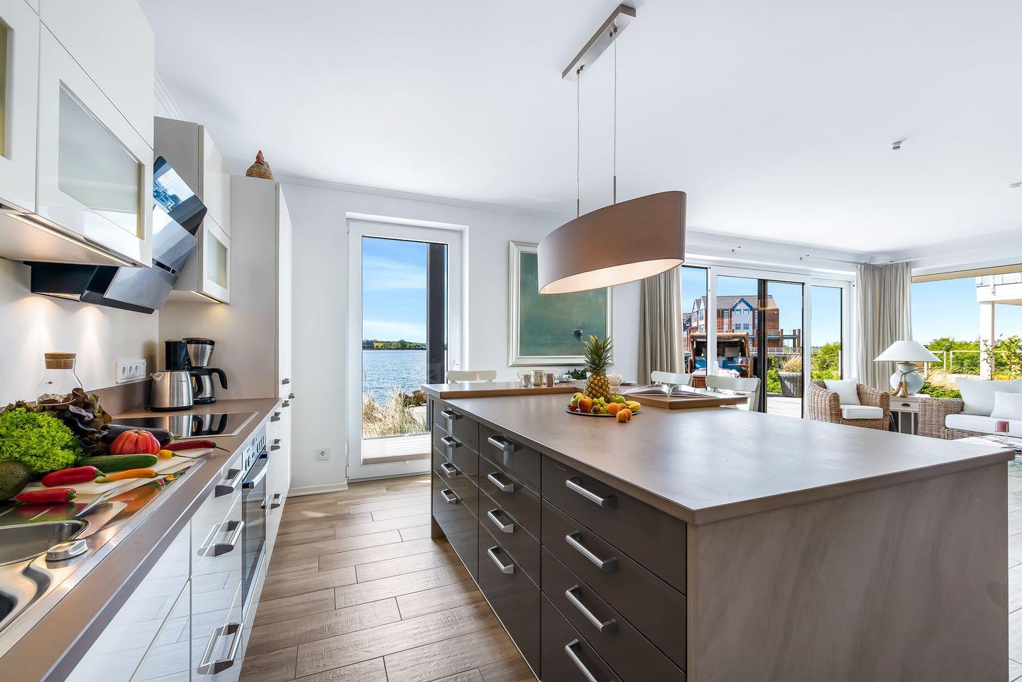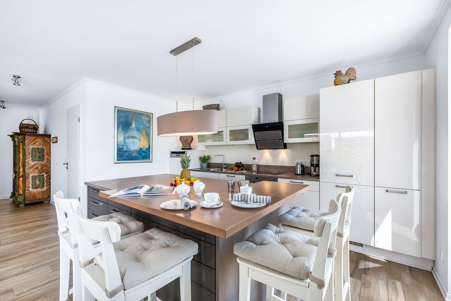 Die offene Küche ist hochwertig ausgestattet und fügt sich stilvoll in den Wohnbereich ein. Ein großzügiger Frühstückstresen macht sie zum Treffpunkt für kleine Snacks, lange Frühstücke oder das gemeinsame Abendessen. Mit Backofen, Ceranfeld, Kühlschrank mit Gefrierfach, Geschirrspüler, Espressokanne und allem, was Sie zum Kochen brauchen, wird sie auch anspruchsvollen Urlaubsköchen gerecht.