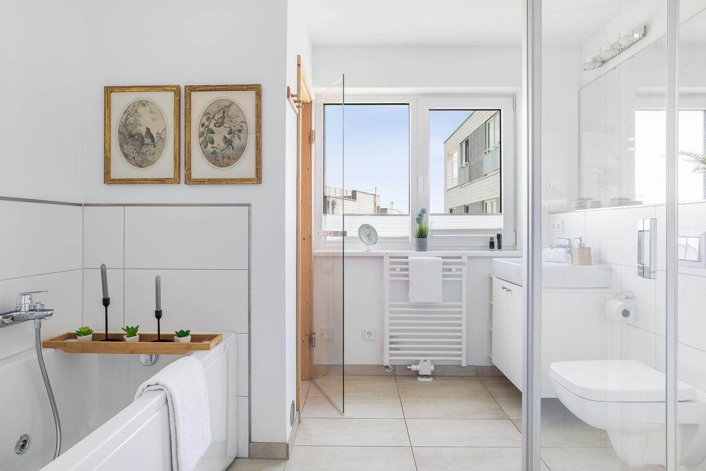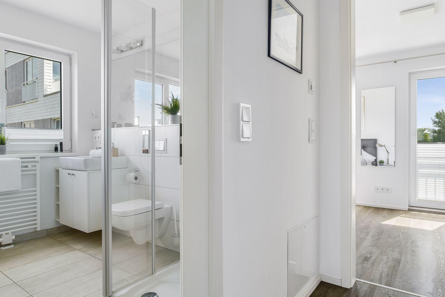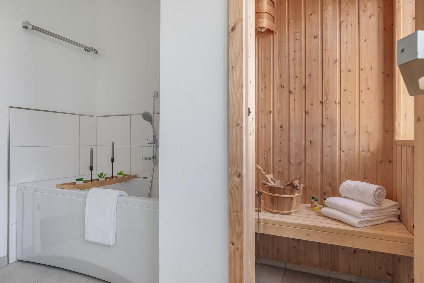 Ein Bad wie ein kleiner Wellnessbereich: Im Obergeschoss erwartet Sie eine Whirlpoolwanne, eine Dusche und eine finnische Sauna mit Fenster zum Wasser. Für alle, die sich nach Wärme und Ruhe sehnen. Ein zweites Bad mit Dusche im Erdgeschoss sorgt für zusätzlichen Komfort.