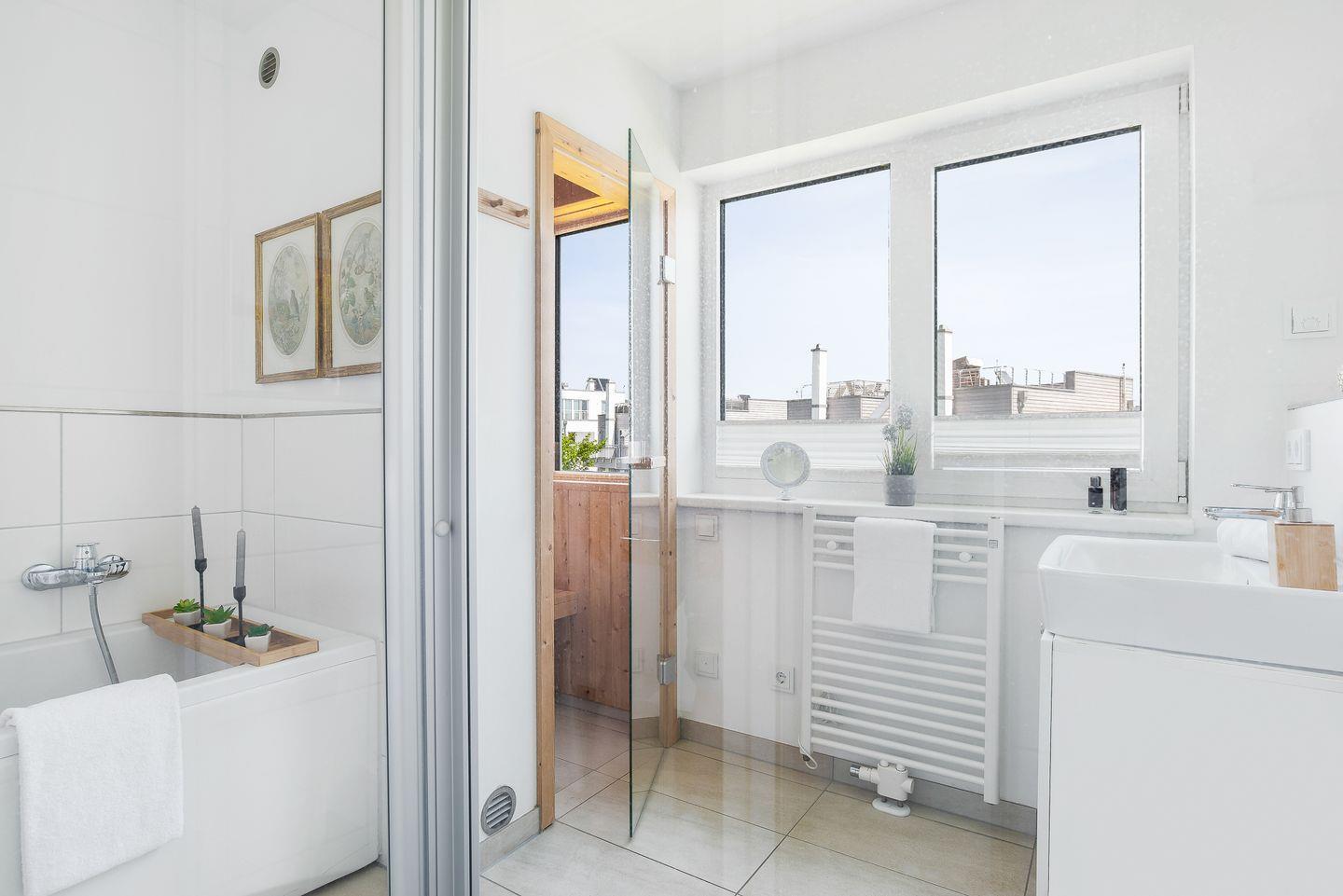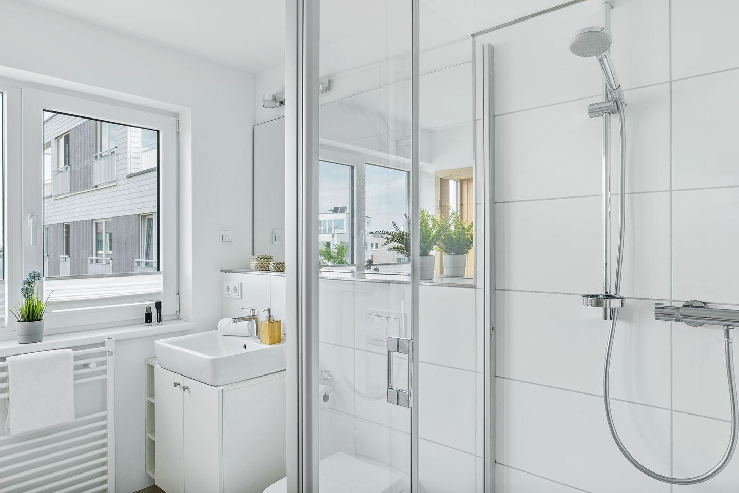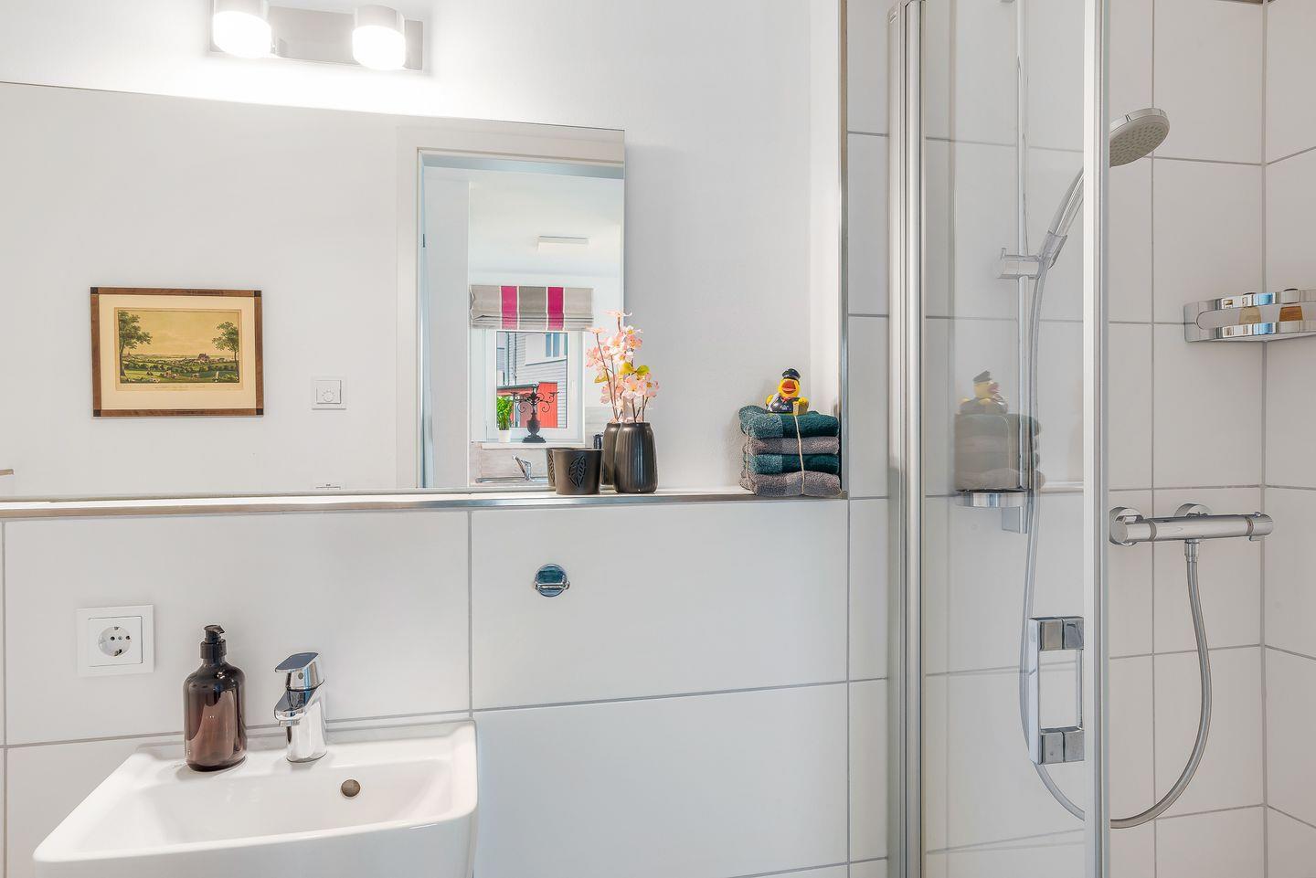 Ein Bad wie ein kleiner Wellnessbereich: Im Obergeschoss erwartet Sie eine Whirlpoolwanne, eine Dusche und eine finnische Sauna mit Fenster zum Wasser. Für alle, die sich nach Wärme und Ruhe sehnen. Ein zweites Bad mit Dusche im Erdgeschoss sorgt für zusätzlichen Komfort.