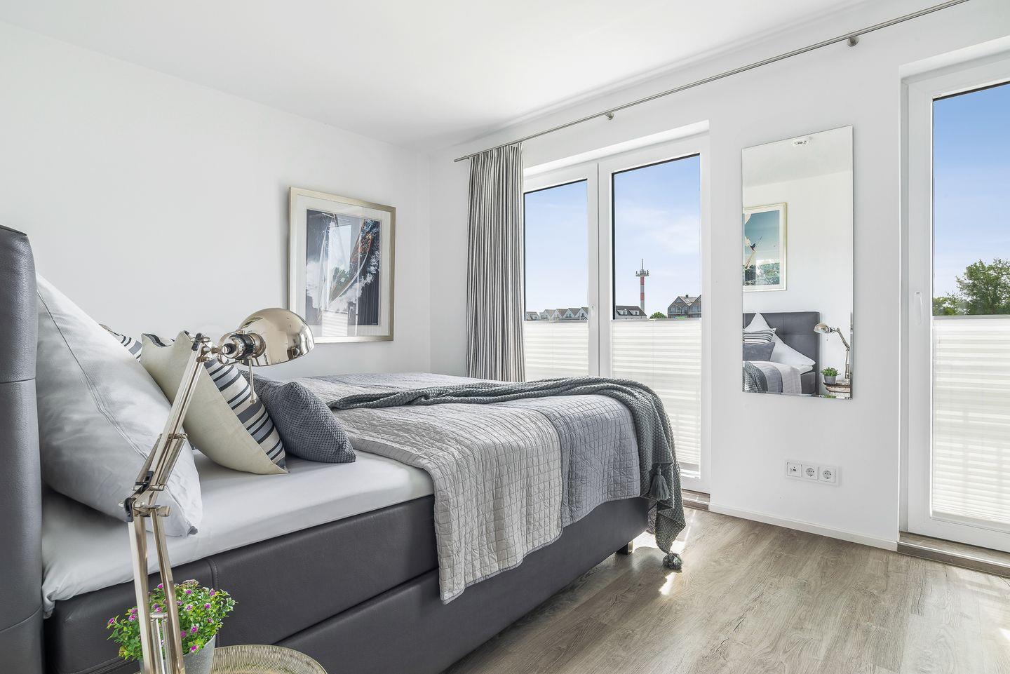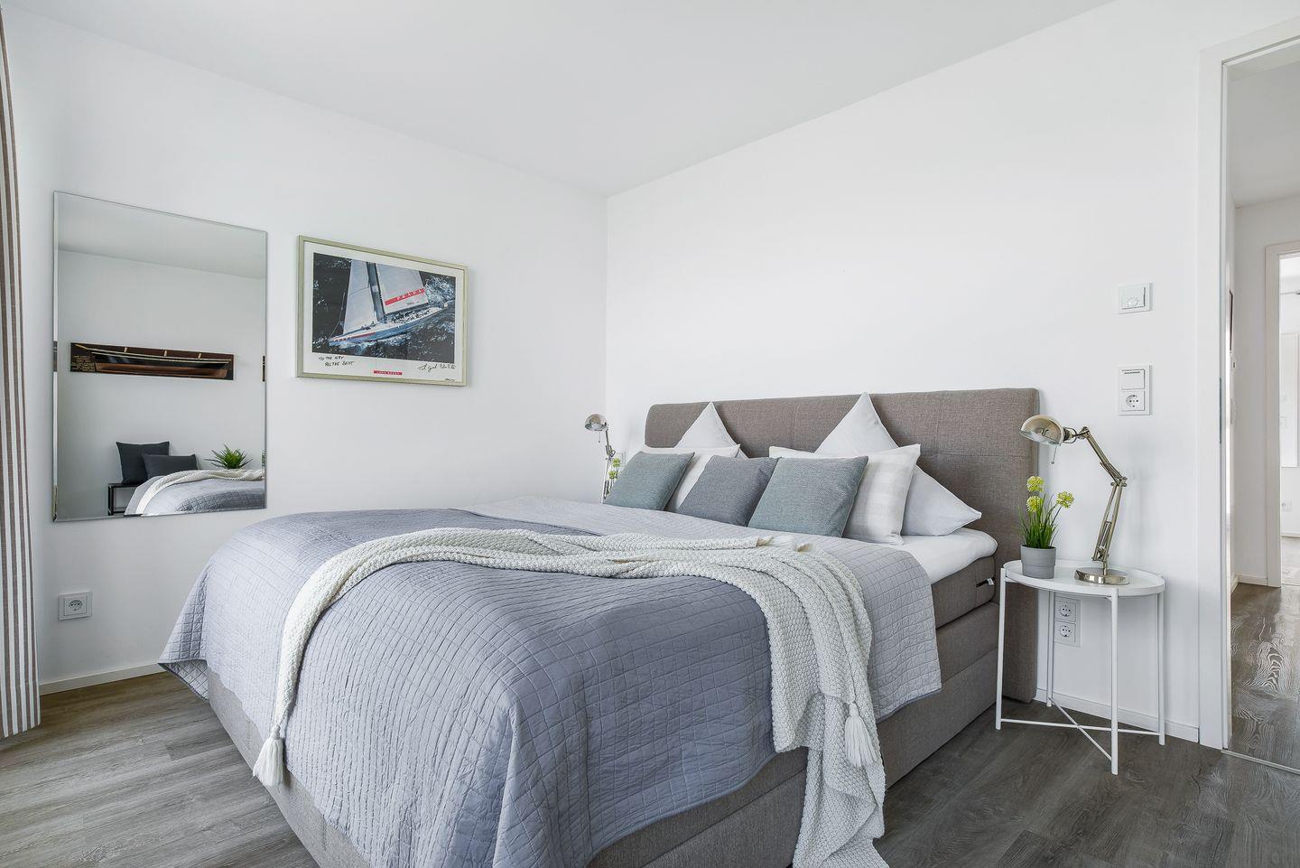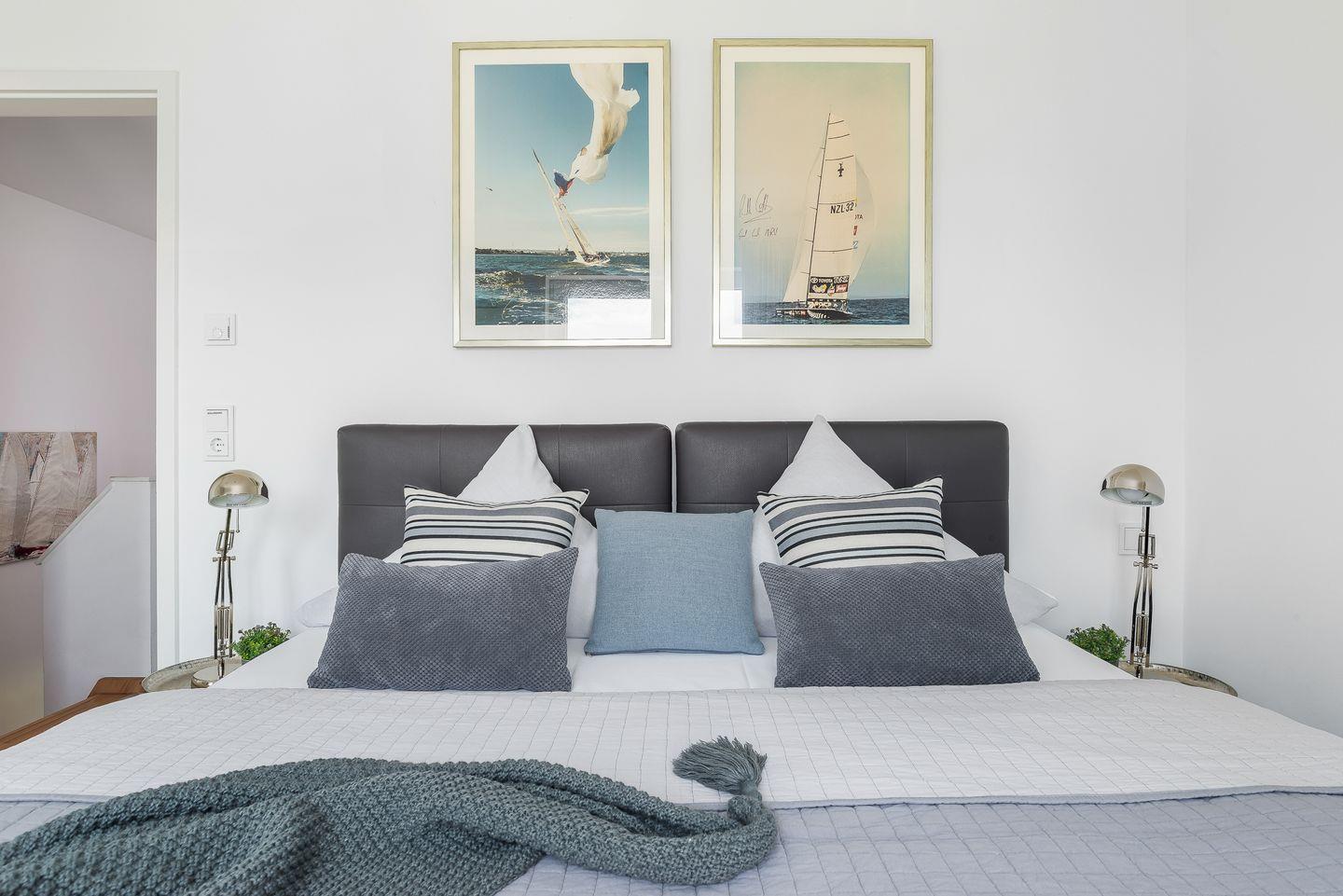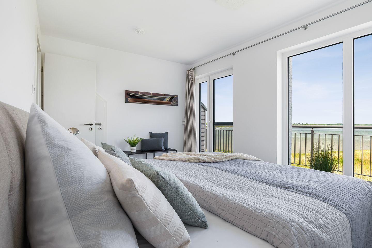Das Schlafzimmer im Obergeschoss ist ein Ort zum Durchatmen. Morgens zwitschern die Vögel, das Licht spiegelt sich im Wasser und auf der angrenzenden Terrasse lässt sich der erste Kaffee ganz in Ruhe genießen. Auch das zweite Schlafzimmer bietet ein Doppelbett und viel Gemütlichkeit.