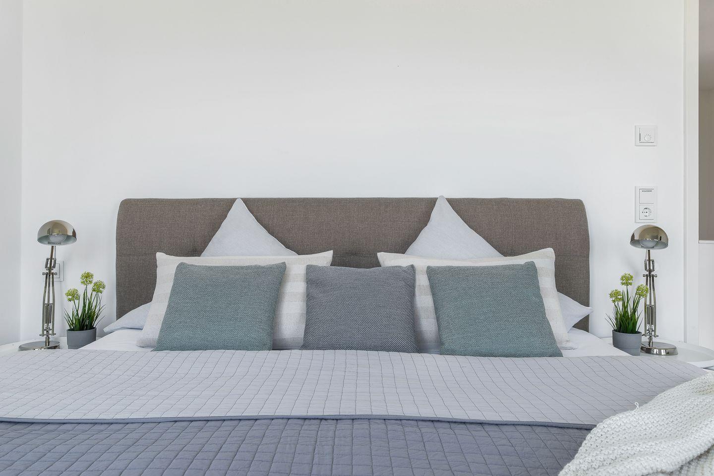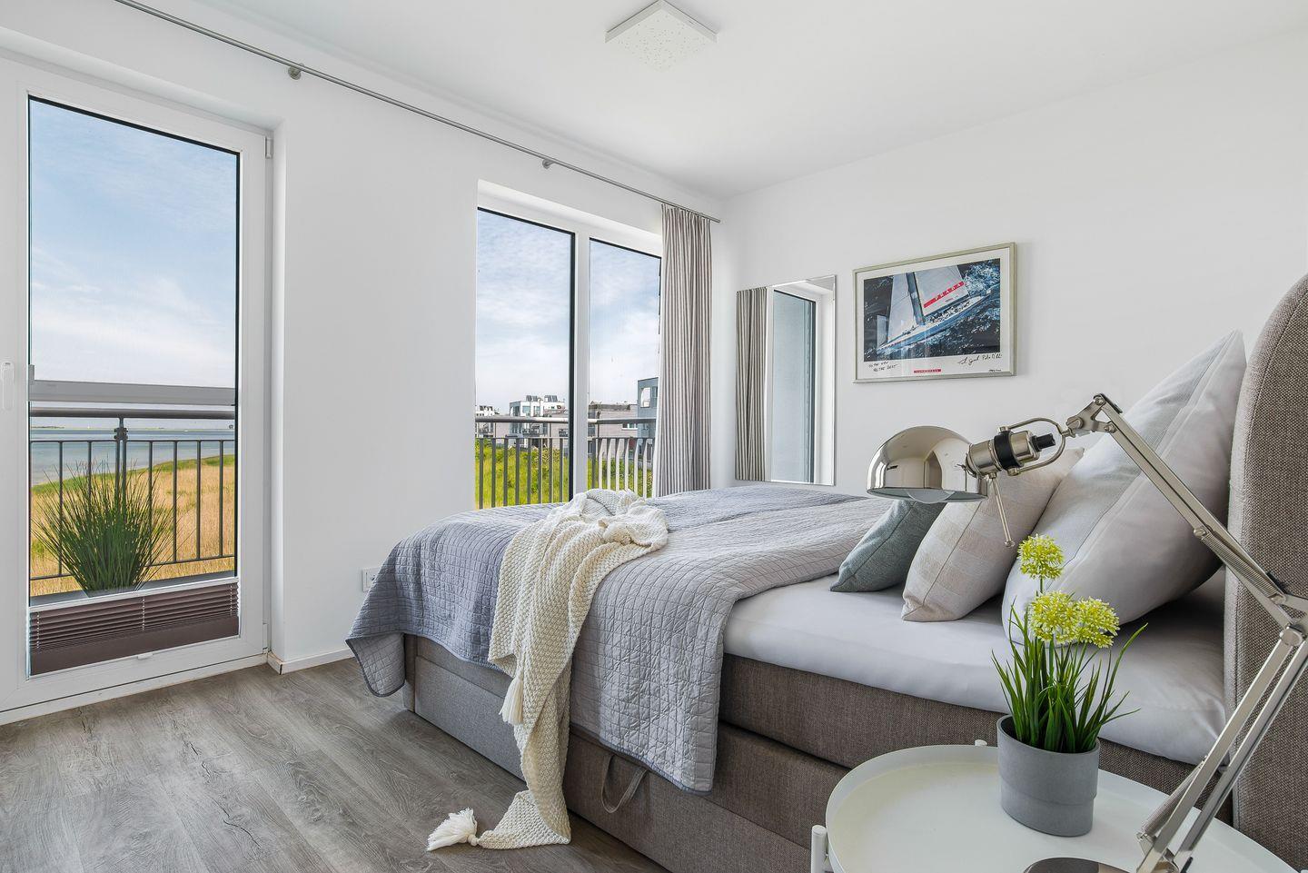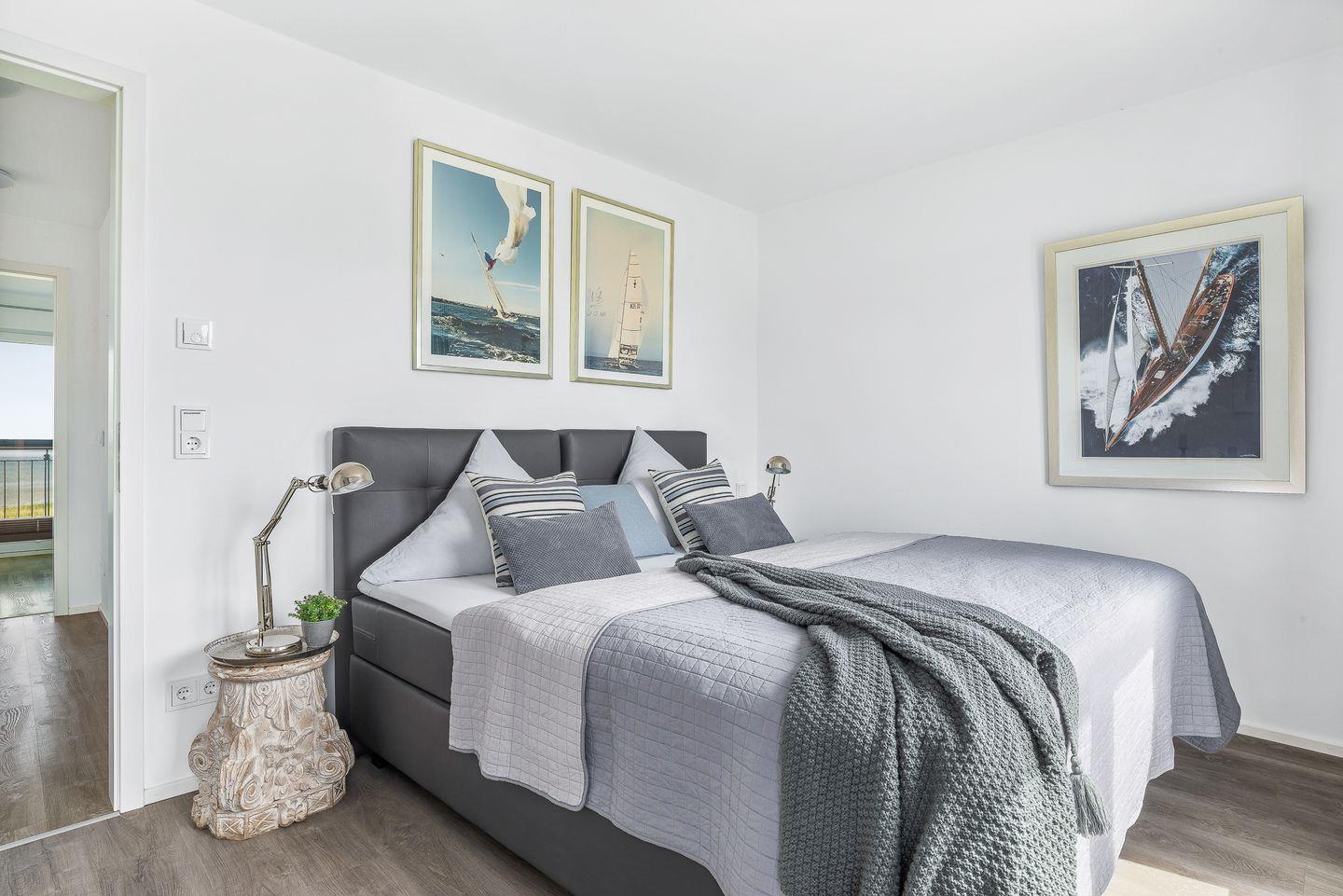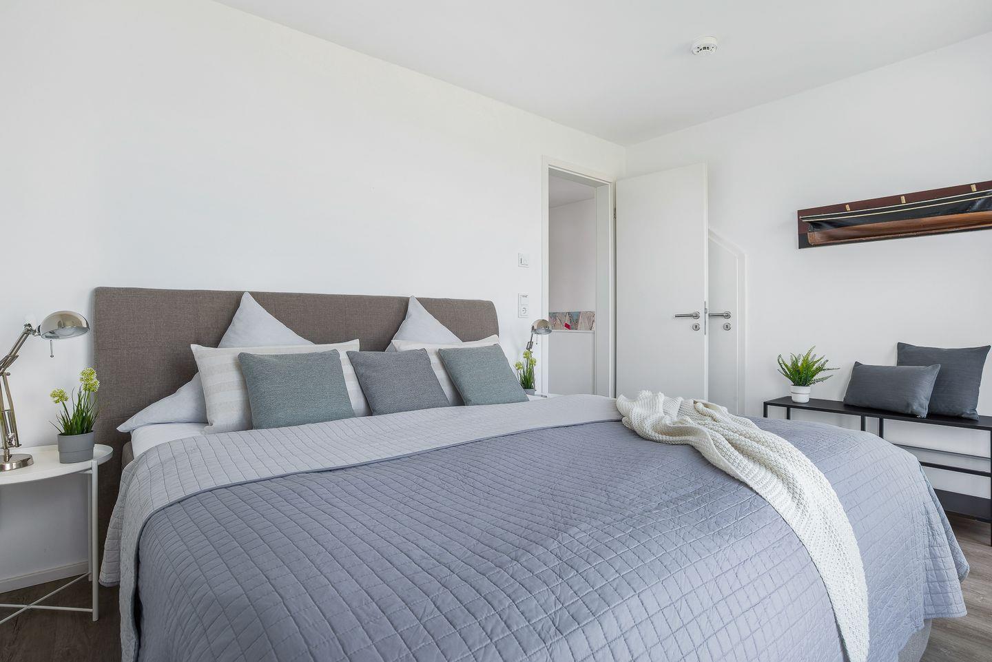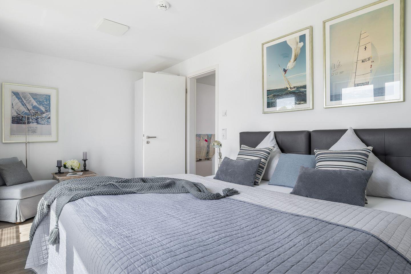 Das Schlafzimmer im Obergeschoss ist ein Ort zum Durchatmen. Morgens zwitschern die Vögel, das Licht spiegelt sich im Wasser und auf der angrenzenden Terrasse lässt sich der erste Kaffee ganz in Ruhe genießen. Auch das zweite Schlafzimmer bietet ein Doppelbett und viel Gemütlichkeit.