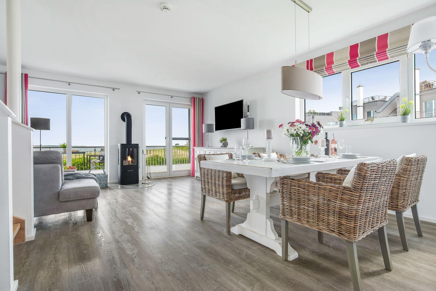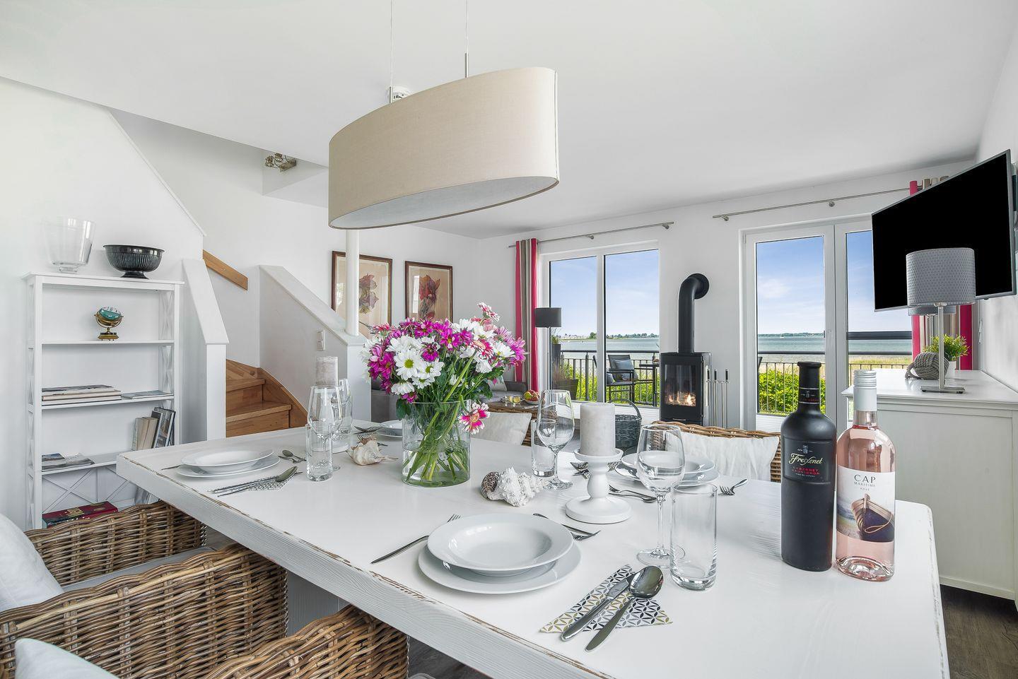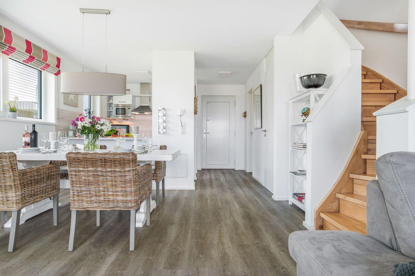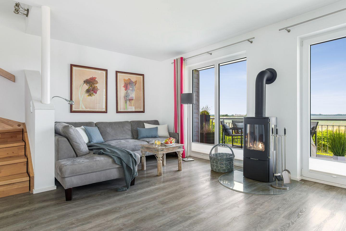 Der offene Wohnbereich im Erdgeschoss ist lichtdurchflutet und lässt die Grenzen zwischen Innen und Außen verschwimmen. Große Fenster holen das Wasser direkt ins Wohnzimmer. Ob beim Frühstück am Esstisch, beim Lesen auf dem Sofa oder draußen auf der Terrasse – das Schleiufer ist immer ganz nah. Die Küche ist hochwertig ausgestattet und bietet alles, was Sie für genussvolle Urlaubstage brauchen.