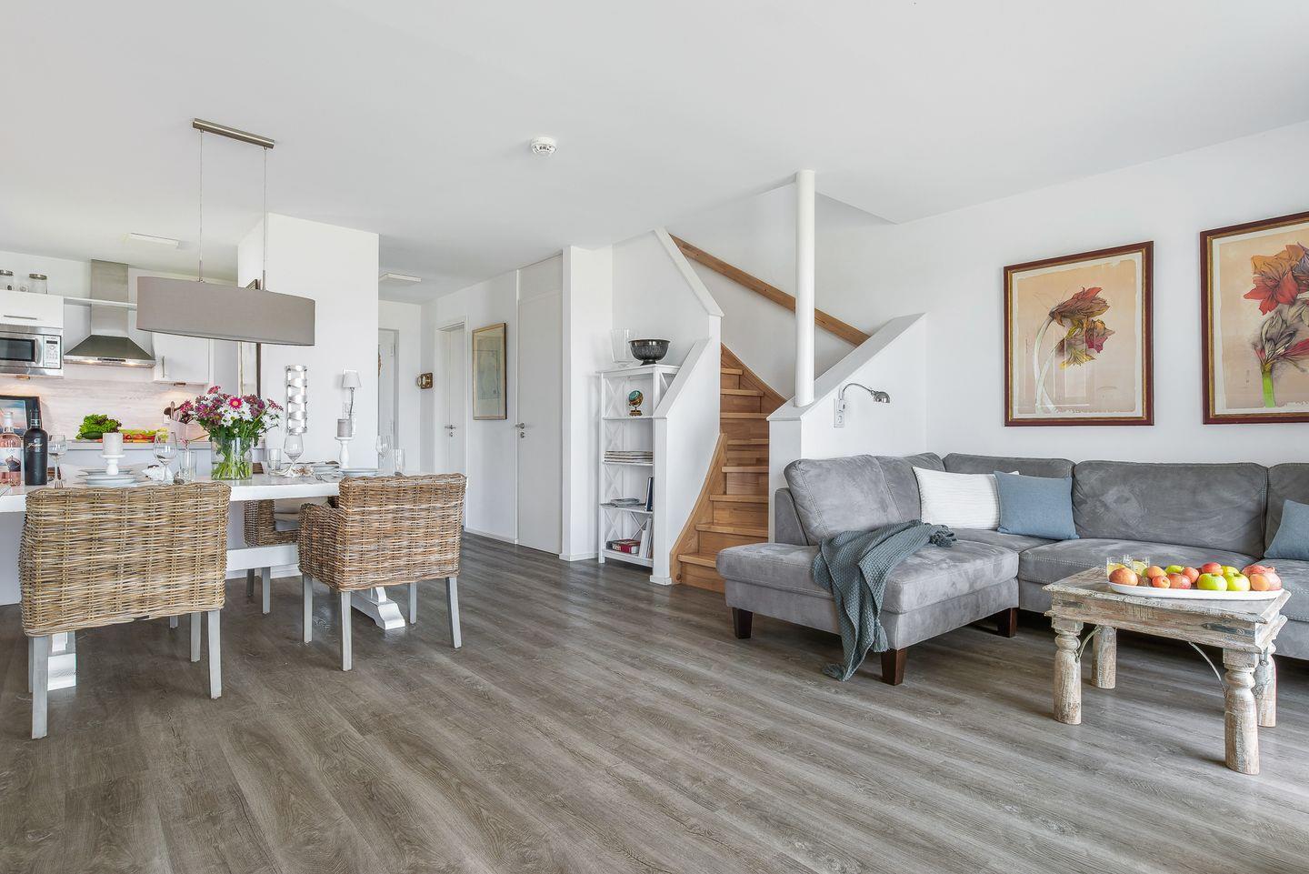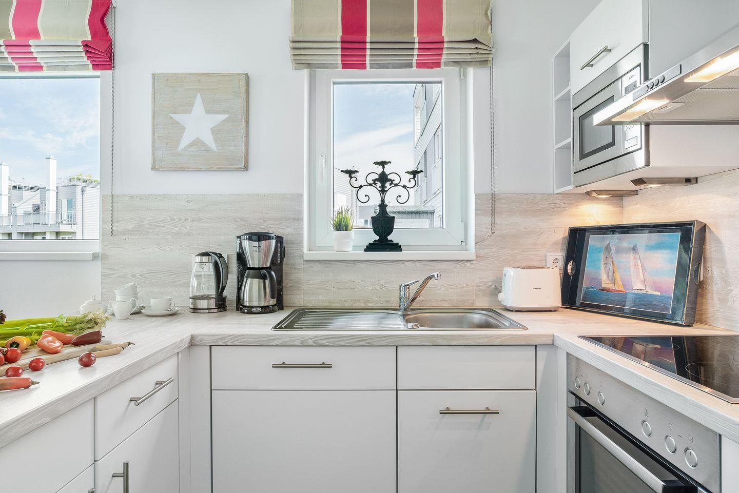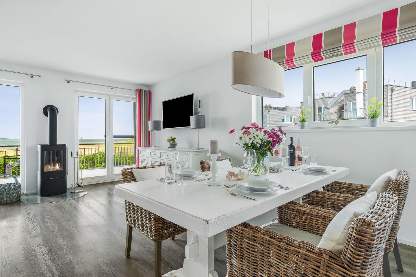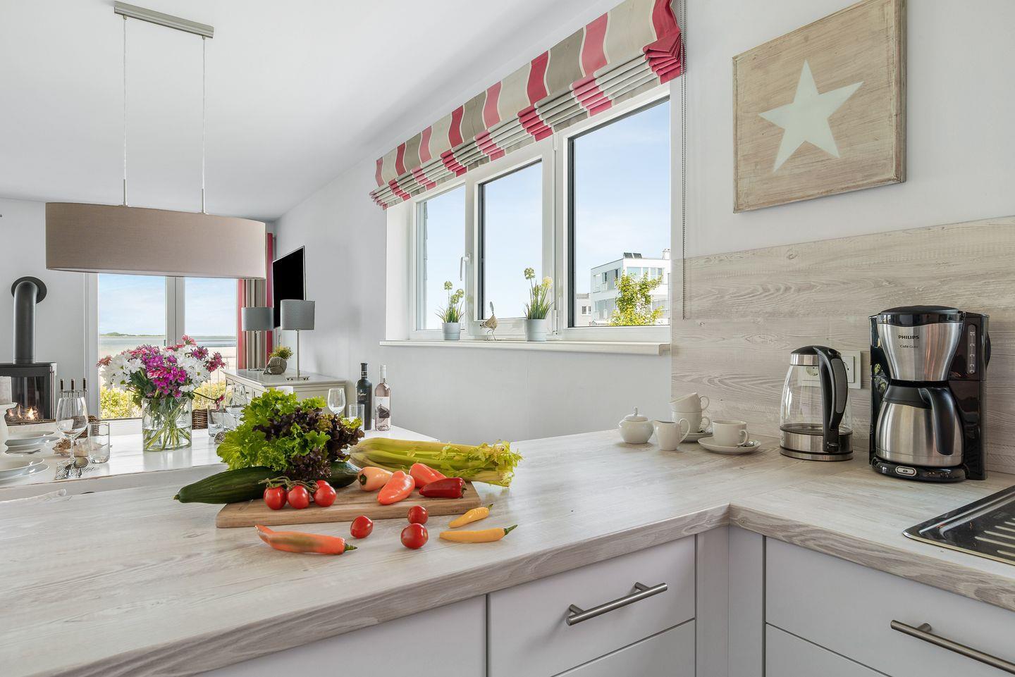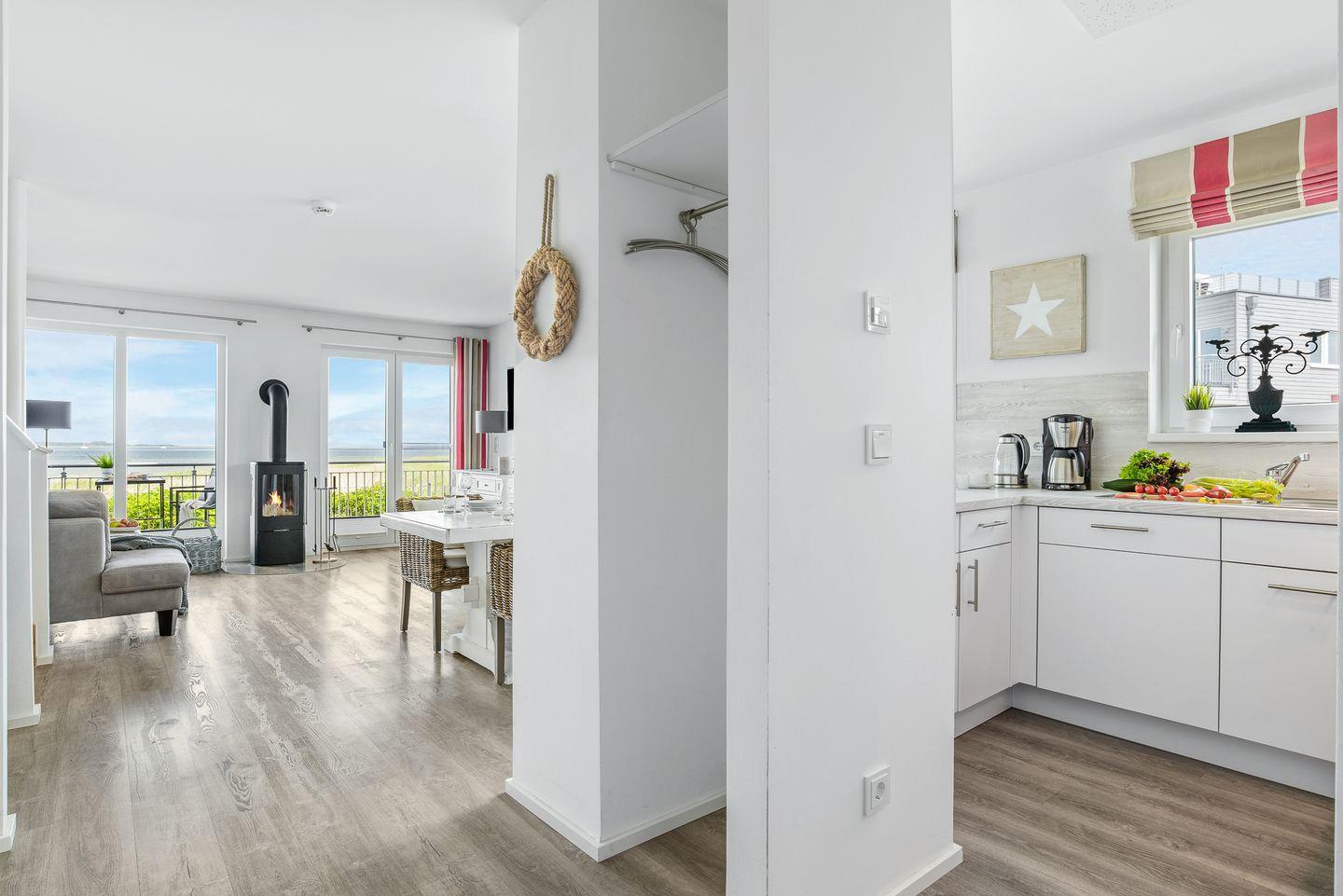 Der offene Wohnbereich im Erdgeschoss ist lichtdurchflutet und lässt die Grenzen zwischen Innen und Außen verschwimmen. Große Fenster holen das Wasser direkt ins Wohnzimmer. Ob beim Frühstück am Esstisch, beim Lesen auf dem Sofa oder draußen auf der Terrasse – das Schleiufer ist immer ganz nah. Die Küche ist hochwertig ausgestattet und bietet alles, was Sie für genussvolle Urlaubstage brauchen.