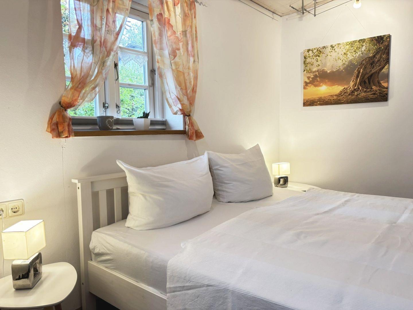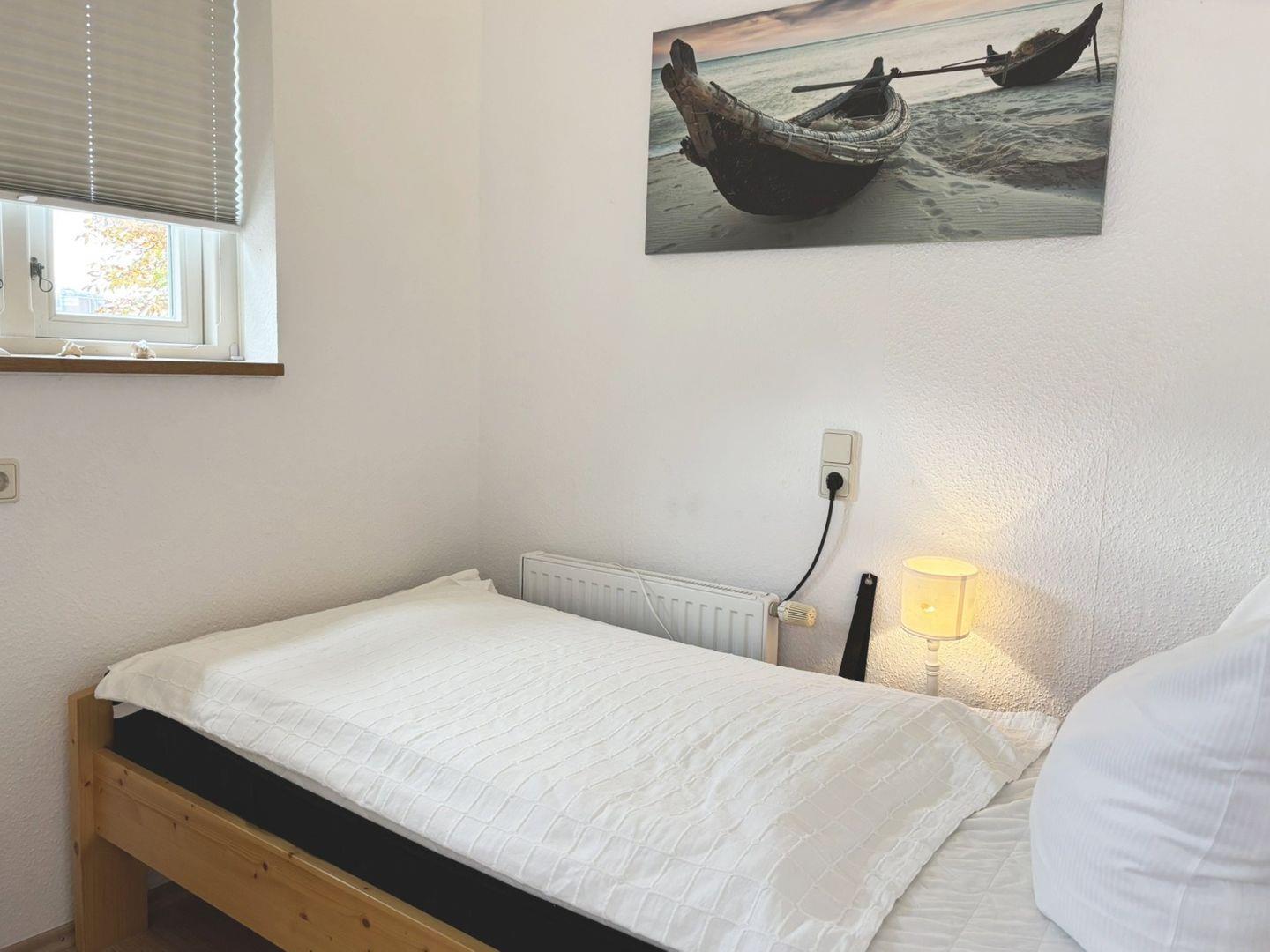 Das Ferienhaus verfügt über zwei Schlafzimmer. Im ersten Schlafzimmer schlafen Sie in einem Doppelbett mit getrennten Matratzen (180 x 200 cm, offenes Fußende), ein Kleiderschrank bietet ausreichend Stauraum, und dank der Verdunklungsmöglichkeiten lässt es sich hier wunderbar ausschlafen. Das zweite Schlafzimmer ist mit zwei Einzelbetten (je 90 x 200 cm) ausgestattet und ebenfalls mit einem Kleiderschrank und Verdunklung versehen. Das zusätzliche Schlafsofa im Wohnzimmer sorgt für Flexibilität und Komfort für bis zu sechs Personen.