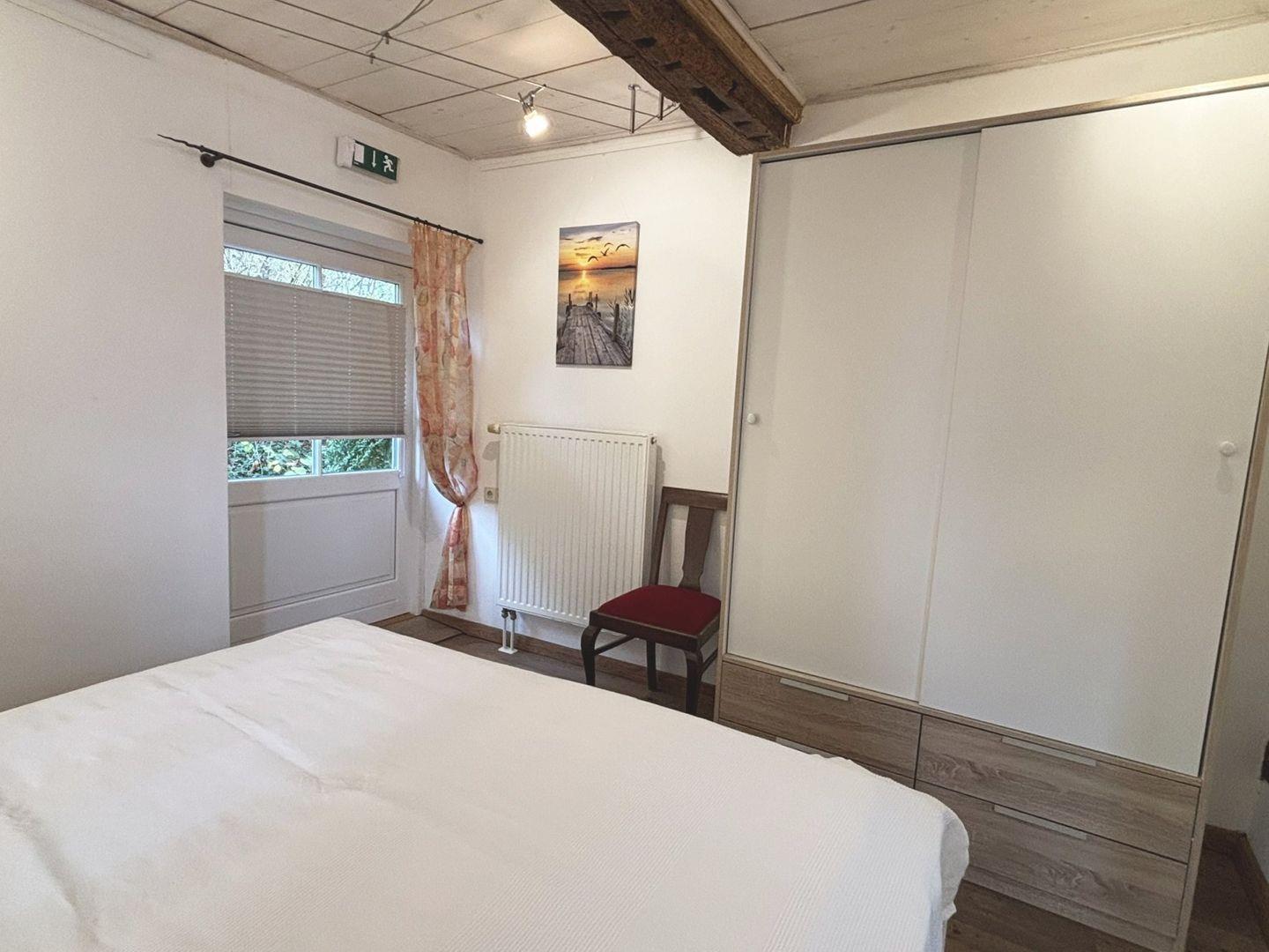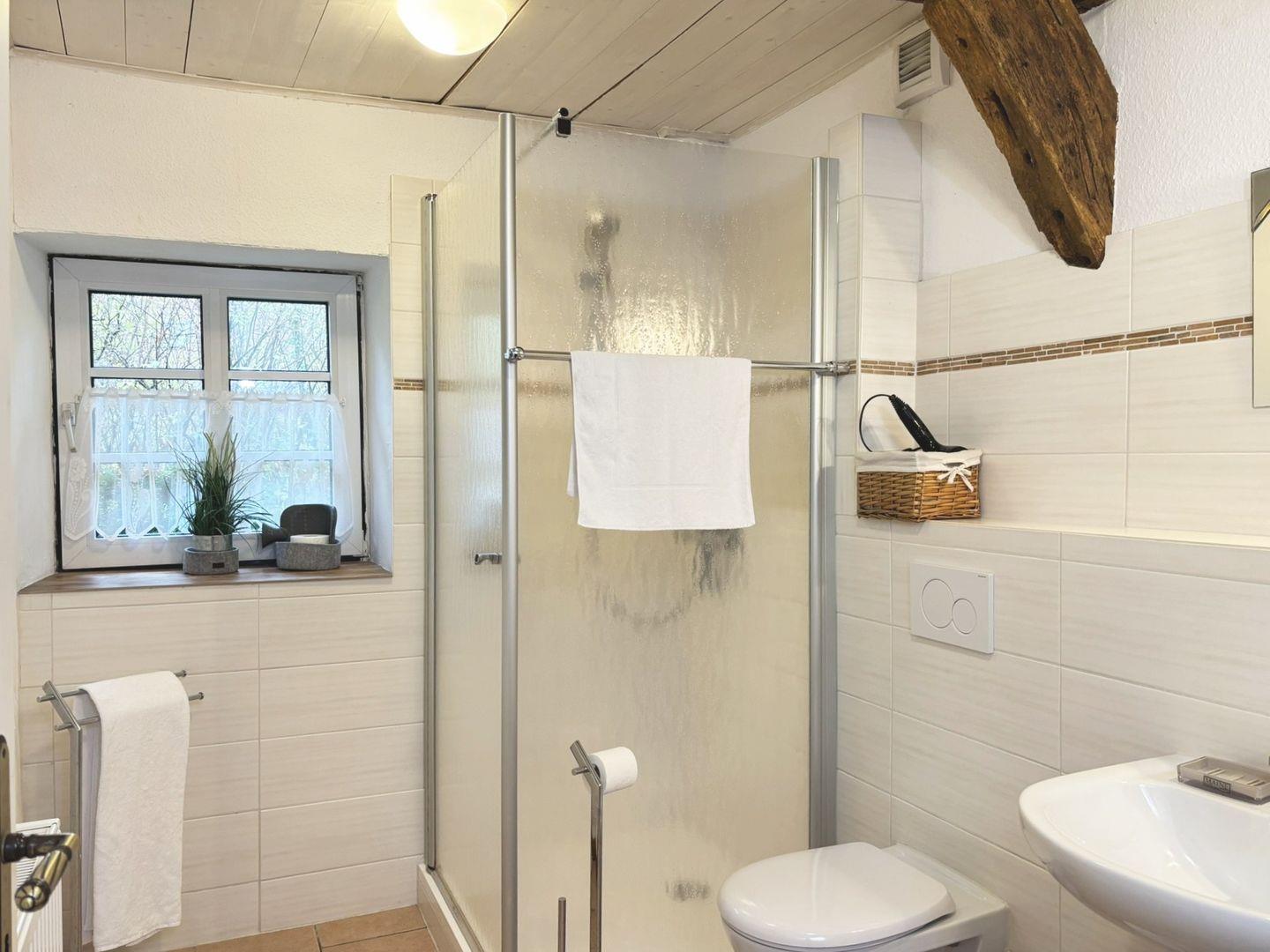 Das Badezimmer wurde vollständig renoviert und ist mit Dusche, WC, Waschbecken, Spiegel, Fenster und einem Haartrockner ausgestattet. Eine Waschmaschine steht zur gemeinschaftlichen Nutzung im benachbarten Gebäude zur Verfügung. Darüber hinaus befindet sich im Obergeschoss ein zusätzliches Gäste-WC sowie ein praktischer Abstellraum für Gepäck oder Kleidung.