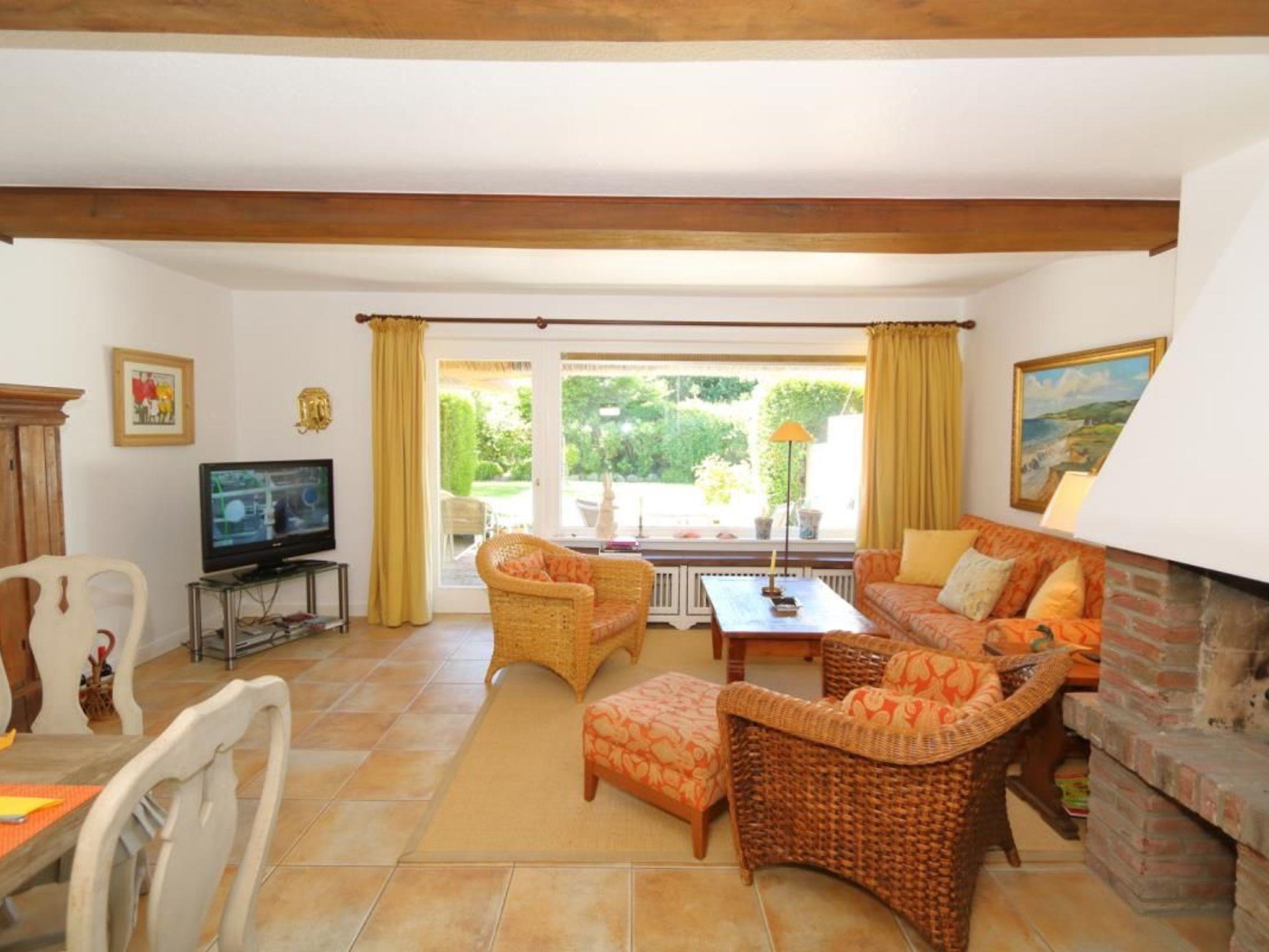EG: großzügiger, heller und stilvoll möblierter Wohnraum mit großem Flatscreen-TV und Bose-CD-Radio sowie offenem Kamin.