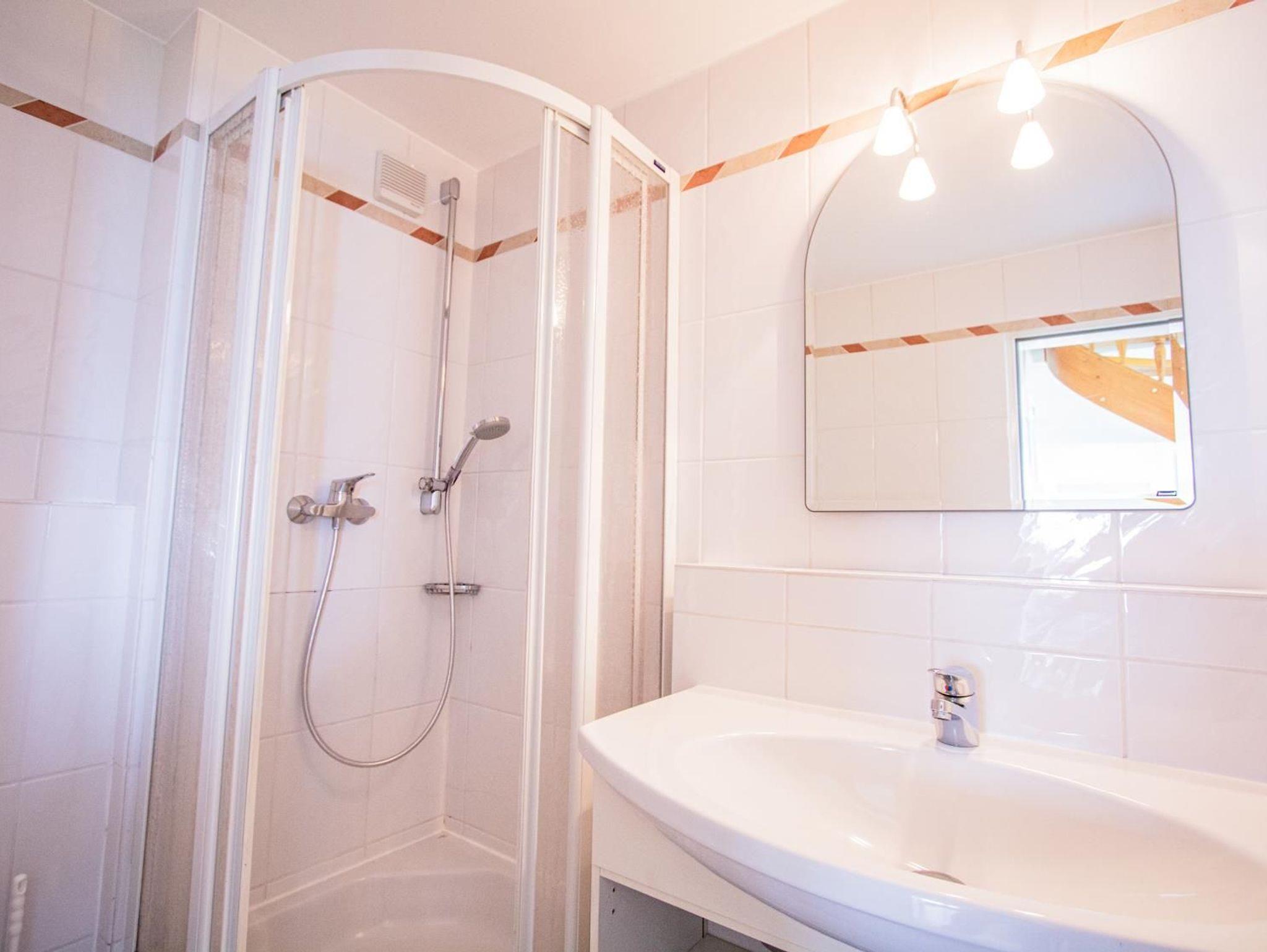 WC, Dusche, Waschbecken, Spiegel und ausreichend Handtücher und Vorleger.