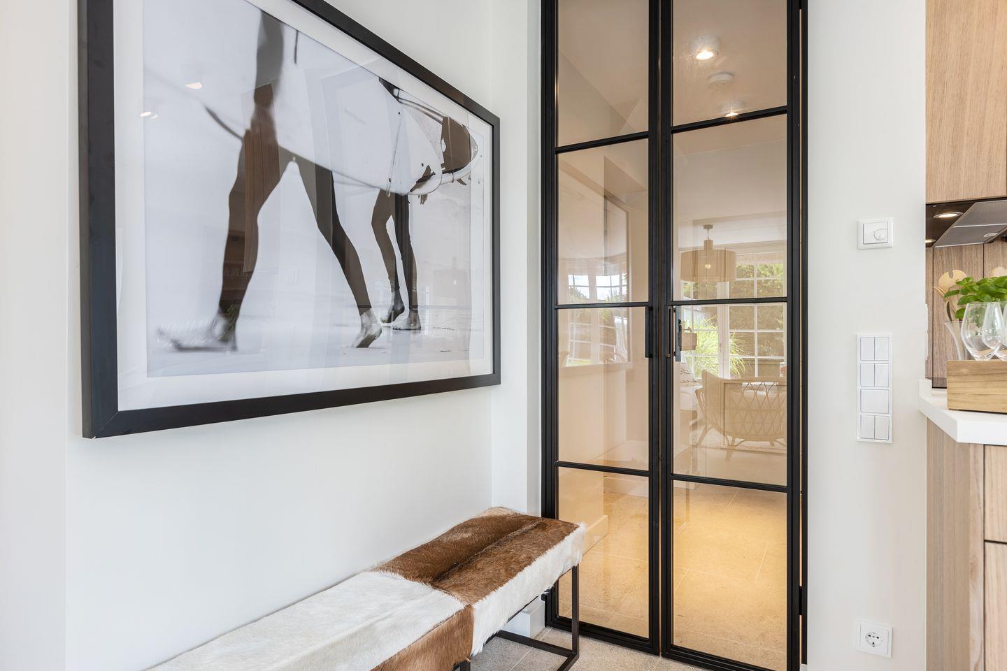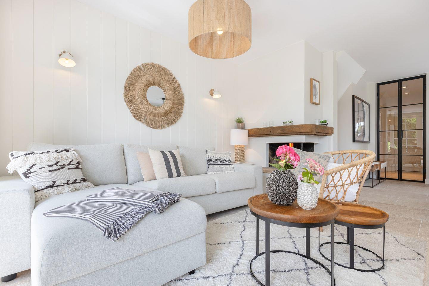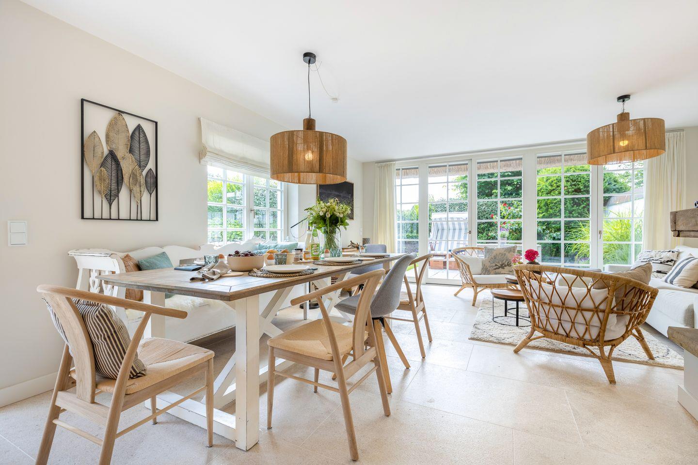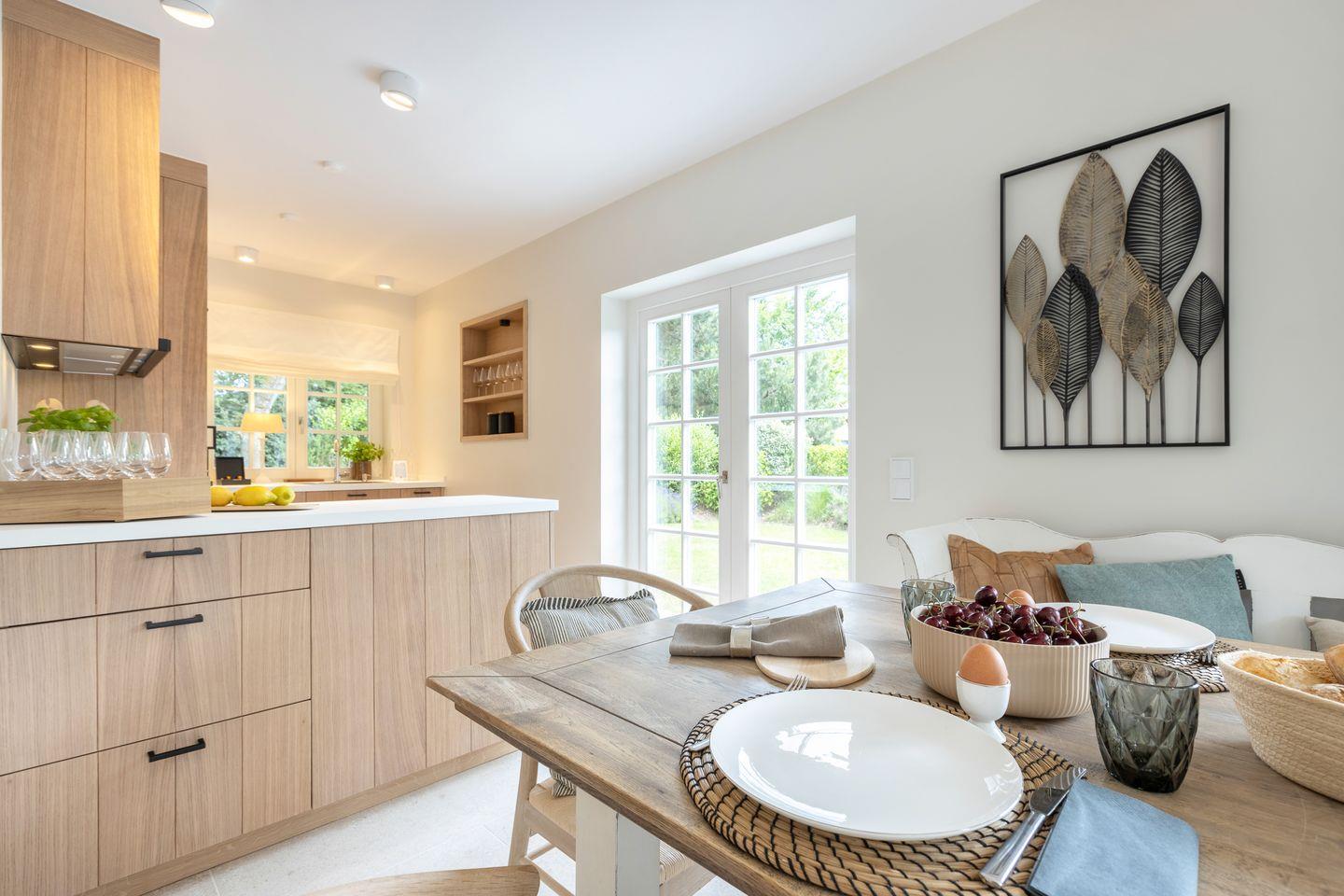 Der lichtdurchflutete Wohn- und Essbereich bildet das Herzstück des Hauses. Von hier aus gelangen Sie direkt auf Ihre beiden südöstlich ausgerichteten Terrassen, die zum Verweilen im Grünen einladen. Am Kamin lassen sich entspannte Abende verbringen, während der Blick in den weitläufigen, eingewachsenen Garten für eine besondere Atmosphäre sorgt. Die hochwertig ausgestattete, offene Küche schließt sich nahtlos an den exquisiten Essbereich an und schafft den idealen Rahmen für gesellige Stunden.