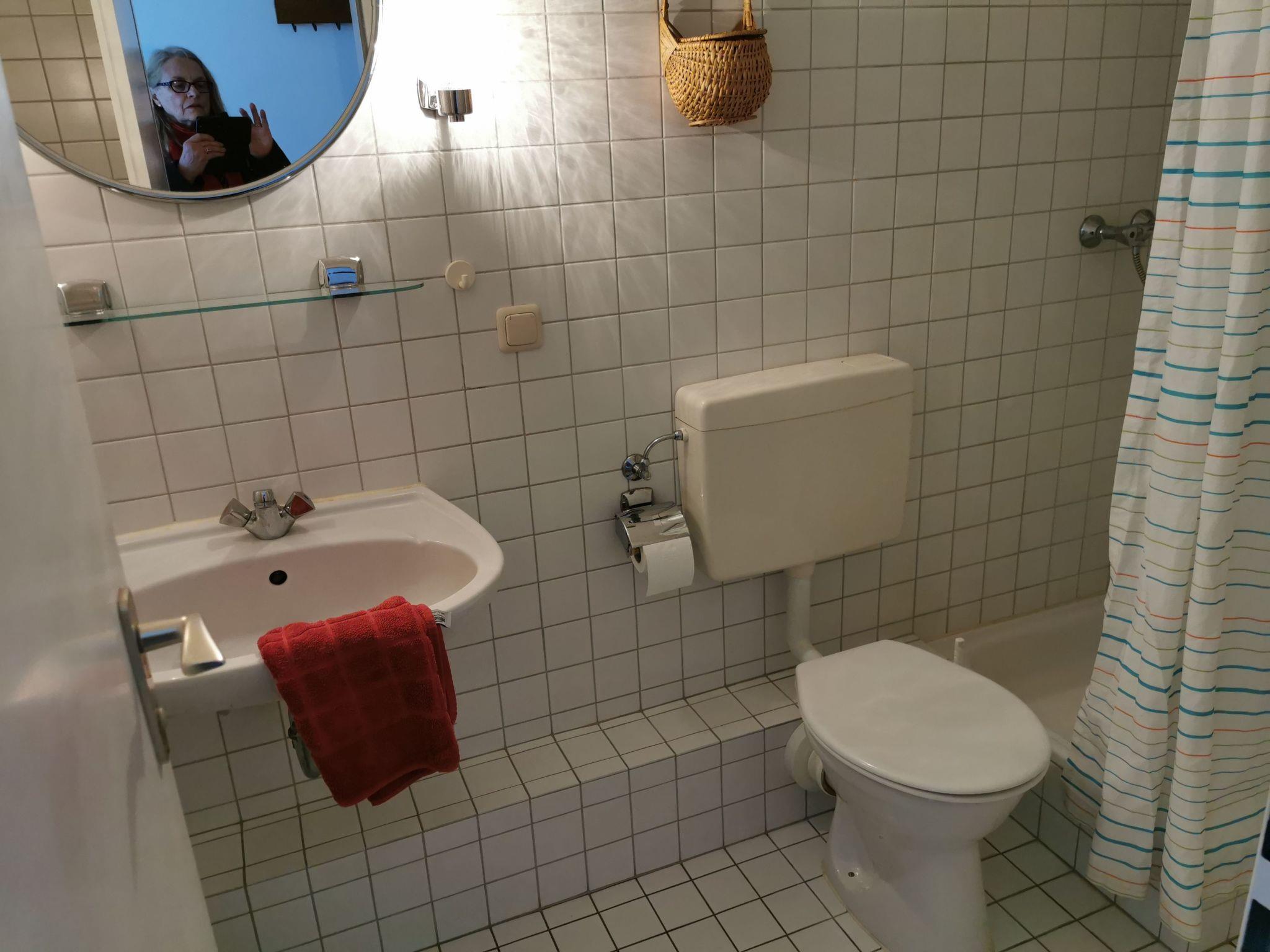 There are dark red stoneware tiles in the kitchen and the bathroom is tiled in white.