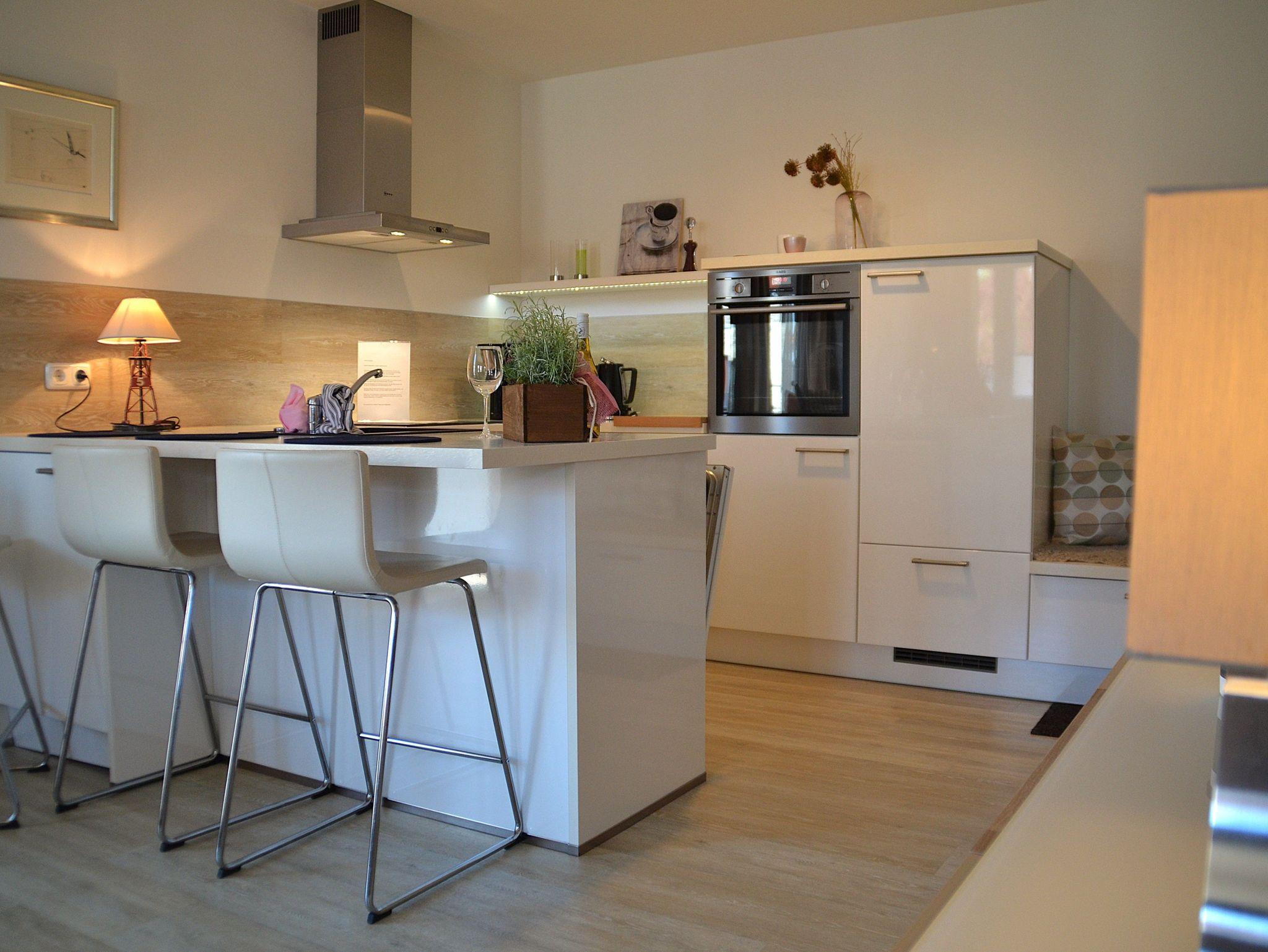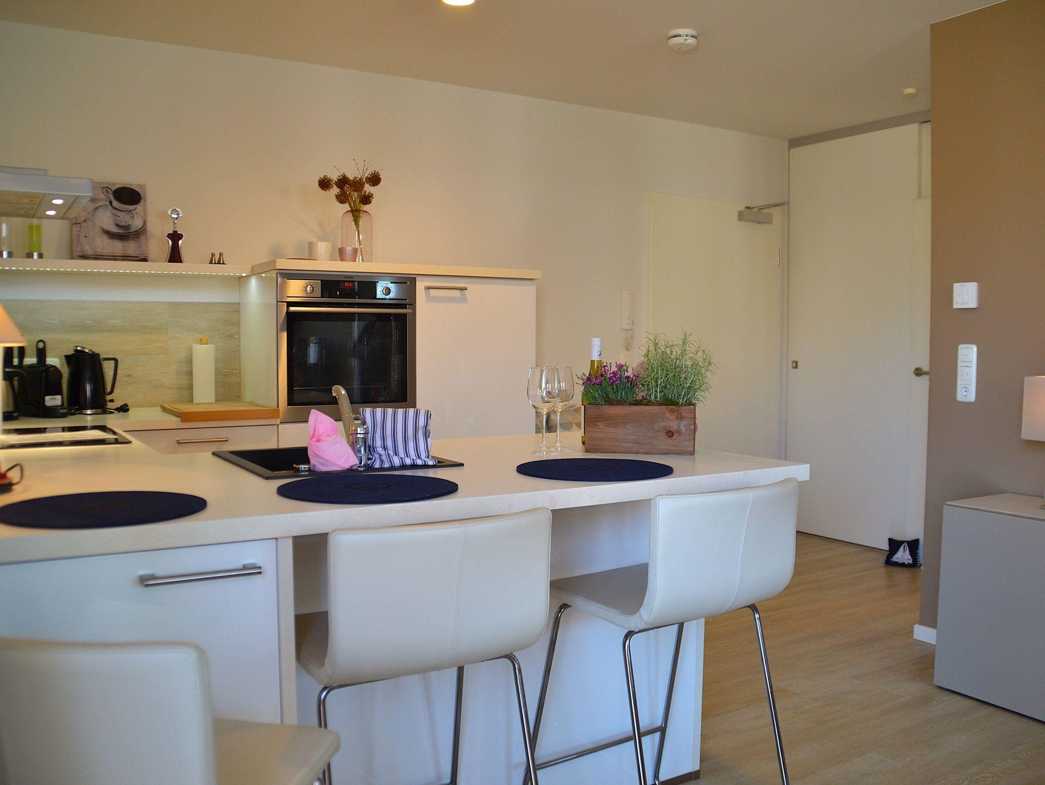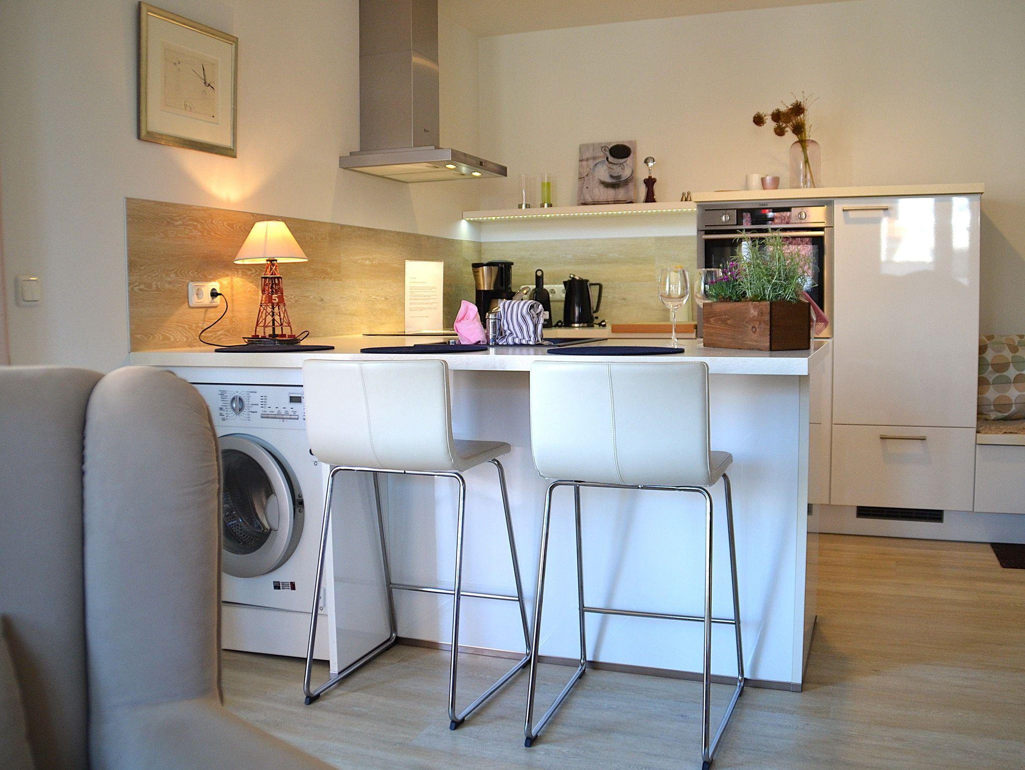 Die im Wohnraum integrierte Küche ist vollwertig ausgestattet. Es gibt einen Küchentresen mit 3 Stühlen.
