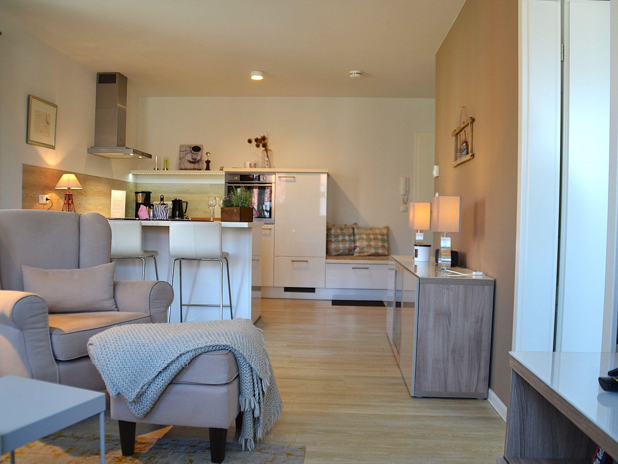 Der großzügige offene Wohnraum verfügt über ein gemütliches Sofa, sowie einen zum Lesen oder Kuscheln einladenden Sessel. Mit einer Liegefläche von 1,40 m x 1,90 m kann das hochwertige Sofa für eine mitreisende 3. Person zum Schlafen umfunktioniert werden. Für unterhaltsame Filmabende steht Ihnen ein internetfähiger Flachbildfernseher zur Verfügung. Im gesamten Appartement können Sie kostenlos WLAN nutzen.