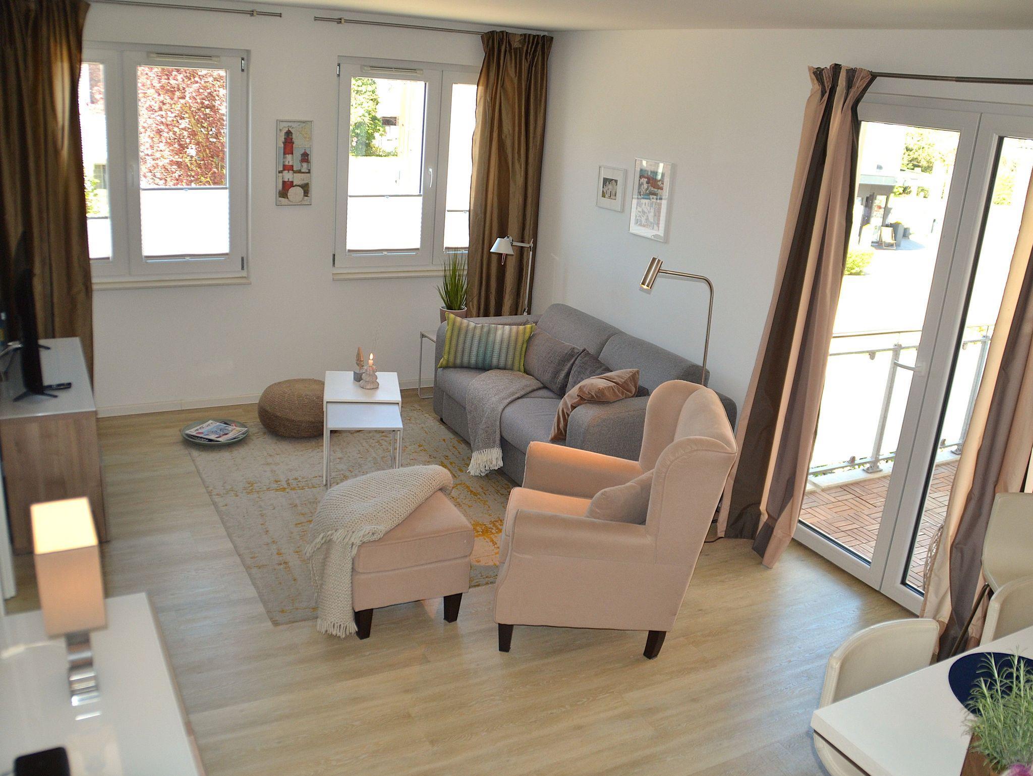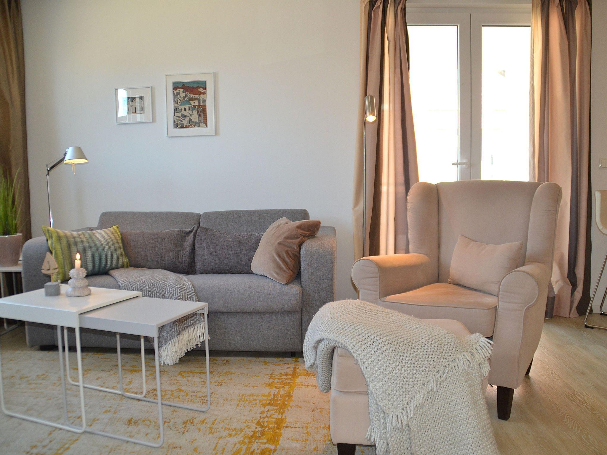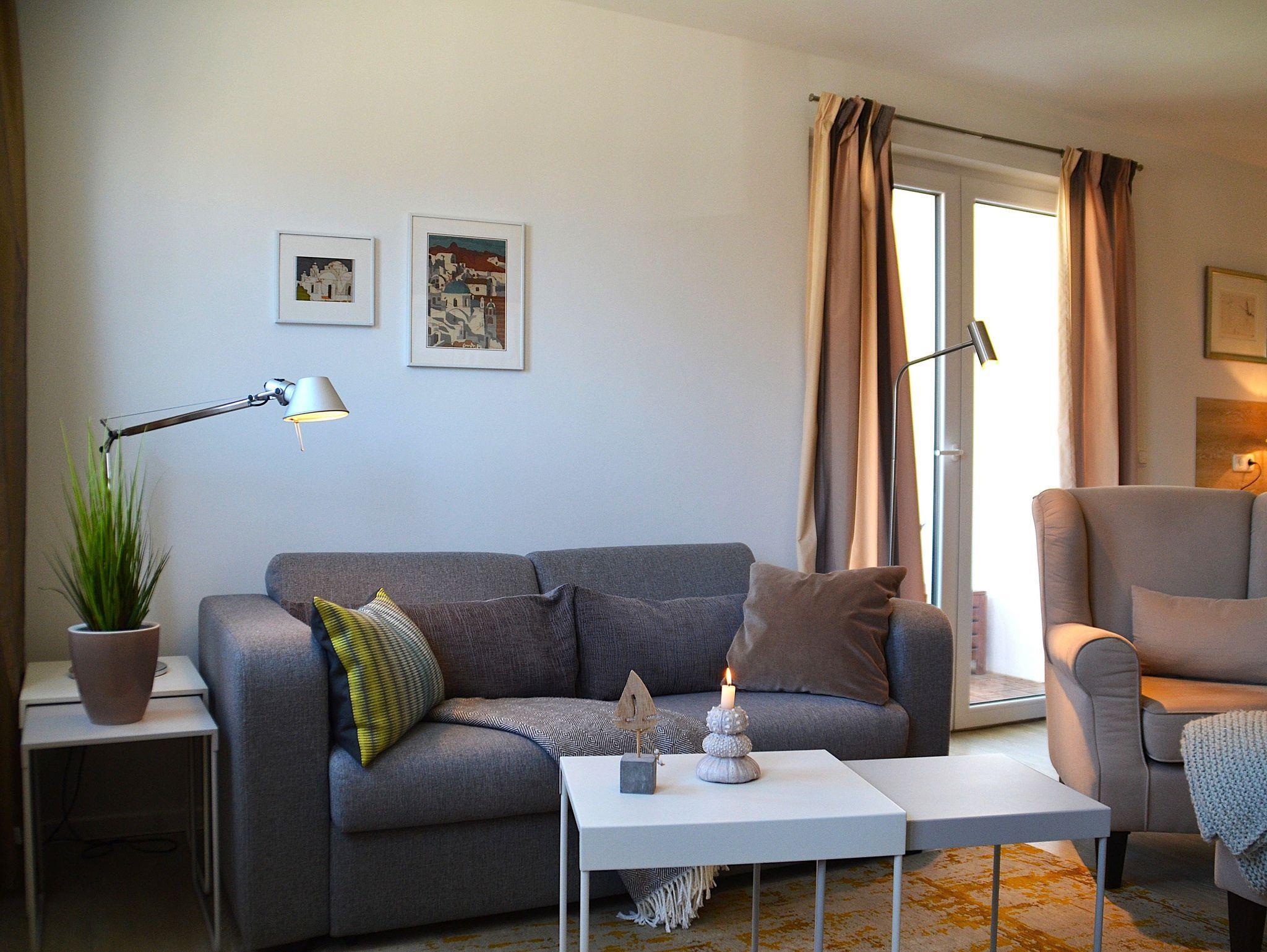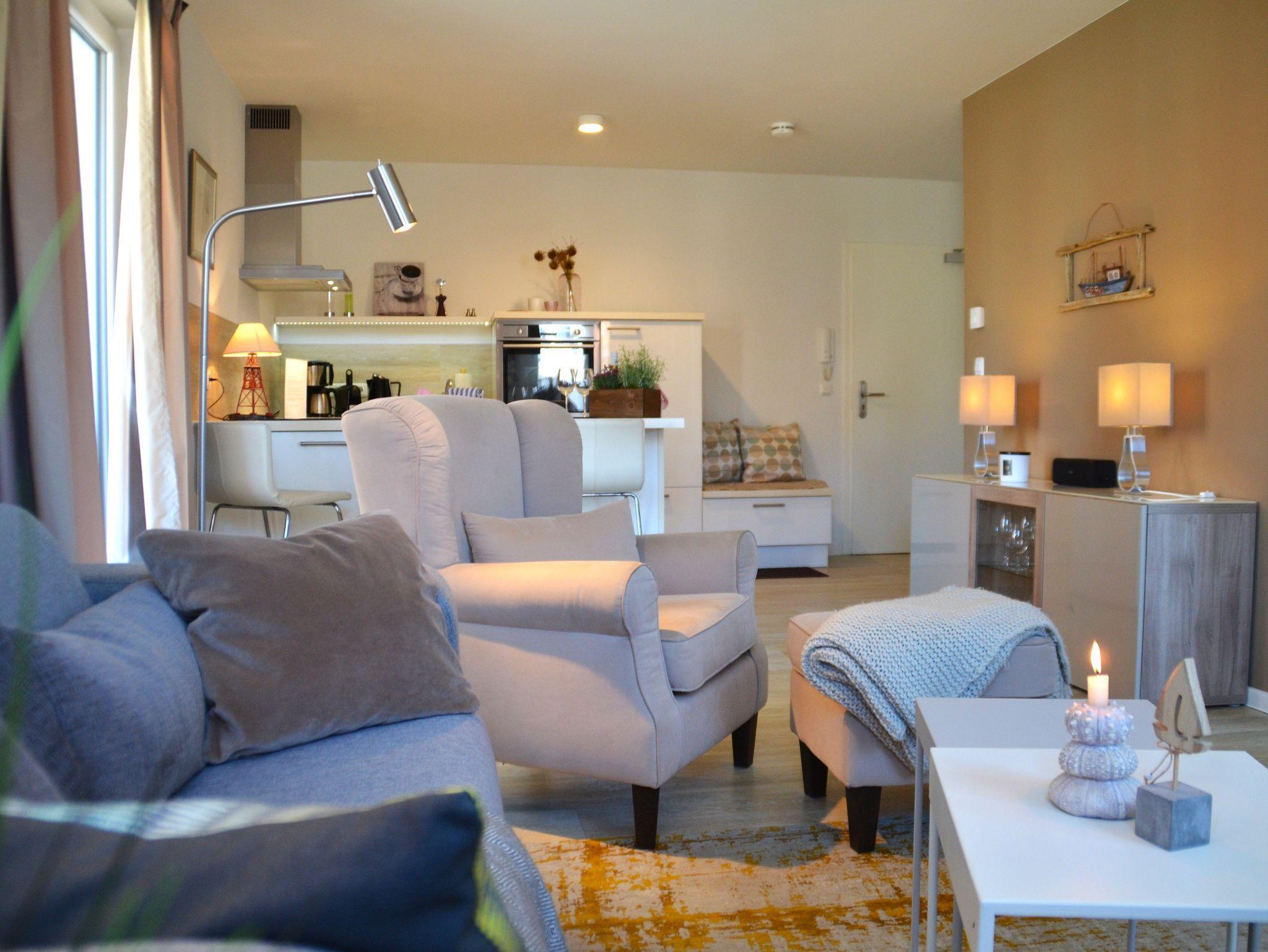 Der großzügige offene Wohnraum verfügt über ein gemütliches hochwertiges Sofa (als Schlafcouch für eine 3. Person nutzbar, Liegefläche 1,40 m x 1,90 m)und einen Sessel. Von hier aus geht es auf den möblierten, holzverlegten Balkon. Ab und an hört man sogar das Meeresrauschen.