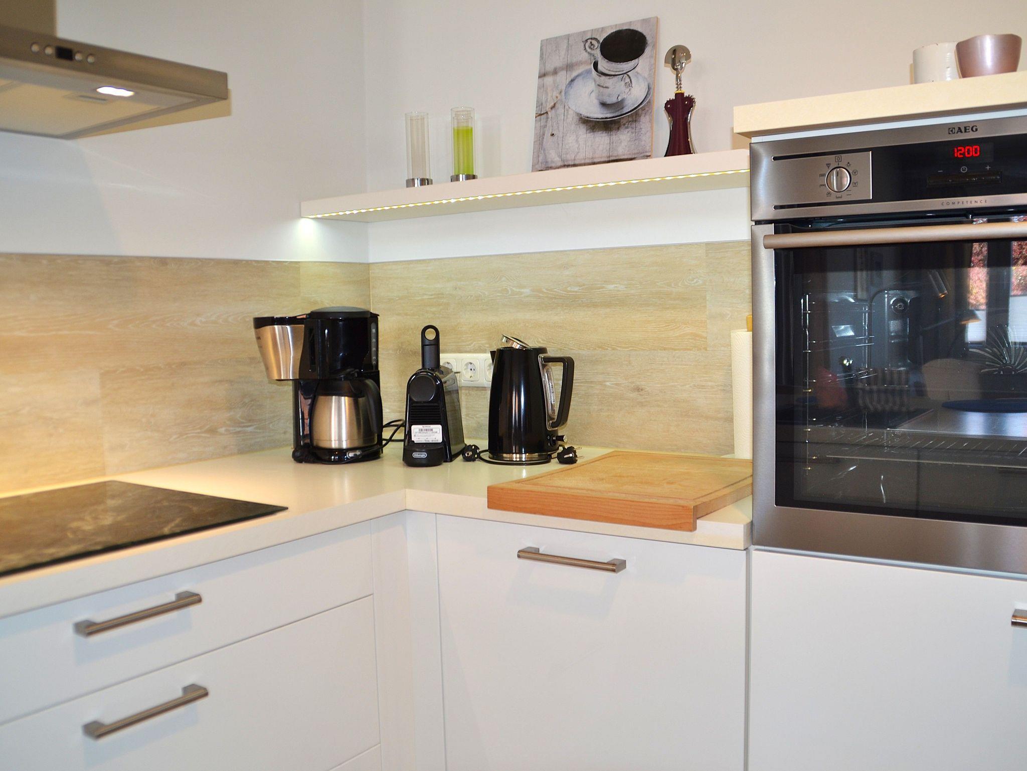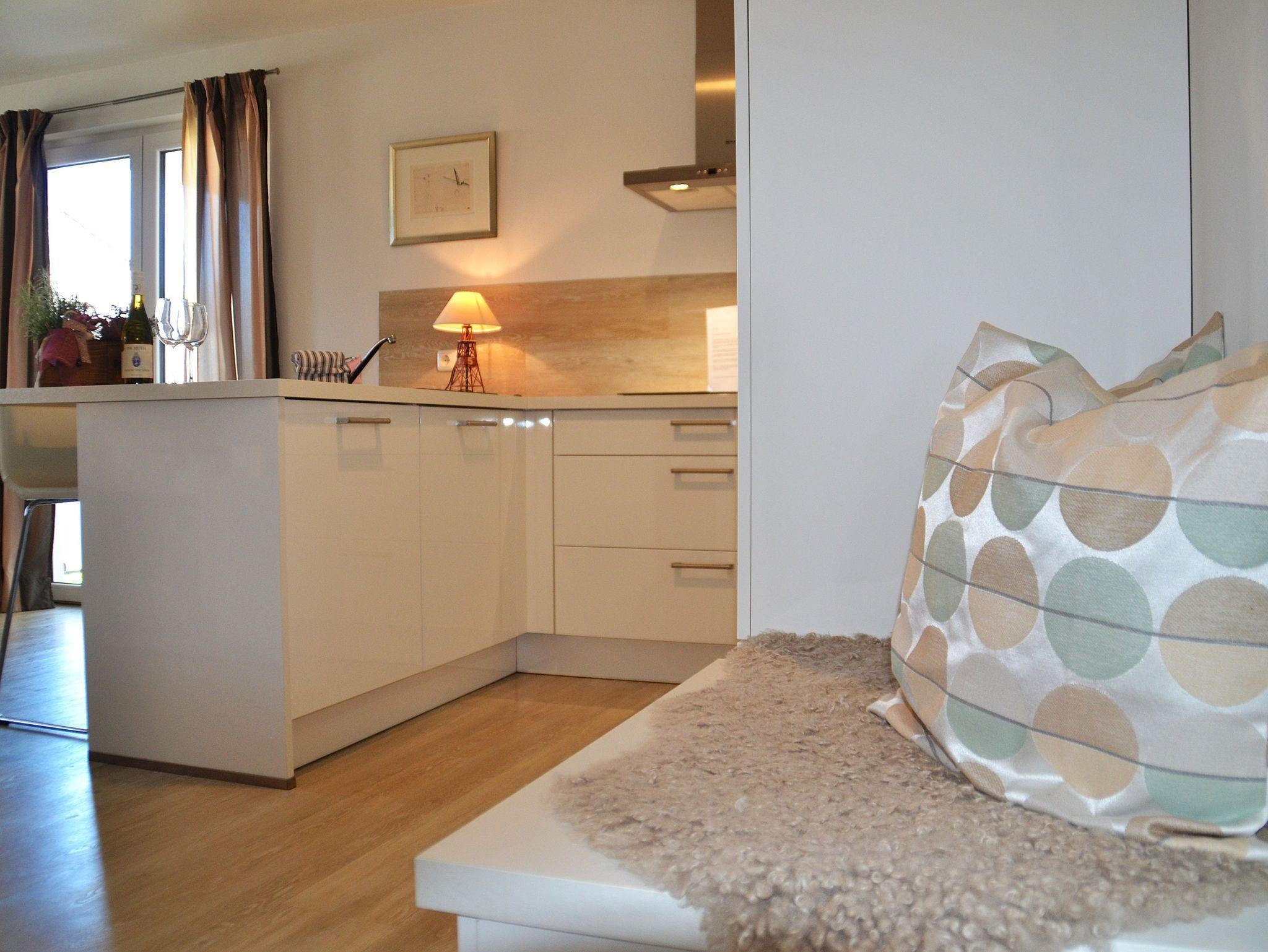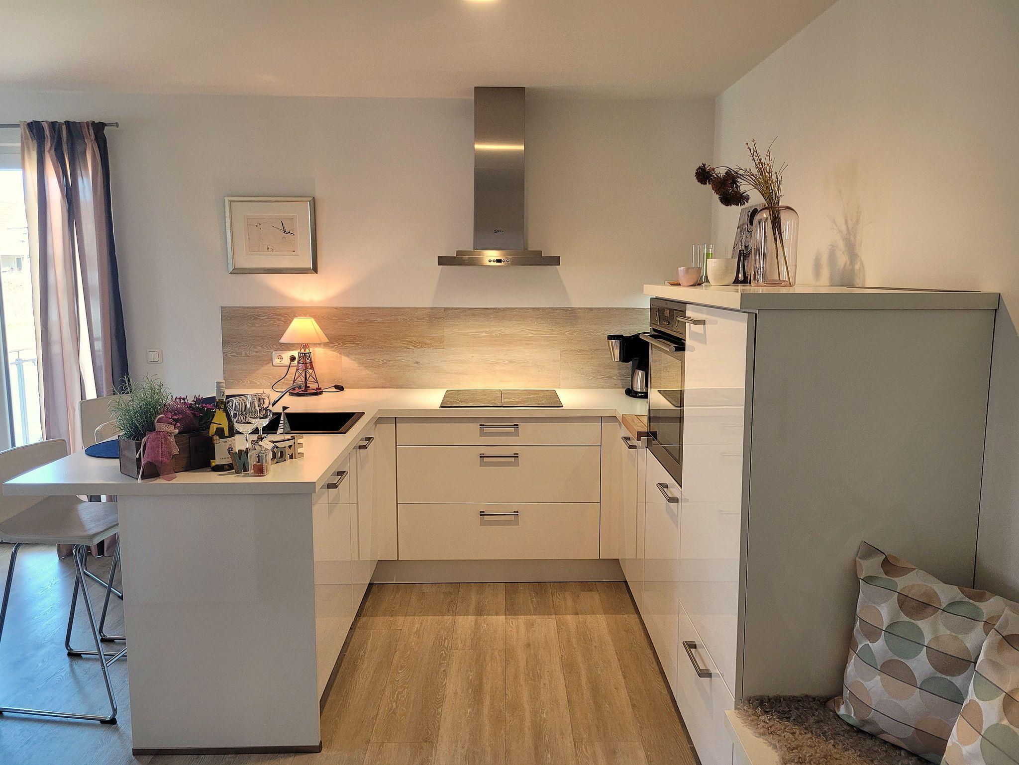 Die im Wohnraum integrierte Küche ist vollwertig ausgestattet mit Geschirrspüler, Cerankochfeld, Backofen, Kühlschrank mit Gefrierfach und vielen Geräten wie Kaffee- / und Espressomaschine, Toaster und Wasserkocher.