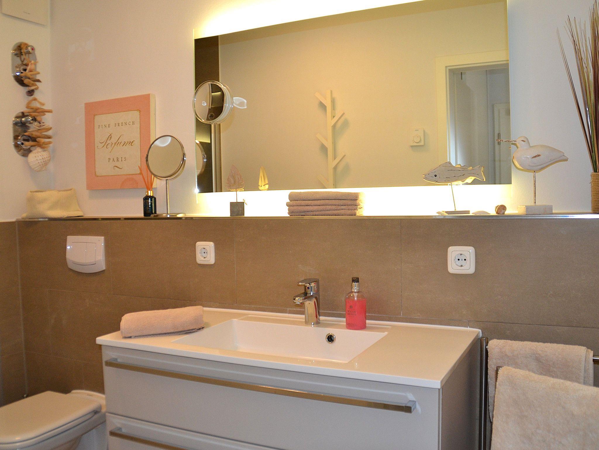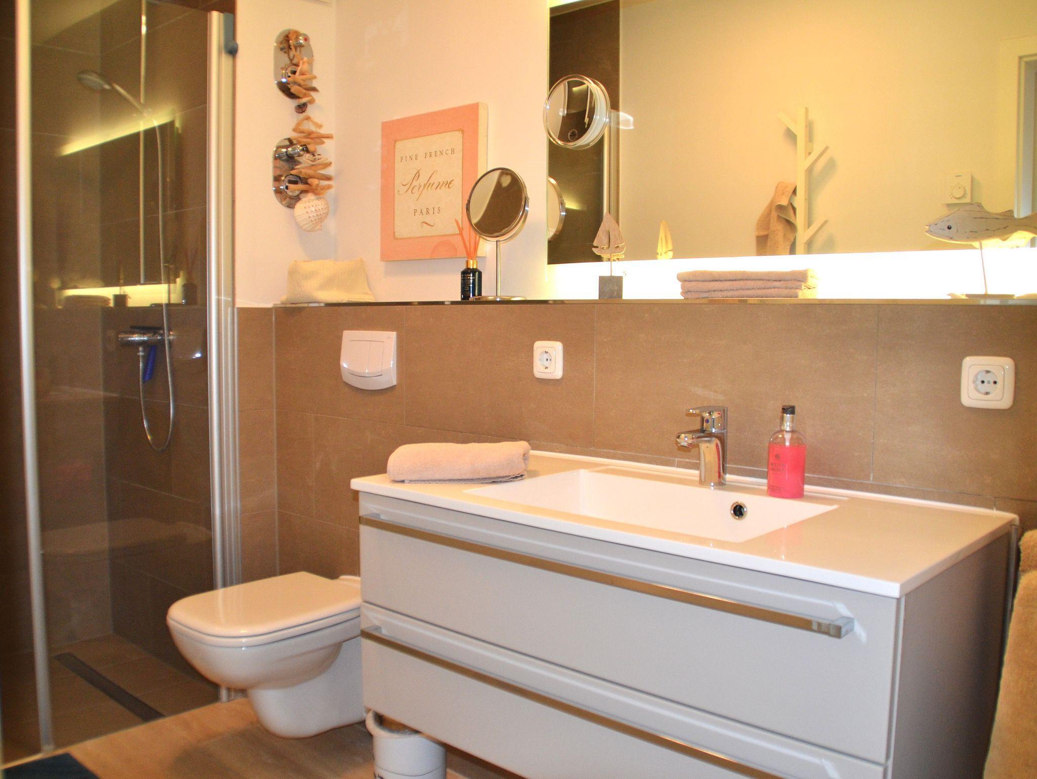 Im geschmackvollen Bad gibt es eine bodentiefe Dusche, ein breites Waschbecken, sowie einen großen Spiegel mit inkludiertem Vergrößerungsspiegel. Große Ablageflächen für all die Kosmetikartikel sind vorhanden.