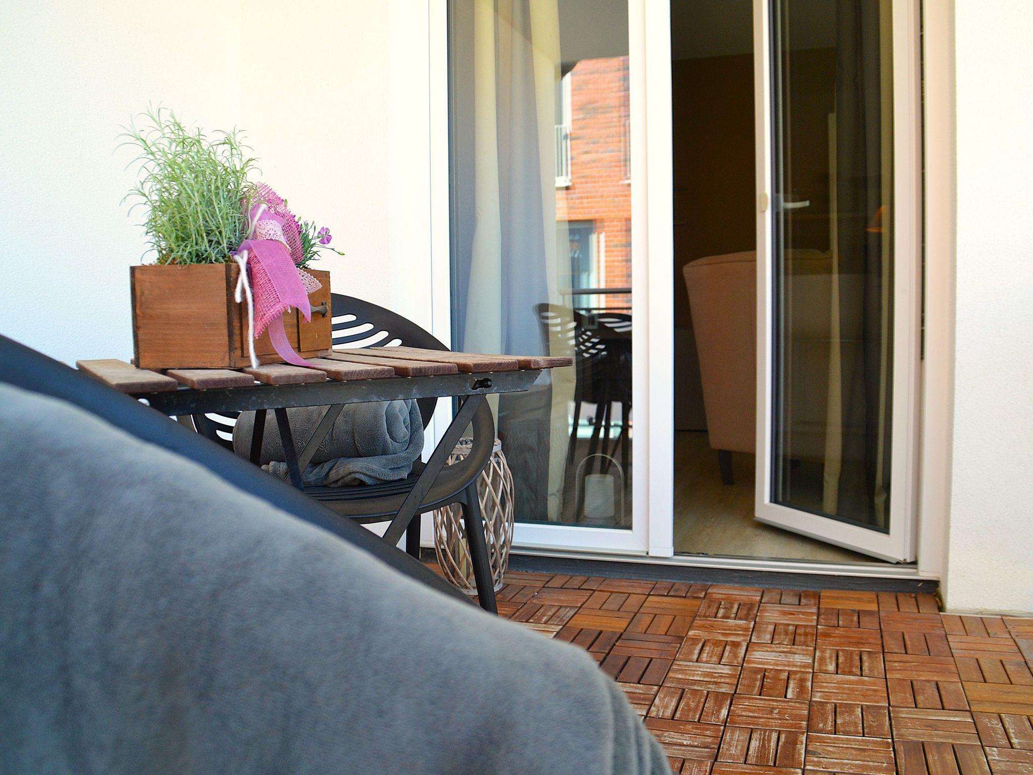 Von hier aus geht es auf den möblierten, holzverlegten Balkon, der genau die richtige Größe hat, um hier entspannende Urlaubszeit verbringen zu können - einfach die Seele baumeln lassen. Ab und an hört man sogar das Meeresrauschen.