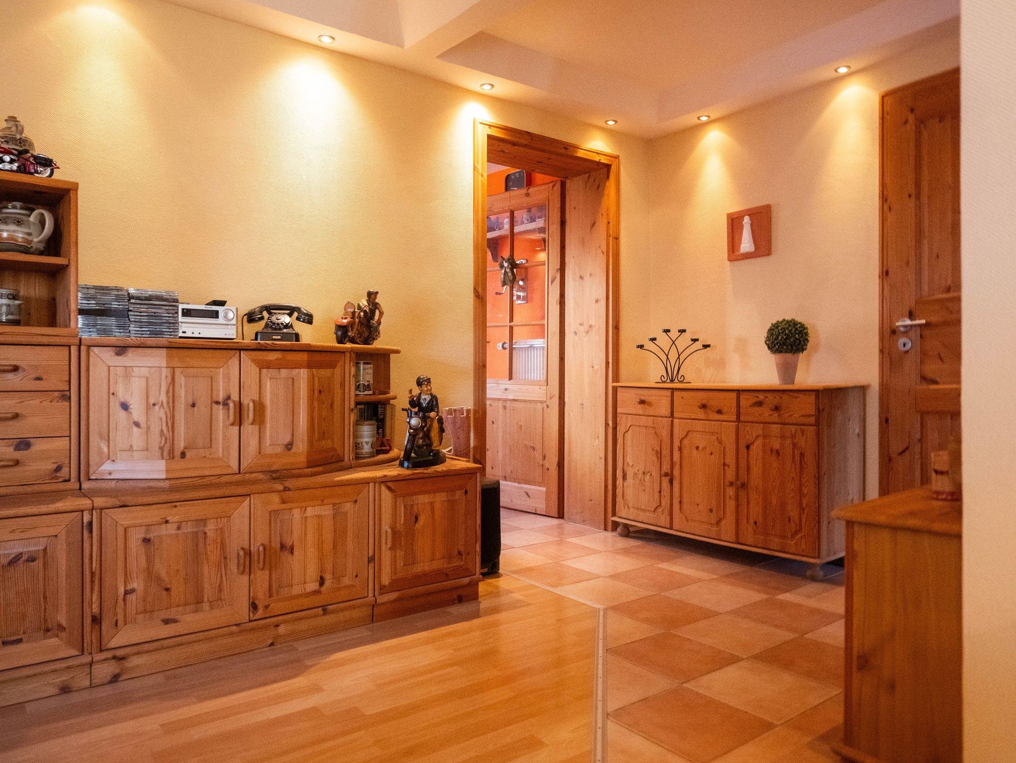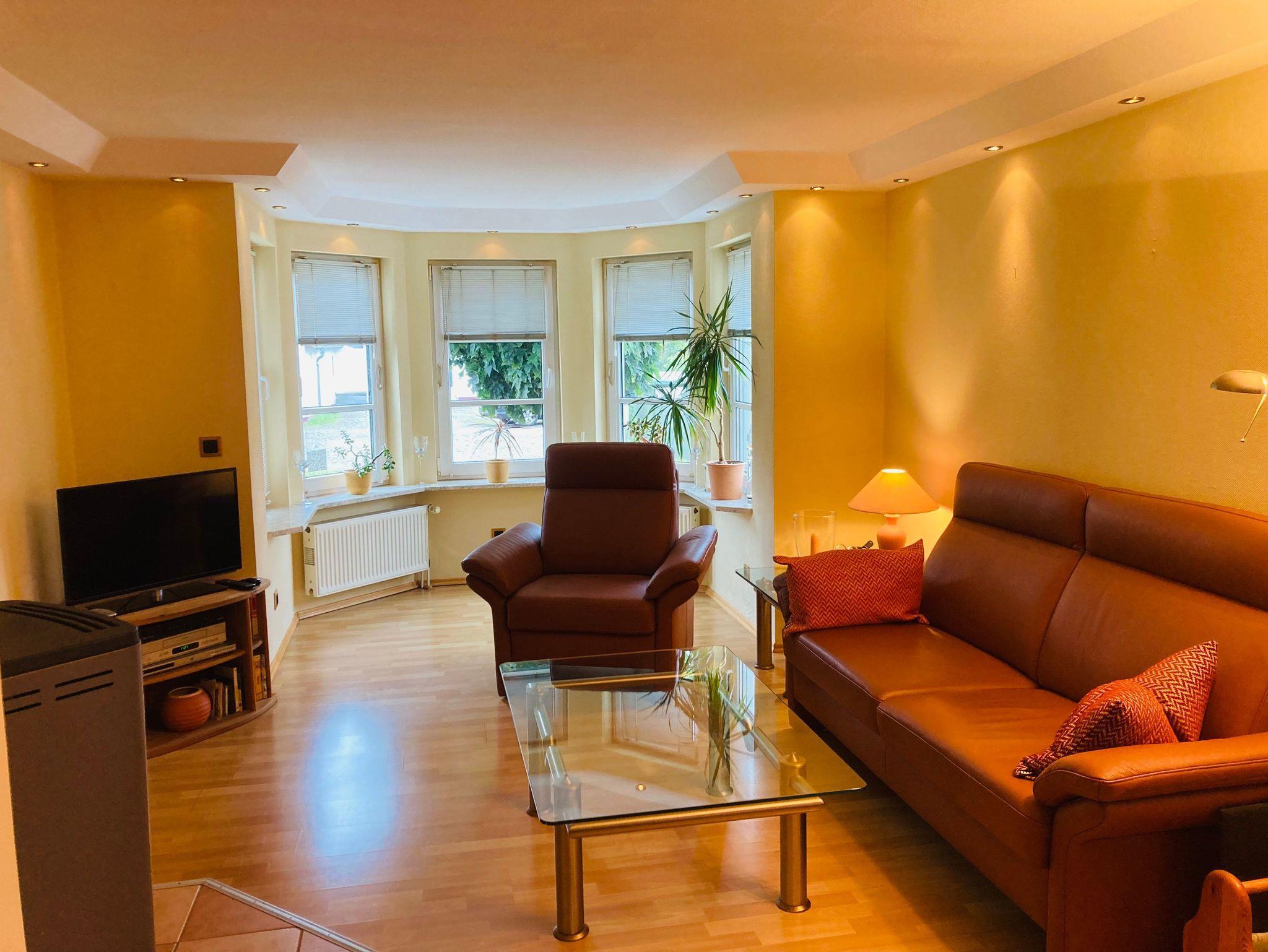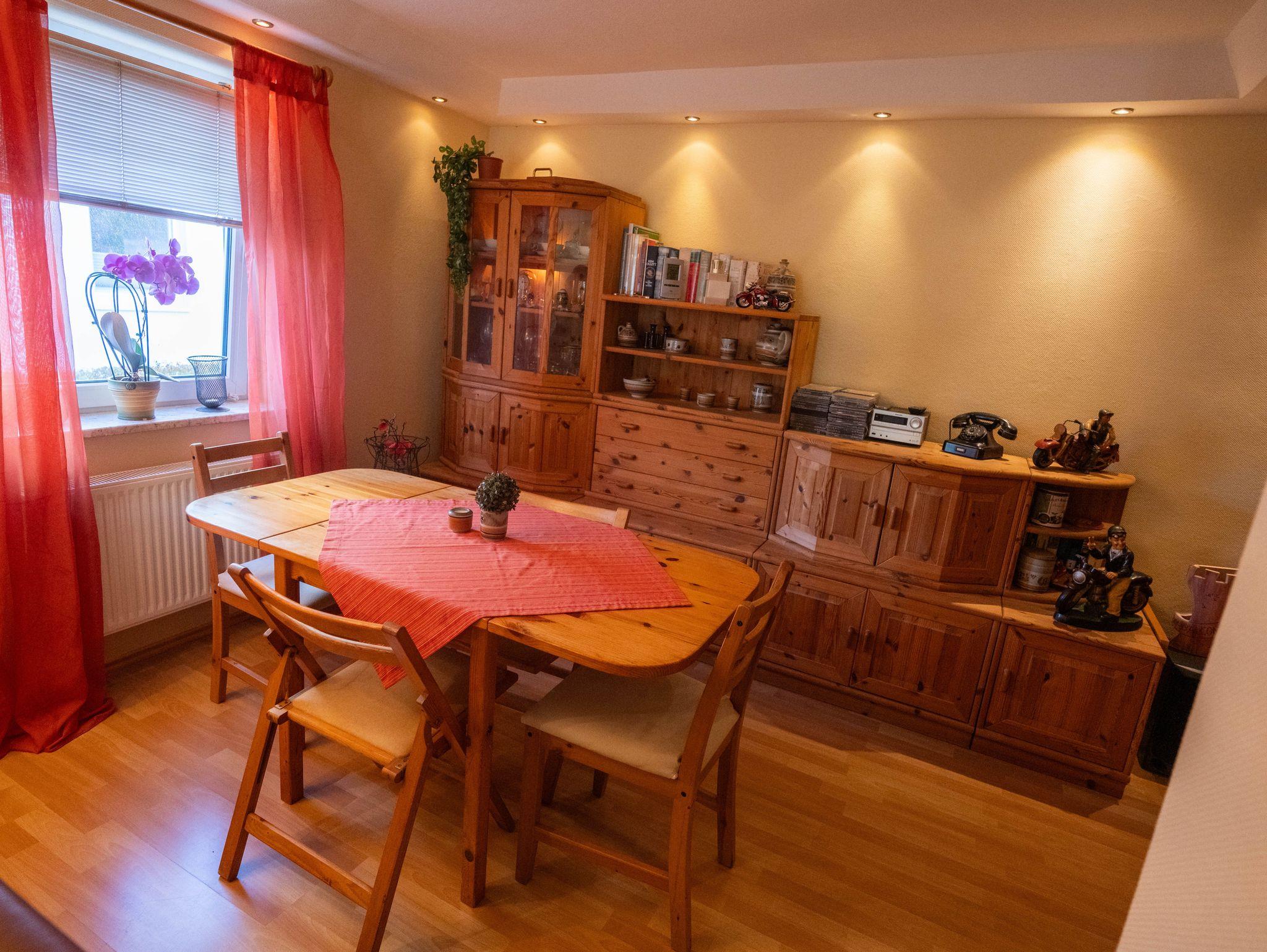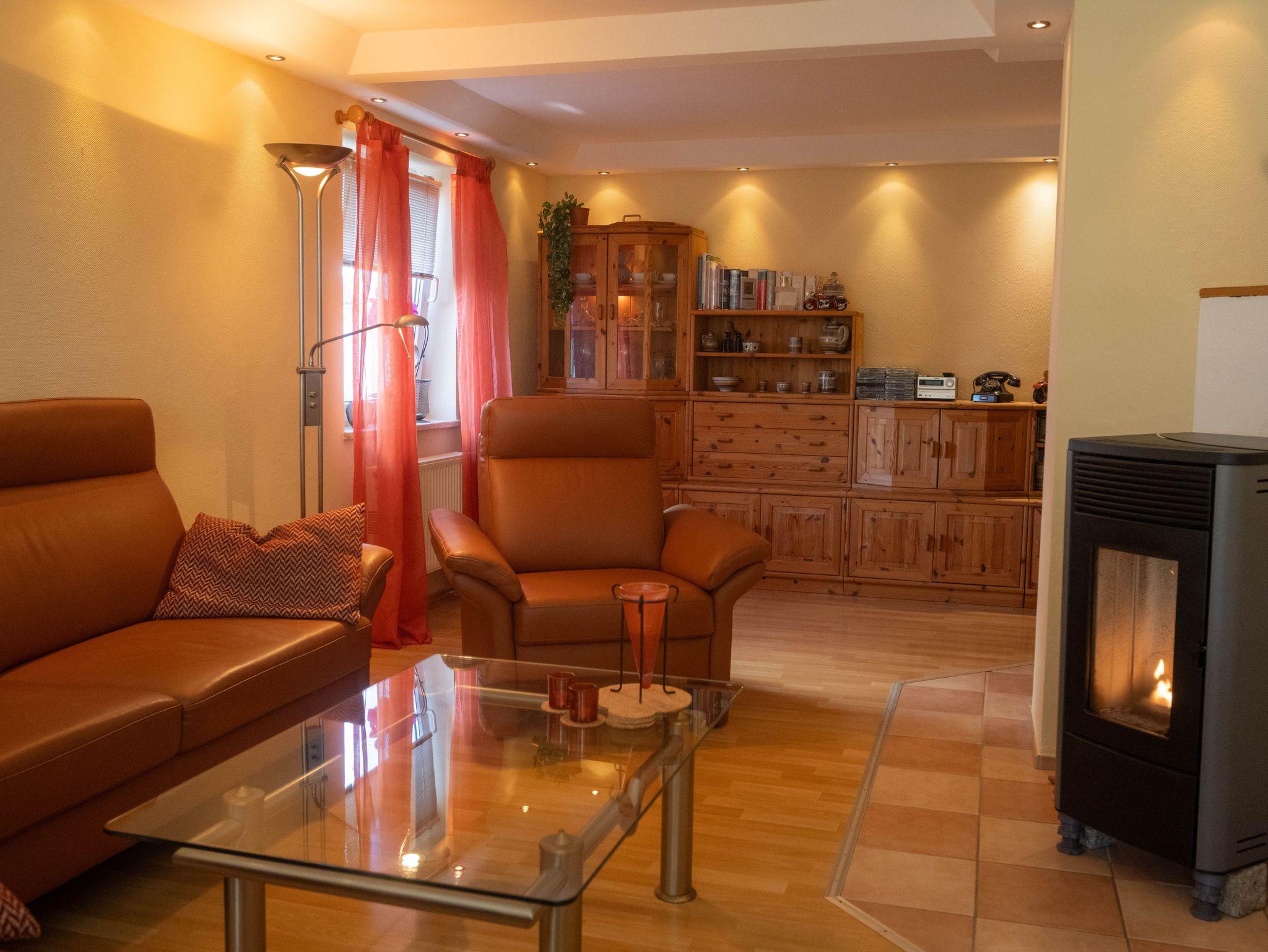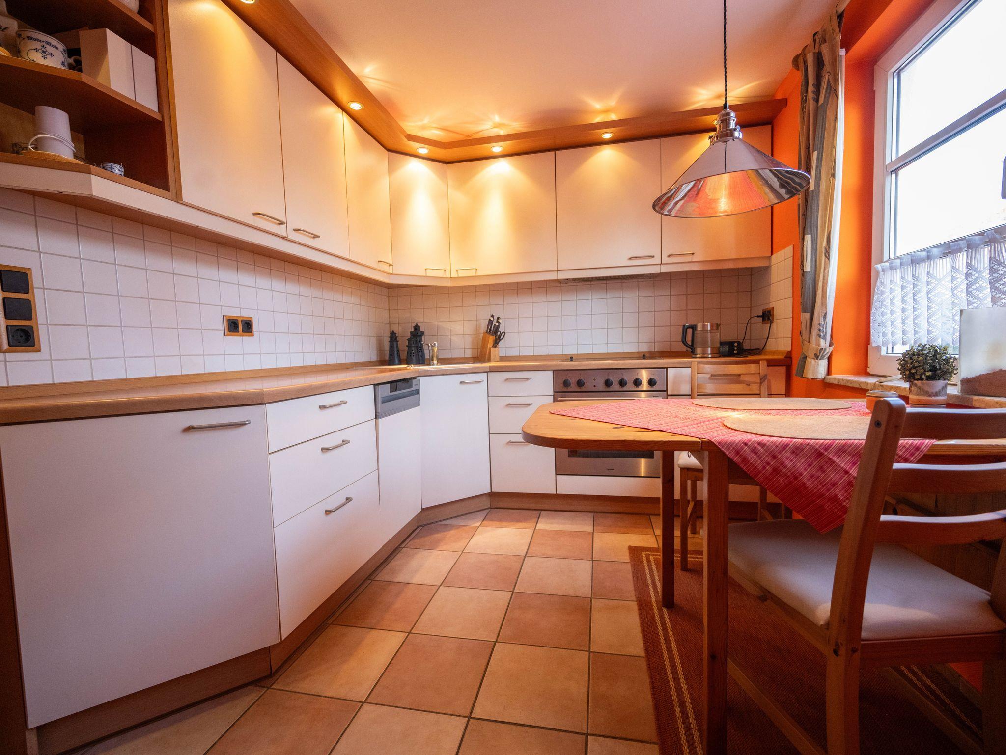 Der helle großzügige Wohnraum ist mit einem bequemen Sofa und Sessel zum Erker hin ausgestattet. Ein gemütlicher Fernsehsessel mit Fußteil lädt zu entspannter Urlaubszeit ein. Über den großen internetfähigen Flachbildfernseher können Sie auch im Urlaub Ihre Lieblingsfilme und -serien empfangen. An kalten, ungemütlichen Tagen trägt der Ofen mit seiner angenehmen verströmenden Wärme zur Gemütlichkeit bei. WLAN ist selbstverständlich inkl. im gesamten Haus. Am integrierten Essbereich mit 4 Stühlen kann gemeinsam gegessen oder gespielt werden. Zubereiten lassen sich die vielfältigsten Speisen in der separaten Küche mit Cerankochfeld, Backofen, Kühlschrank mit Gefrierfach, Geschirrspüler, Mikrowelle und vielen Geräten wie Wasserkocher, Toaster und Kaffeemaschine. Modernes Zubehör ist in entsprechendem Umfang vorhanden.