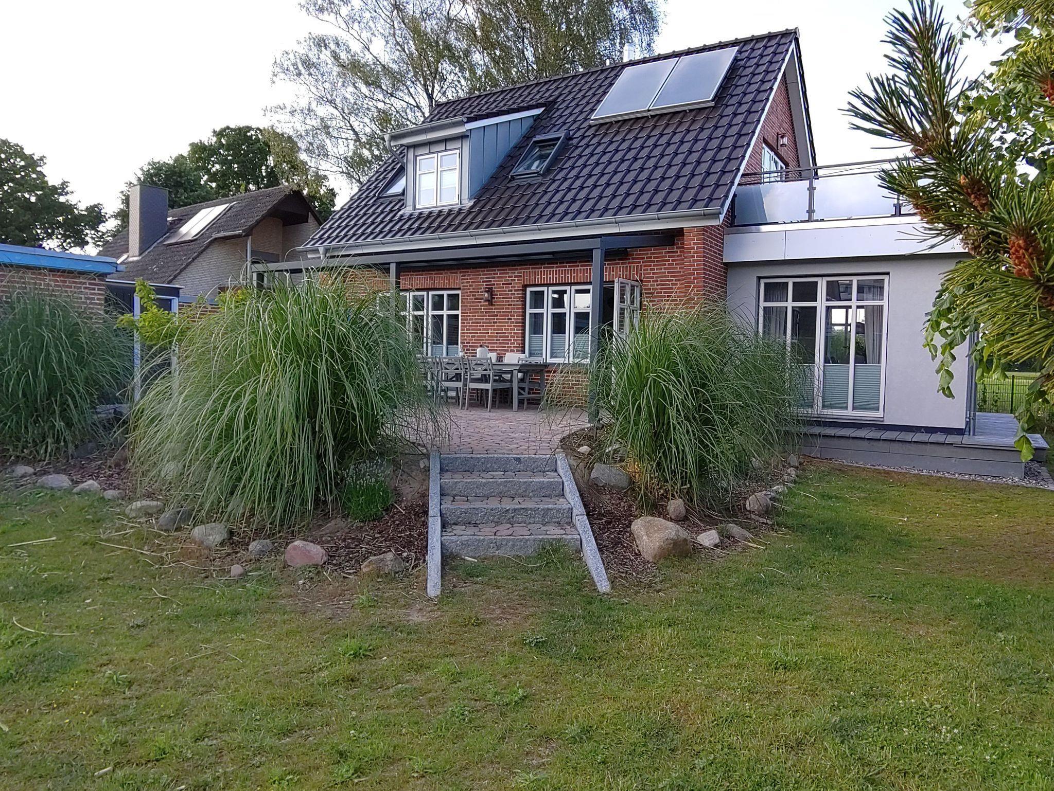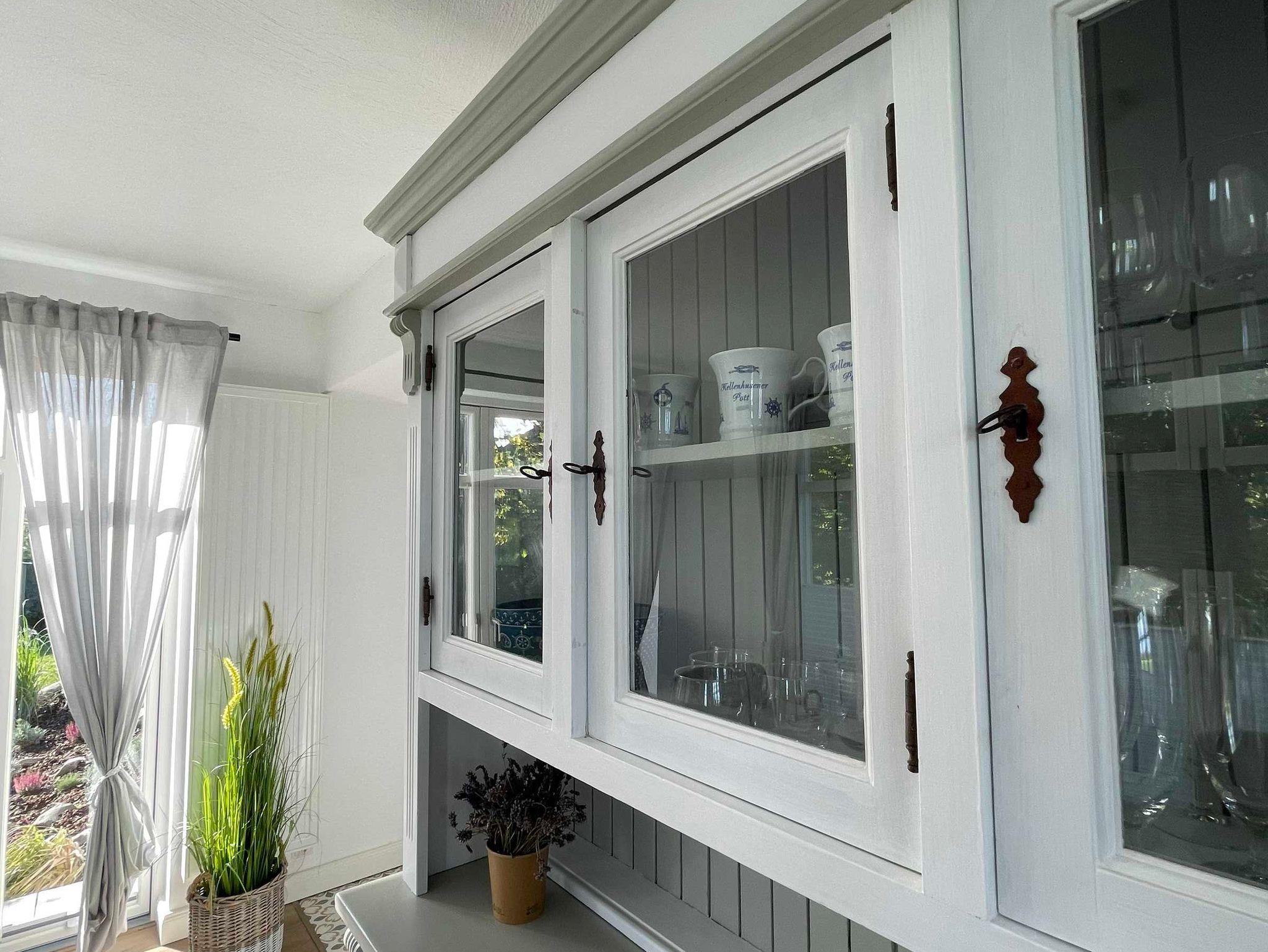Gleich nach Betreten nimmt man den Charme dieses Ferienhauses wahr. Auf rund 95 qm betritt man den freundlichen, offenen Wohnbereich, in den die komplett mit vielen modernen Geräten und Zubehör ausgestattete Küche integriert ist. Optisch getrennt, im neuen Wintergarten-Anbau mit großen Fensterfronten, befindet sich der große Esstisch für 6 Personen. Zubereitete Speisen können hier genossen werden und bei geselligem Beisammensein oder Spielen sitzt man auf den bequemen Stühlen gerne lange Zeit zusammen. Mit einem Kaffee lässt sich der Morgen auf dem vorgelagerten umlaufenden Steg gut beginnen oder der Urlaubstag dort mit einem leckeren Getränk ausklingen.