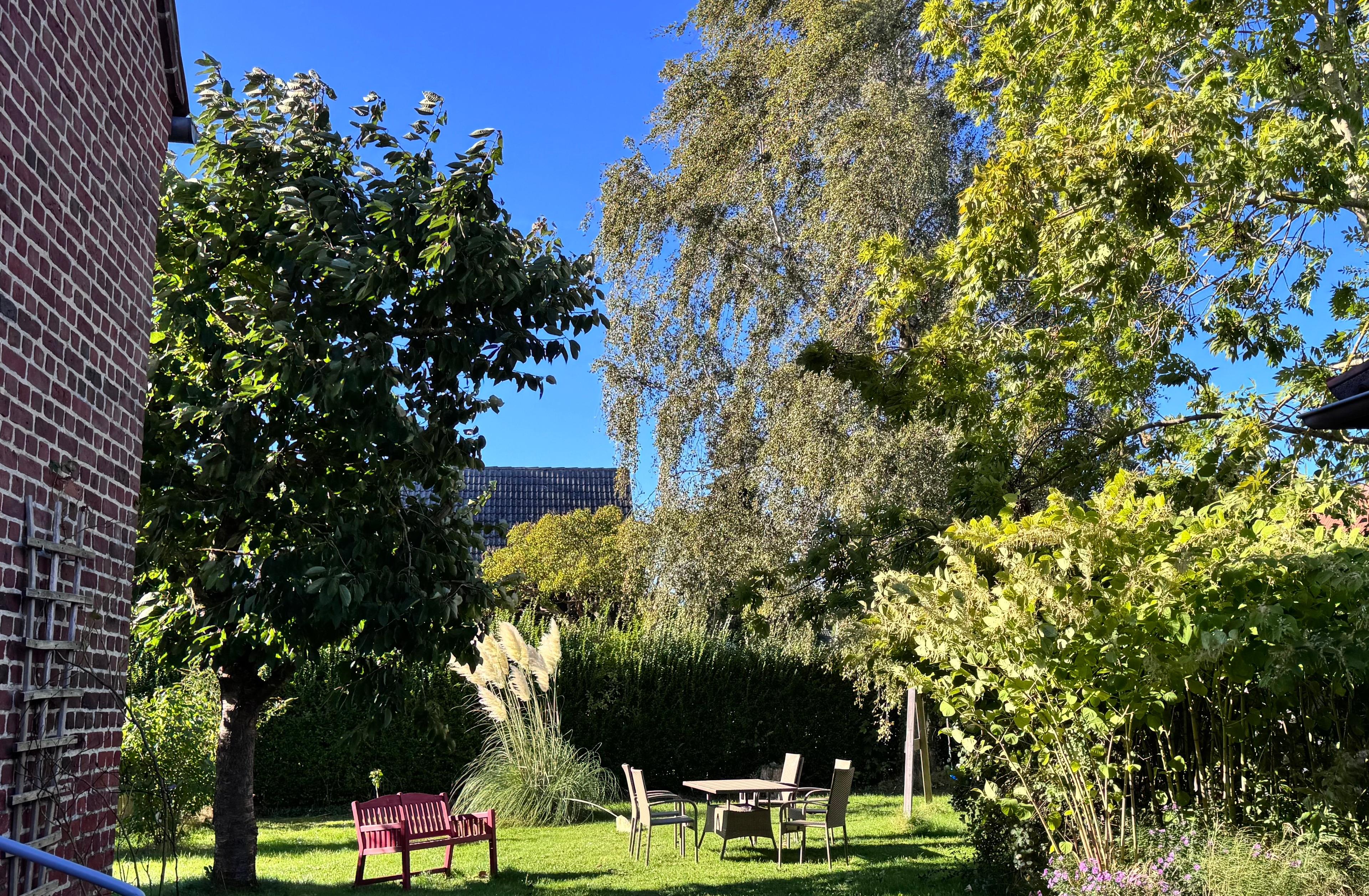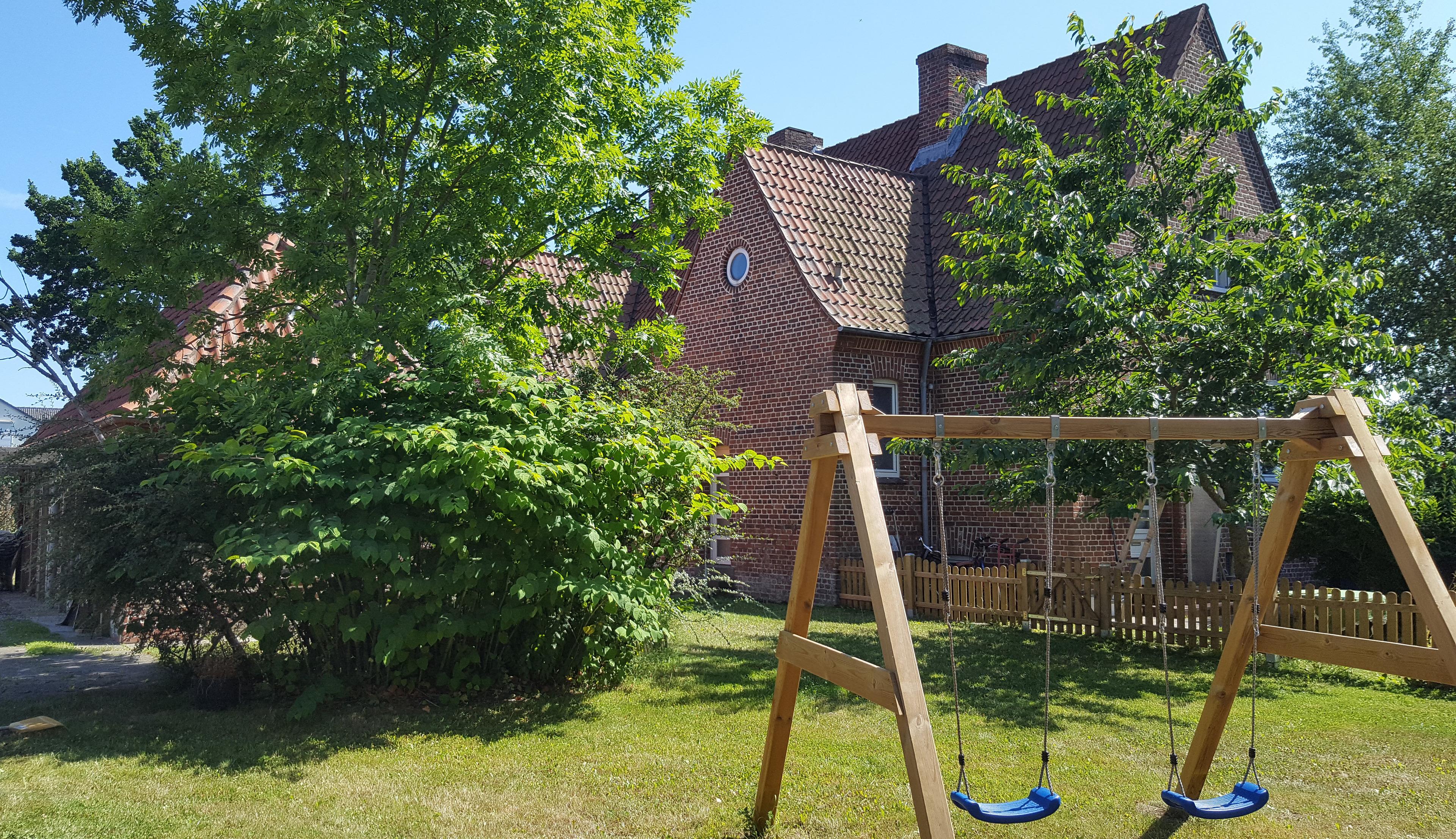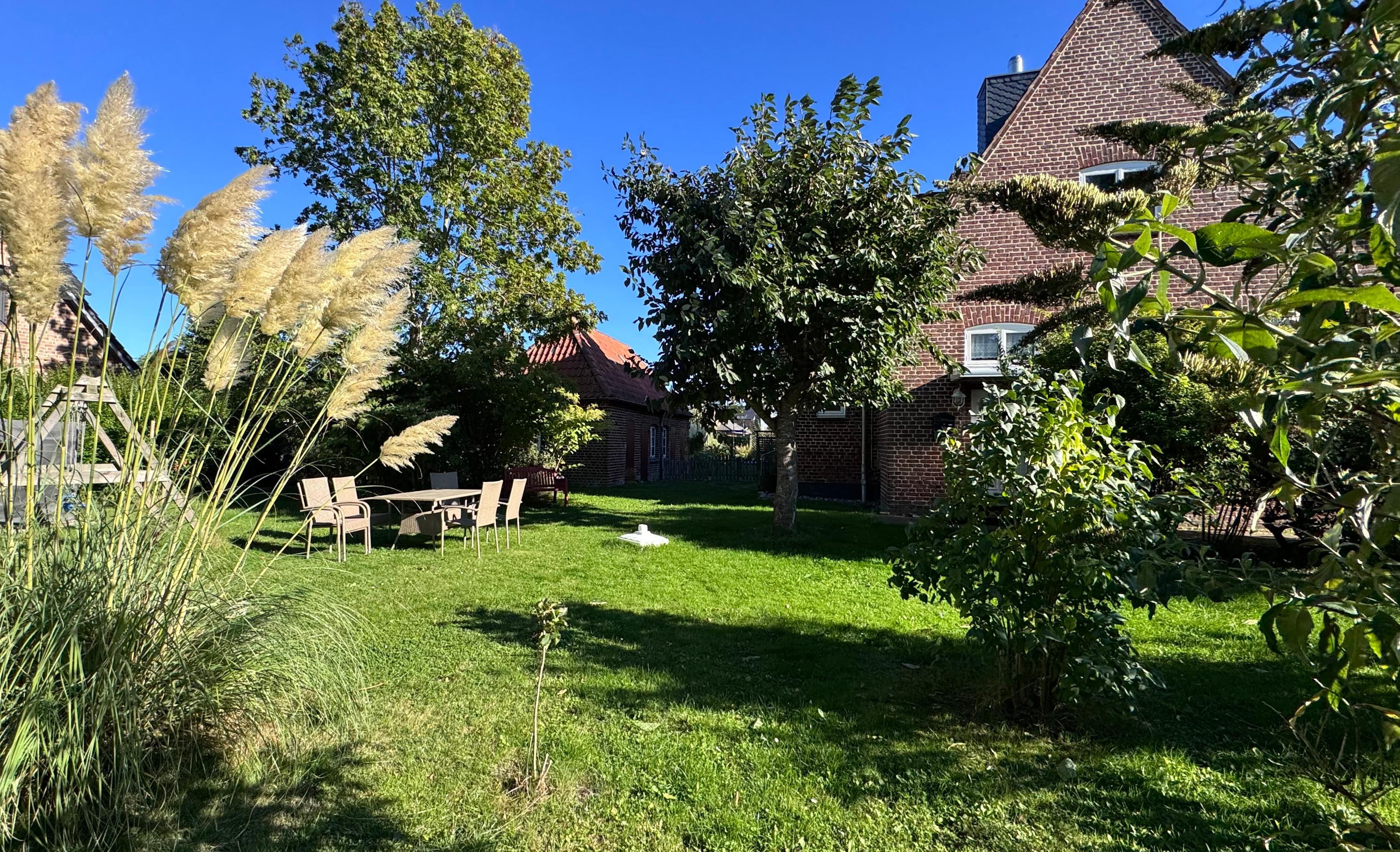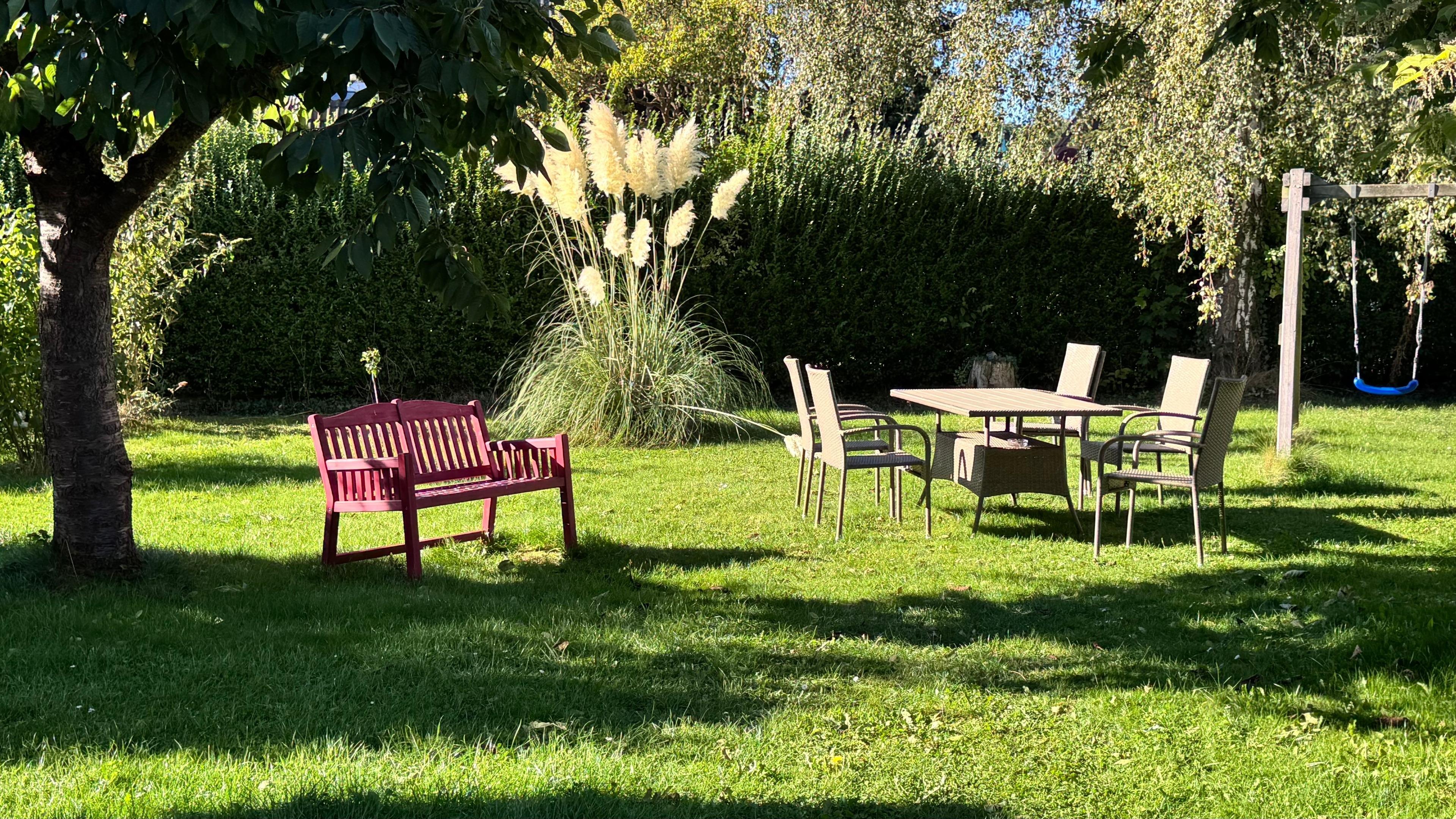 Der 700 qm große eingezäunte Garten steht zur Alleinnutzung zur Verfügung. Er bietet Sitzplätze, Tische mit bequemen Gartenstühlen, Grill, Sonnenschirm, Liegen, Strandkorb und eine Doppelschaukel für die Kinder.