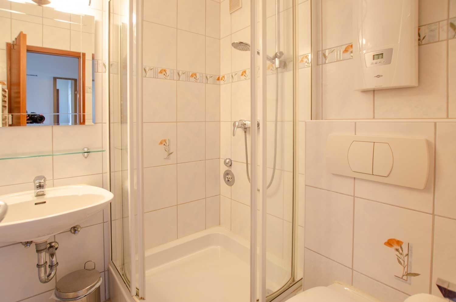 Außerdem gehören zur Ferienwohnung ein Flur mit Garderobe und Garderobenschrank, ein separates Schlafzimmer mit Doppelbett (190 x 200 cm, geschlossenes Fußende), Verdunkelungsvorhänge und Zugang zum zweiten Balkon, ein Dusch-Bad-WC sowie eine separate Küche.