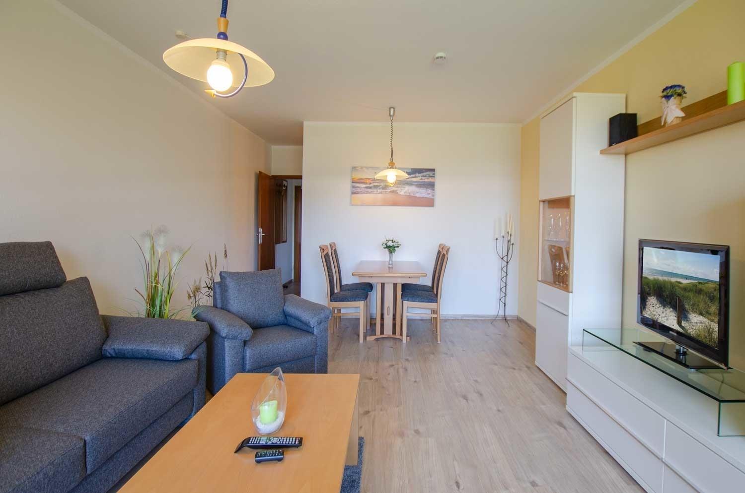 Die schöne Fewo von Familie Vaupel im Ostseebad Kellenhusen ist mit einem Wohn-Schlafraum mit Schlafsofa (160 x 200 cm), Couchtisch, TV-Möbel mit Kabel-TV und Esstisch für 4 Personen eingerichtet.