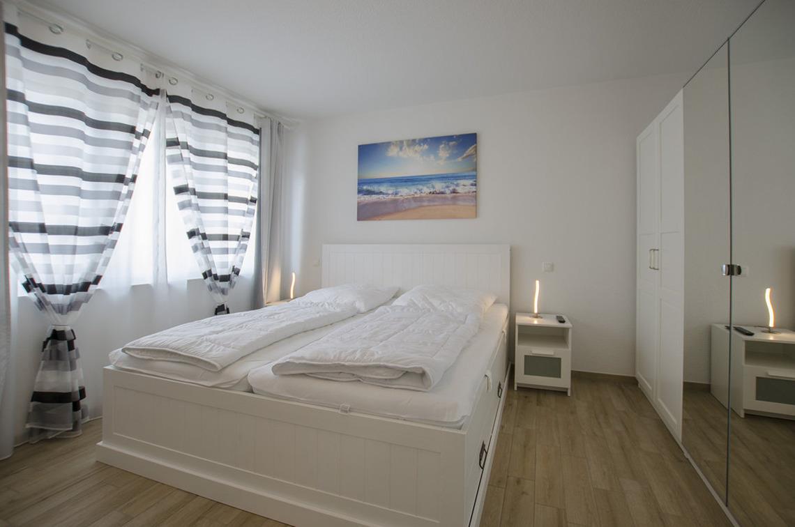 Das Schlafzimmer ist mit einem Bett 180 x 200 sowie Kleiderschränken in weiß eingerichtet.