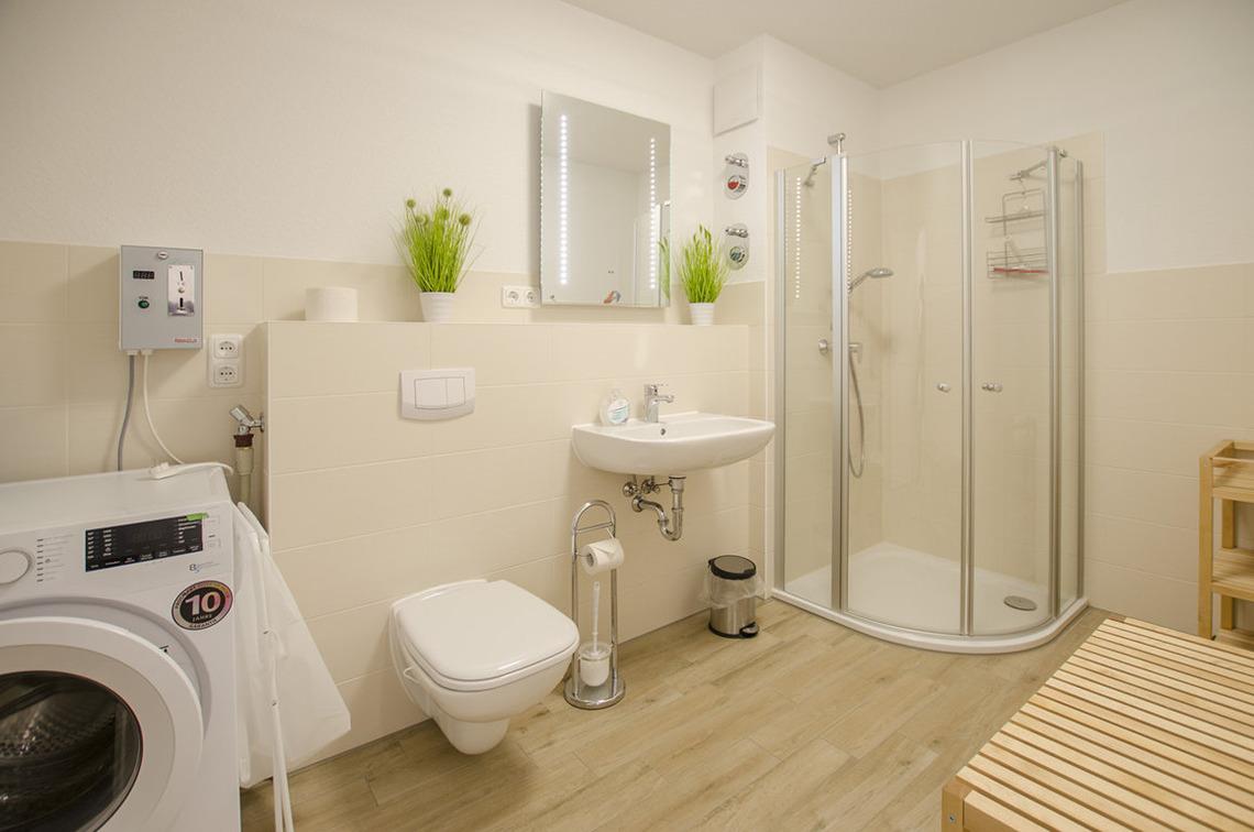Das geräumige Badezimmer ist mit Duschkabine und Waschmaschine (mit Trockner integriert) (Münzbetrieb) ausgestattet.