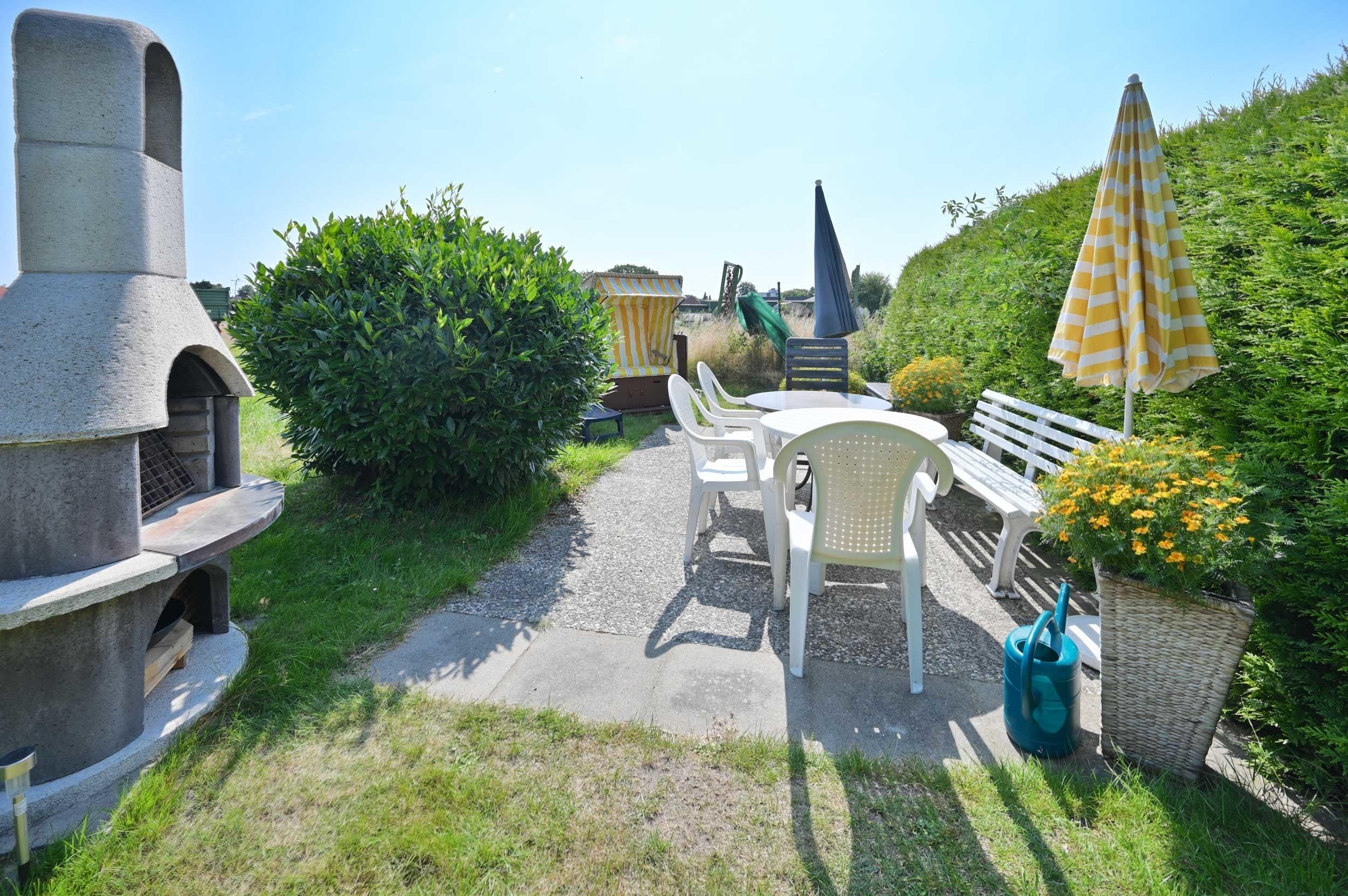 Hinter der Hecke des Parkplatzes befindet sich eine Gemeinschaftsterasse mit Sitzgruppe, Grillecke, Strandkorb und Liege.