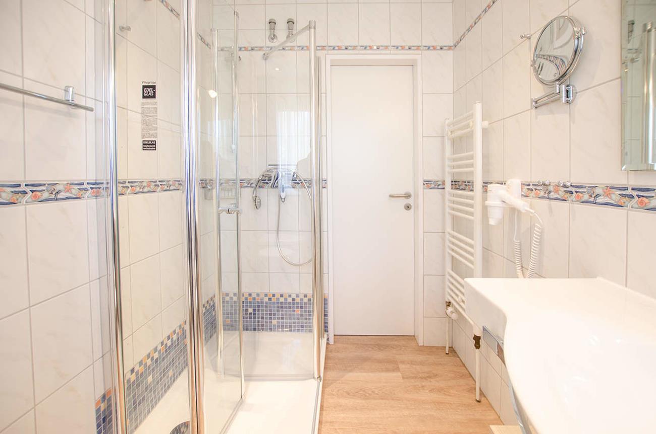 Eine Garderobe mit Ganzkörperspiegel und ein hübsches, renoviertes Bad mit Dusche und WC gehören zur Wohnung.