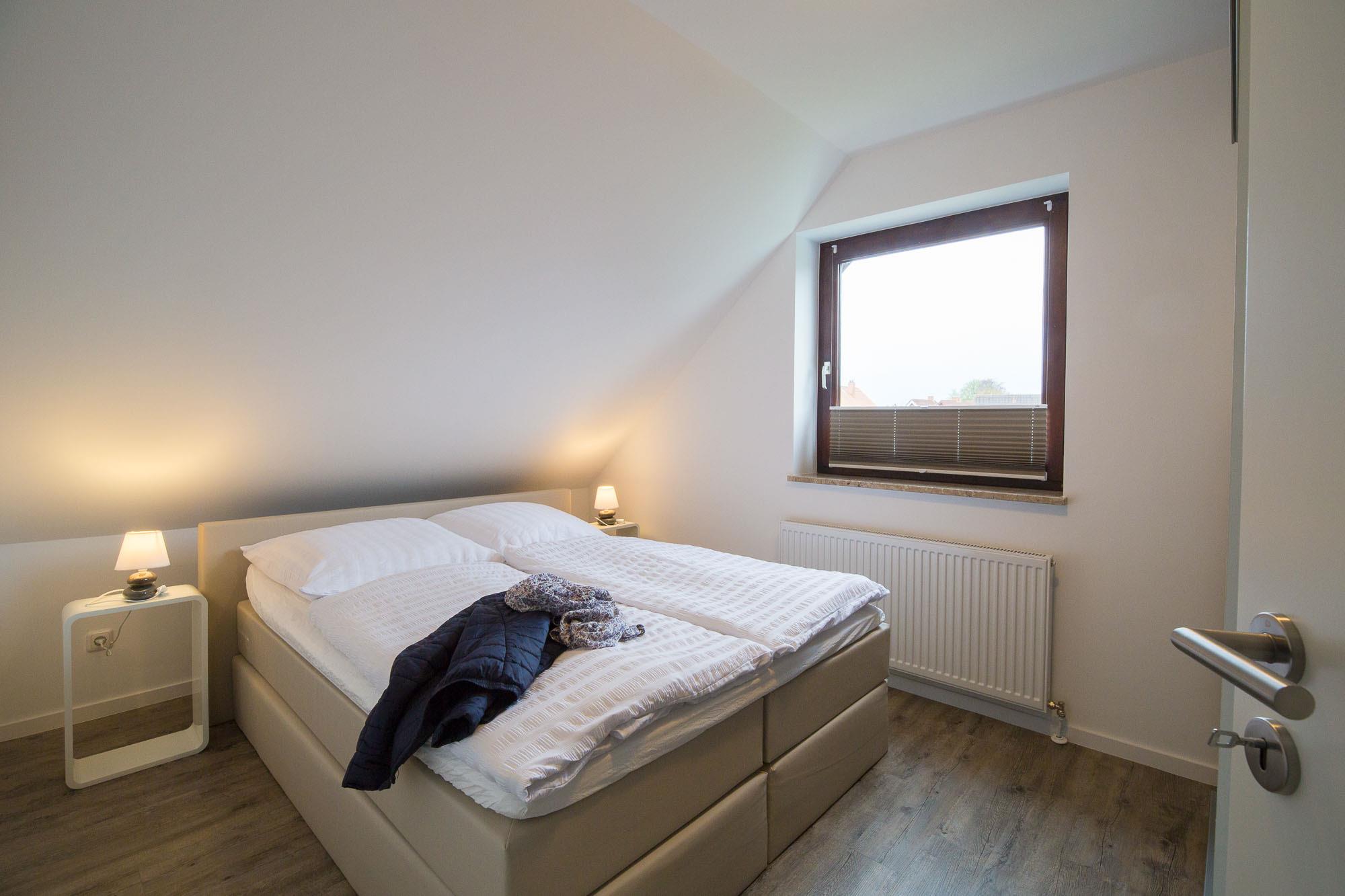 Die OG-Fewo für 2 Personen verfügt über ein Schlafzimmer mit Boxspringbett (Topperauflage: 160x200), ein Badezimmer mit DU/WC und eine offene Wohnküche (mit Geschirrspülmaschine und Backofen).