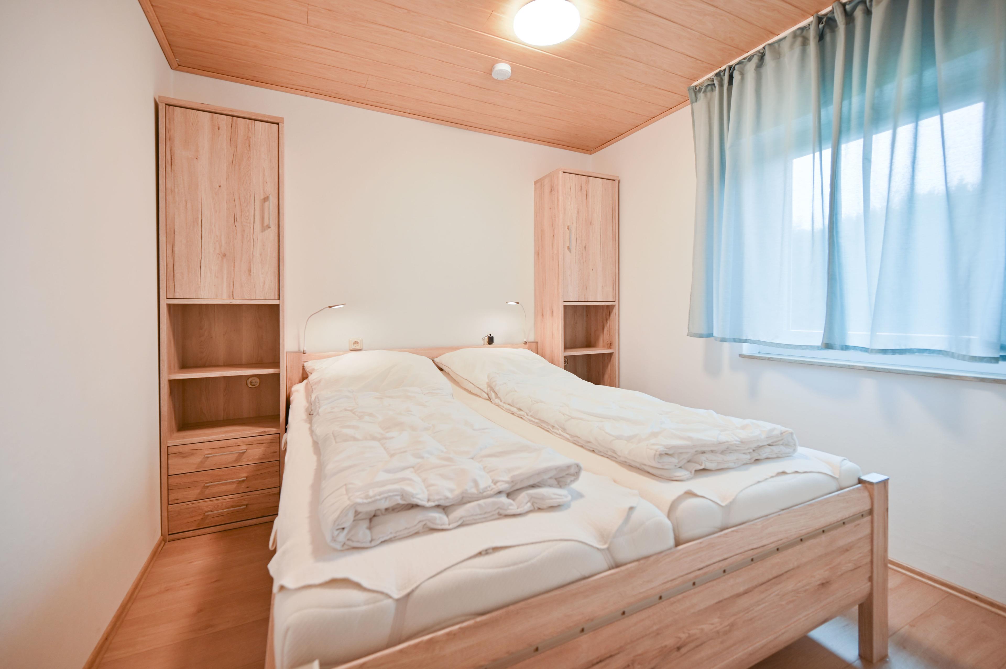 Das Schlafzimmer ist mit einem Doppelbett und einem Nacht- und Kleiderschrank ausgestattet.