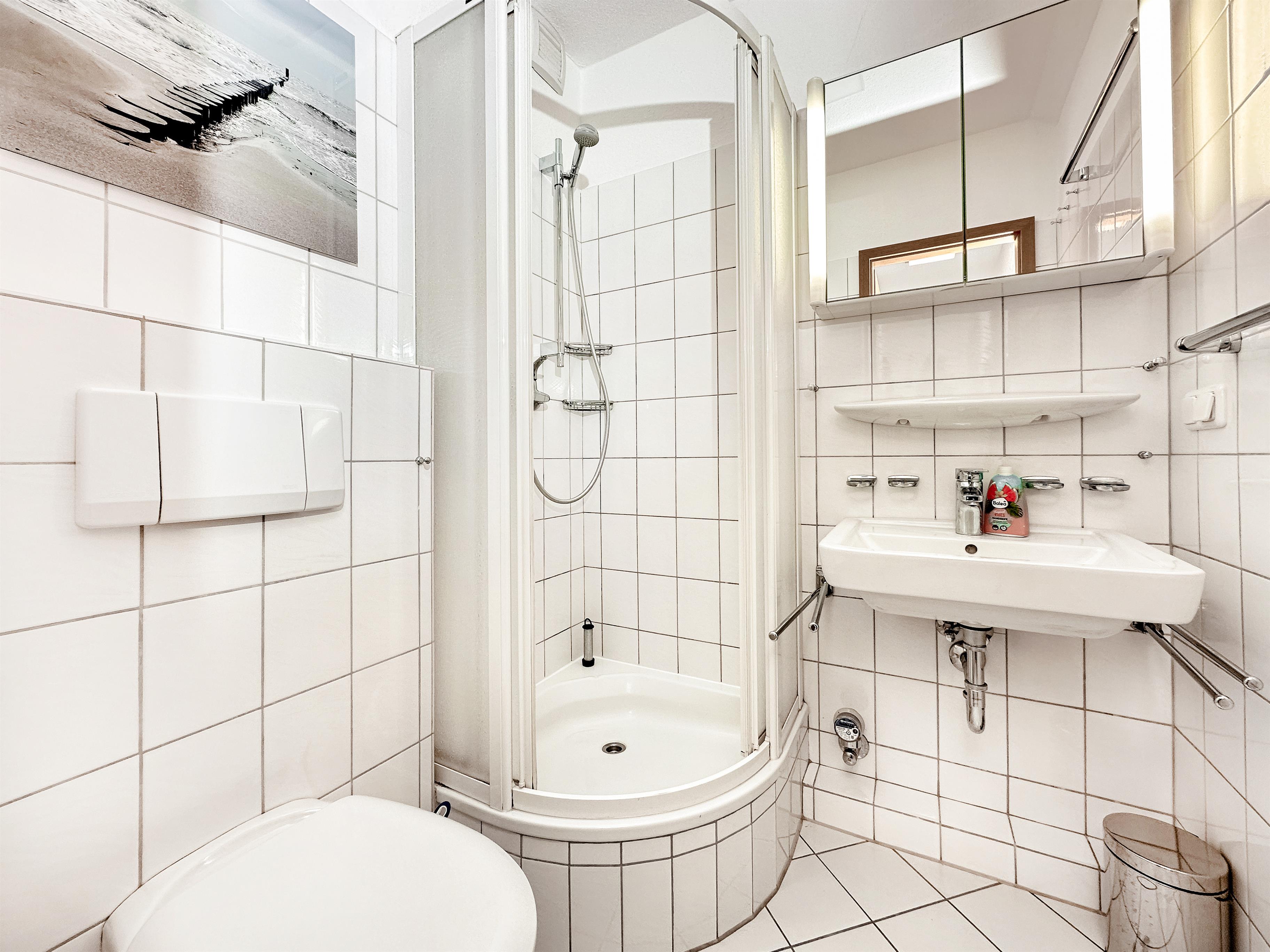 Desweiteren ist die Wohnung mit einem modernen Duschbad ausgestattet. Im Flur finden Sie eine Garderobe und einen modernen Garderobenschrank vor.
